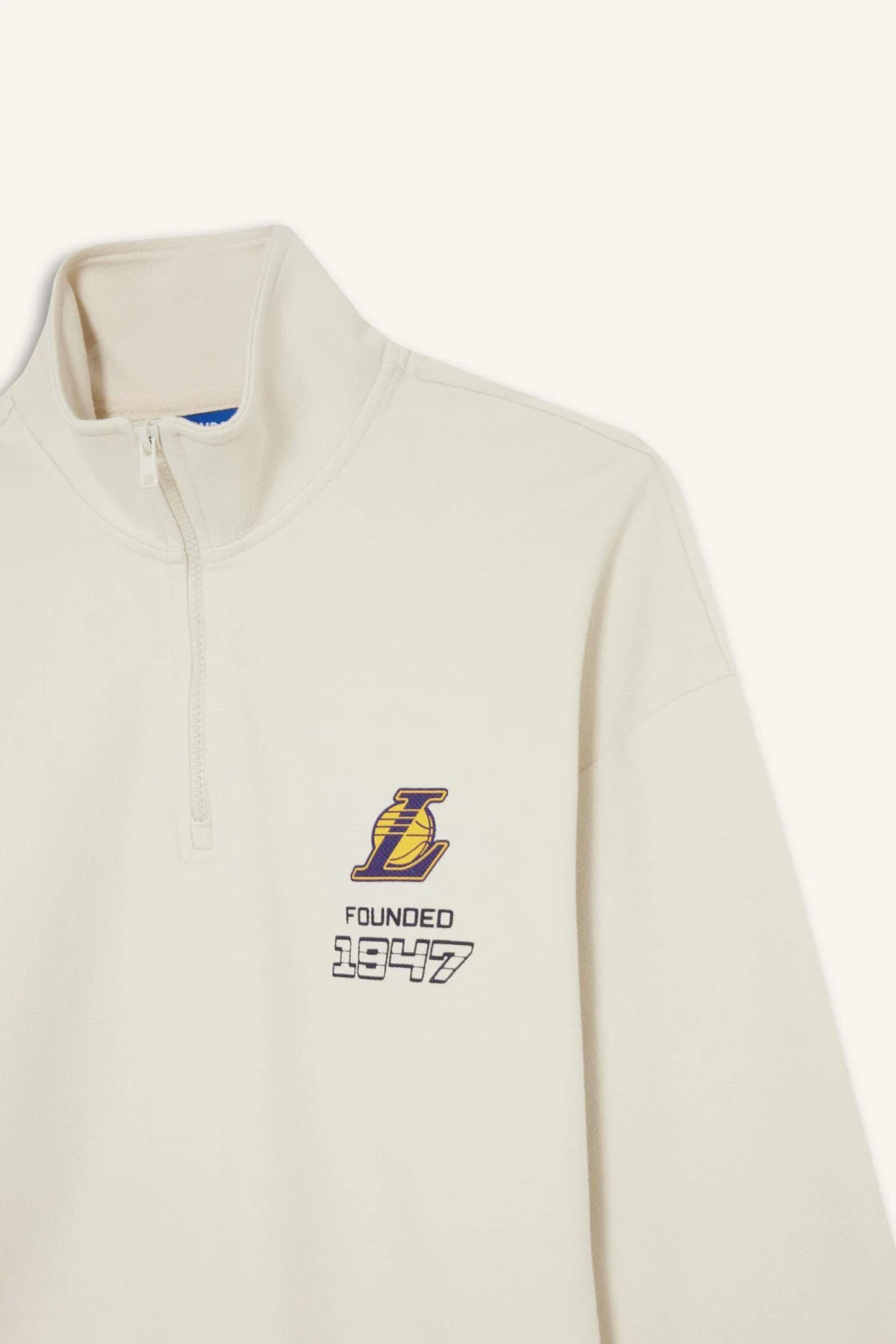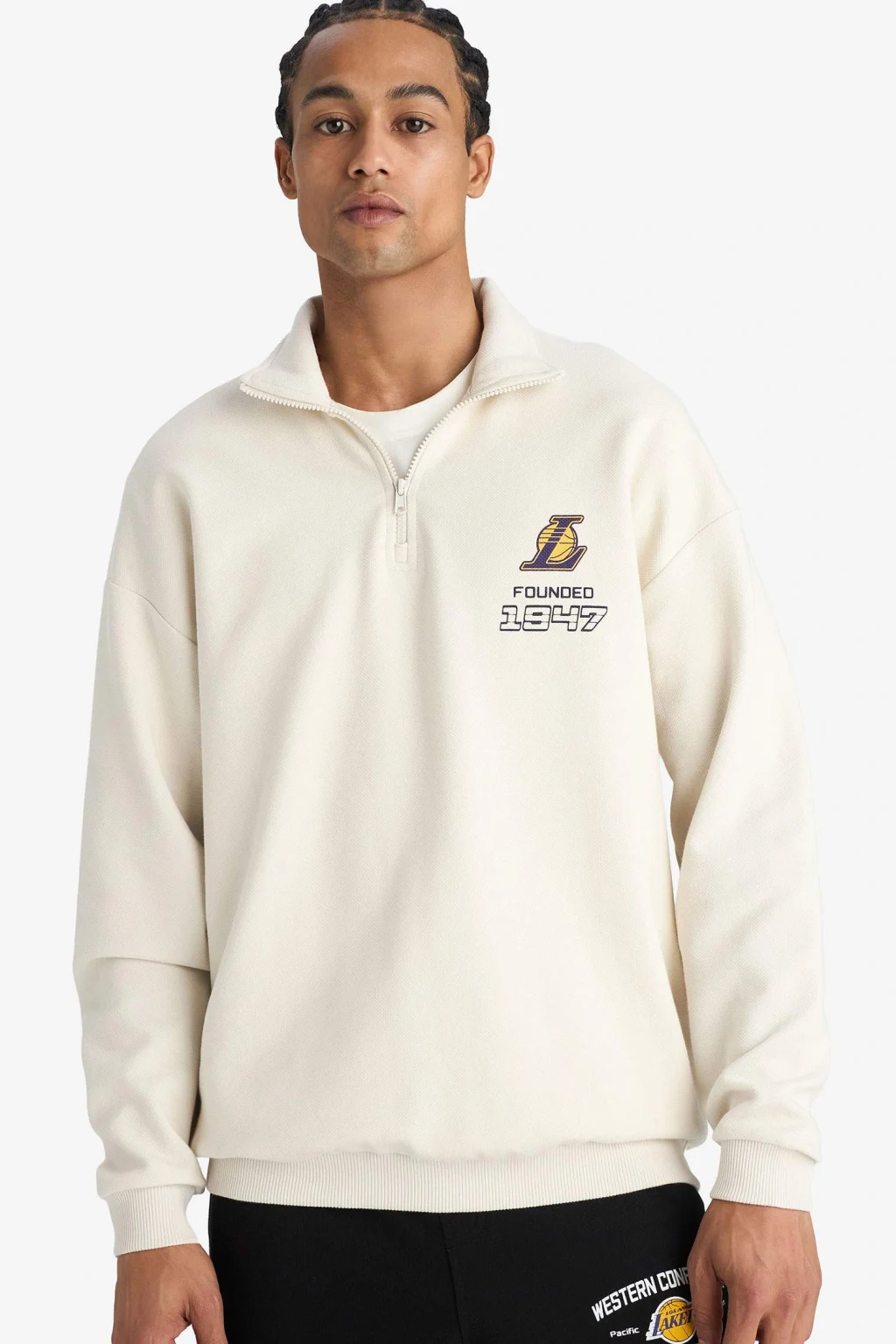 NBA Los Angeles Lakers oversize geniş kalıp dik yaka yarım fermuarlı jakarlı sweatshirt, bol kesimi ve rahat tasarımıyla gün boyu konfor sağlar. Yarım fermuar ve dik yaka detayı modern bir görünüm sunar. Jakarlı Lakers logosu ile spor kombinlere şık ve sportif bir dokunuş katar.