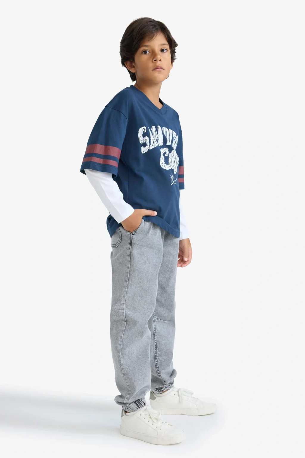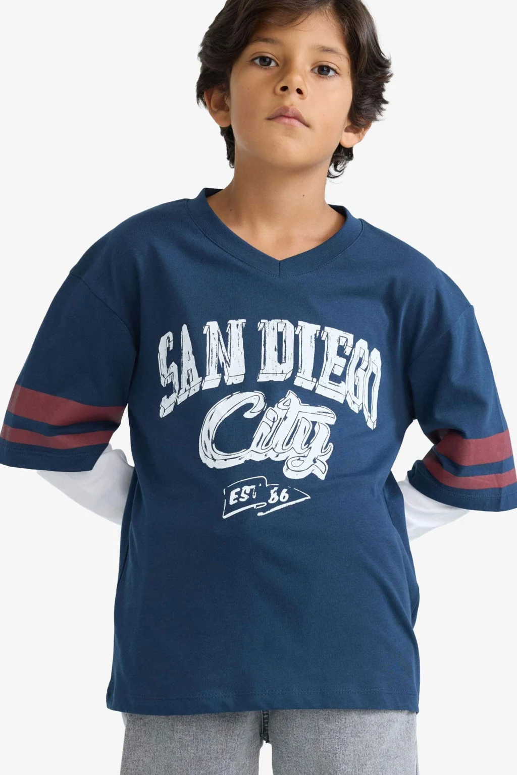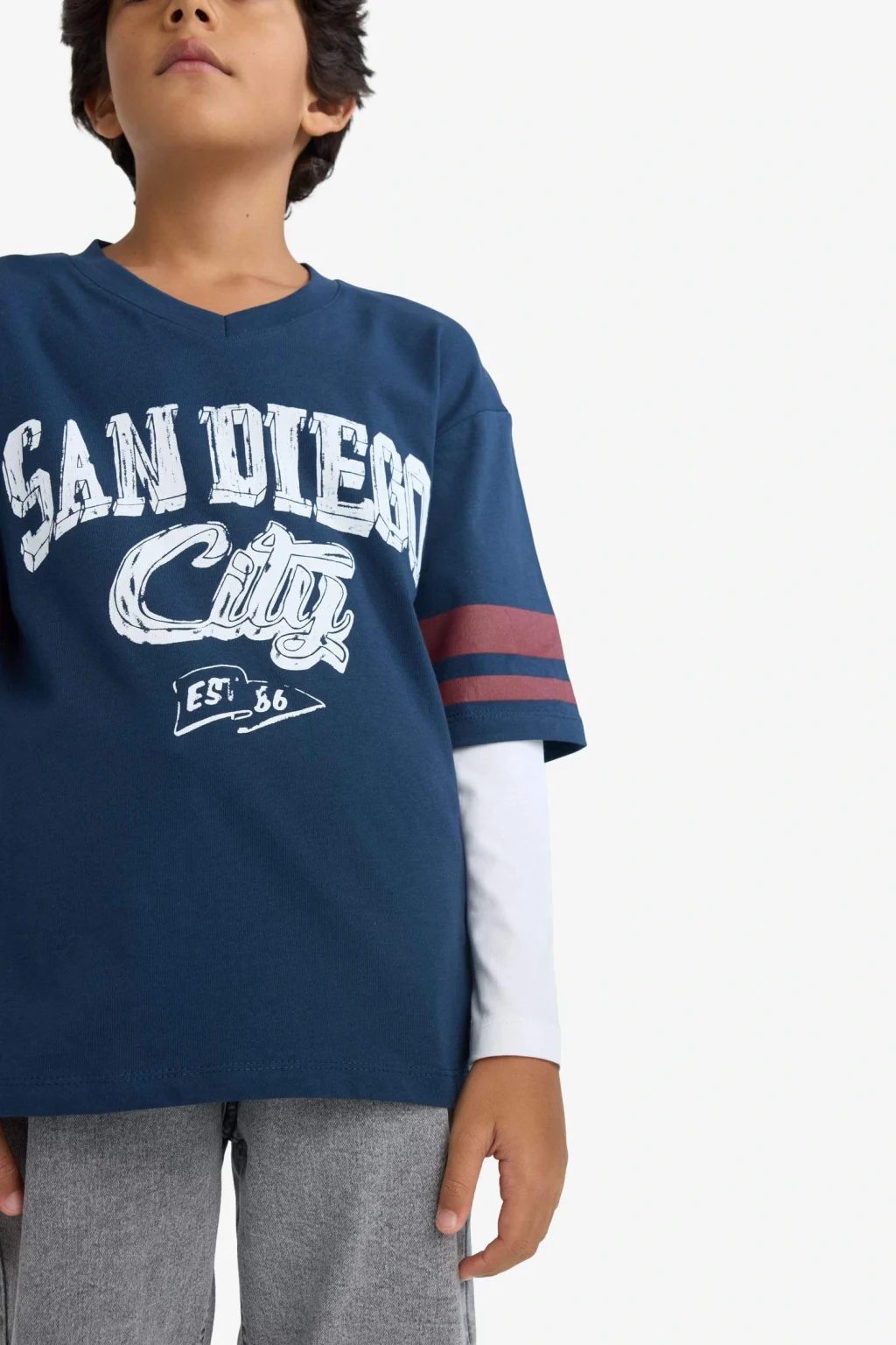 Erkek çocuk oversize geniş kalıp V yaka baskılı uzun kollu tişört, rahat kesimi ve eğlenceli baskısıyla gün boyu konfor ve stil sunar. Yumuşak kumaşı sayesinde hareket özgürlüğü sağlar.