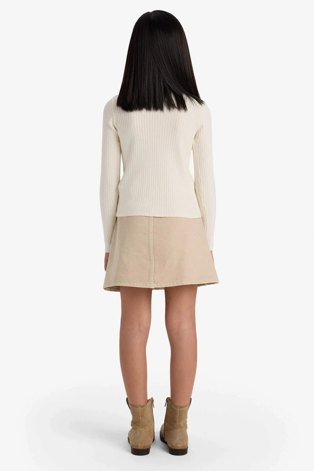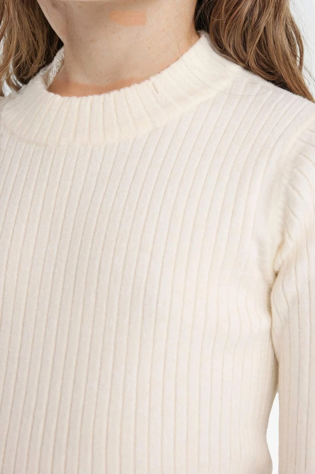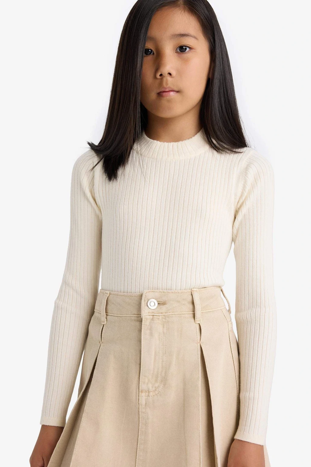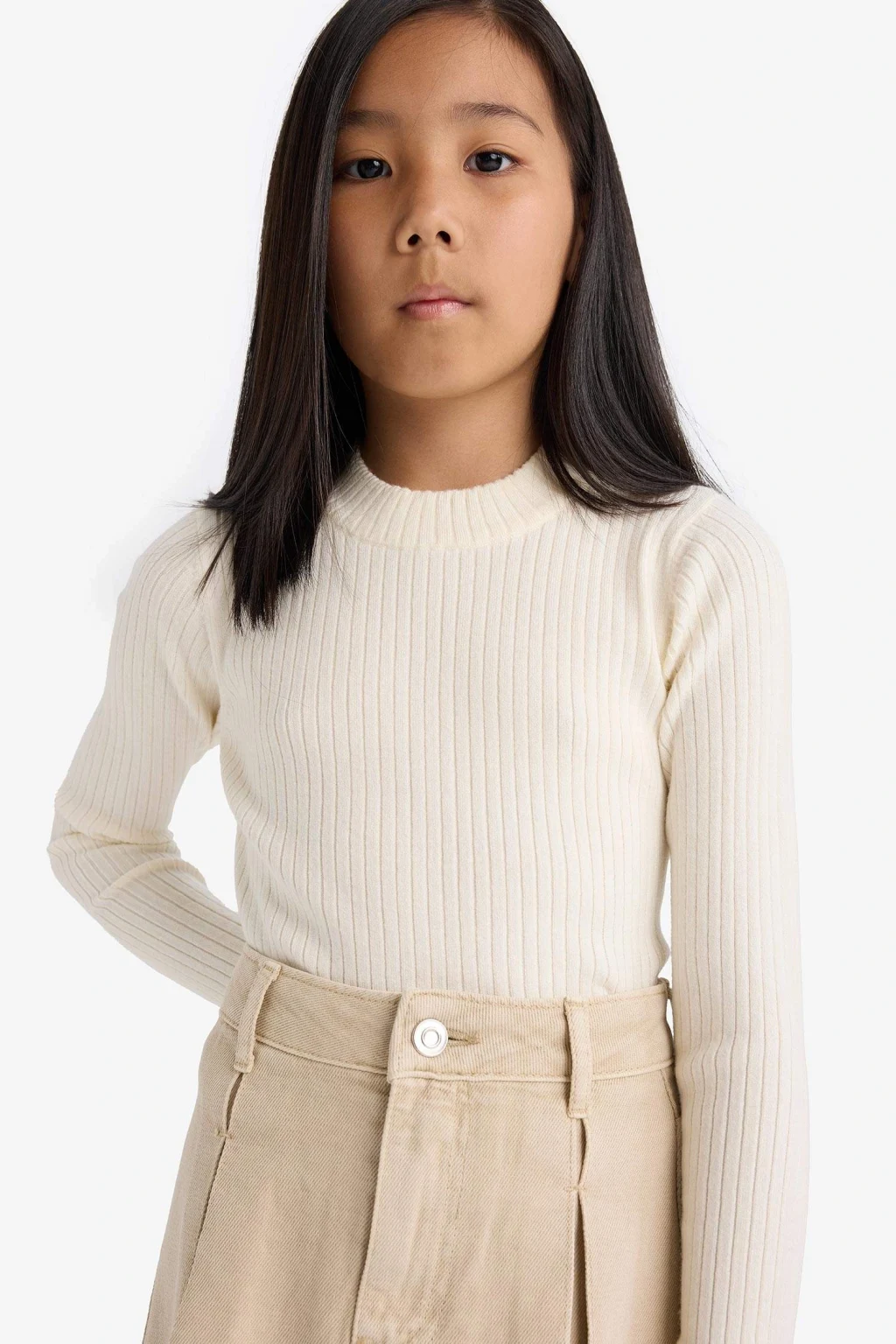 Vücuda oturan fitted kesimi ve bisiklet yaka tasarımıyla bu ribana kazak, kız çocuklarının rahatlığı ve şıklığını bir arada sunar. Esnek dokusuyla hareket kolaylığı sağlayan ideal bir günlük giysi.