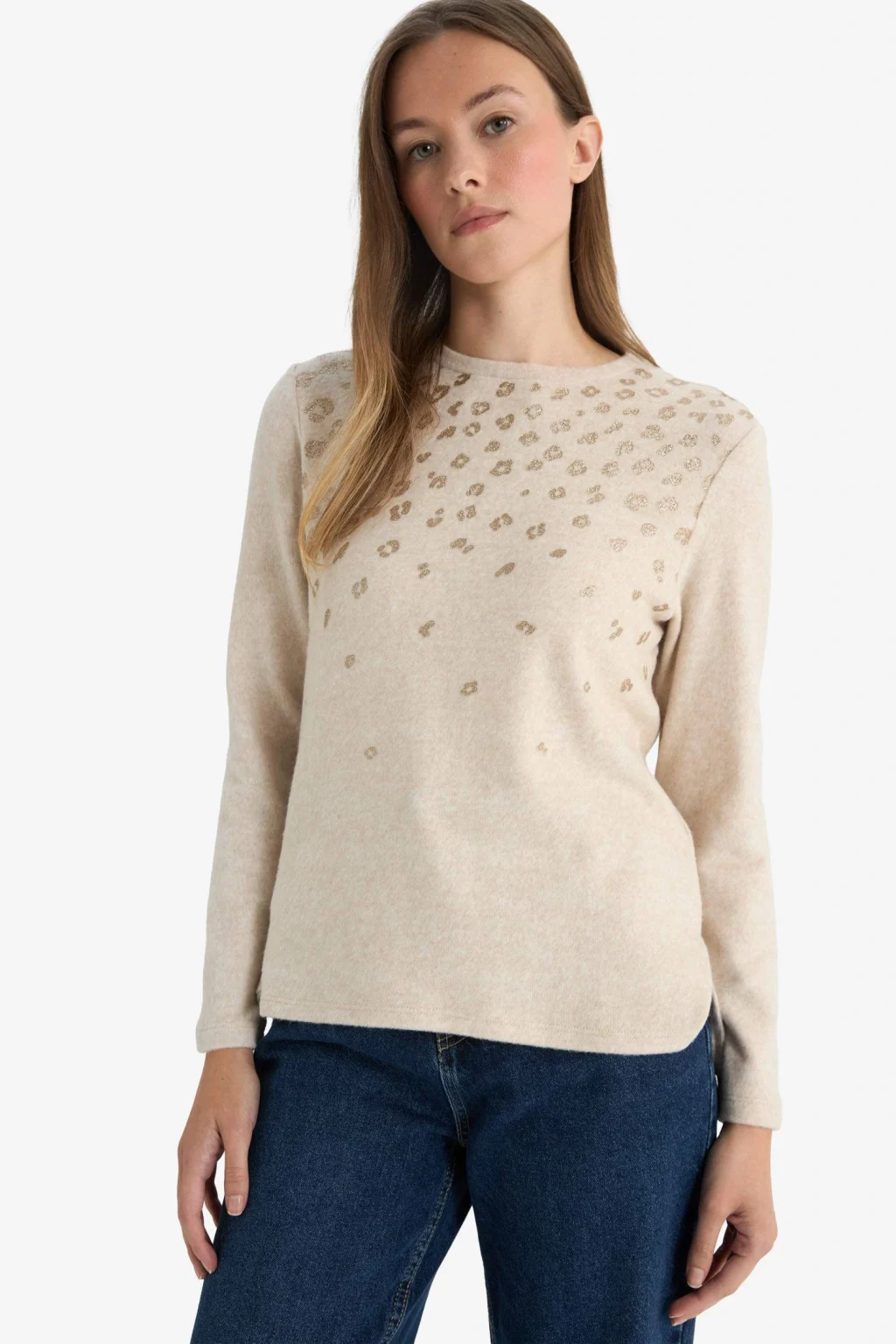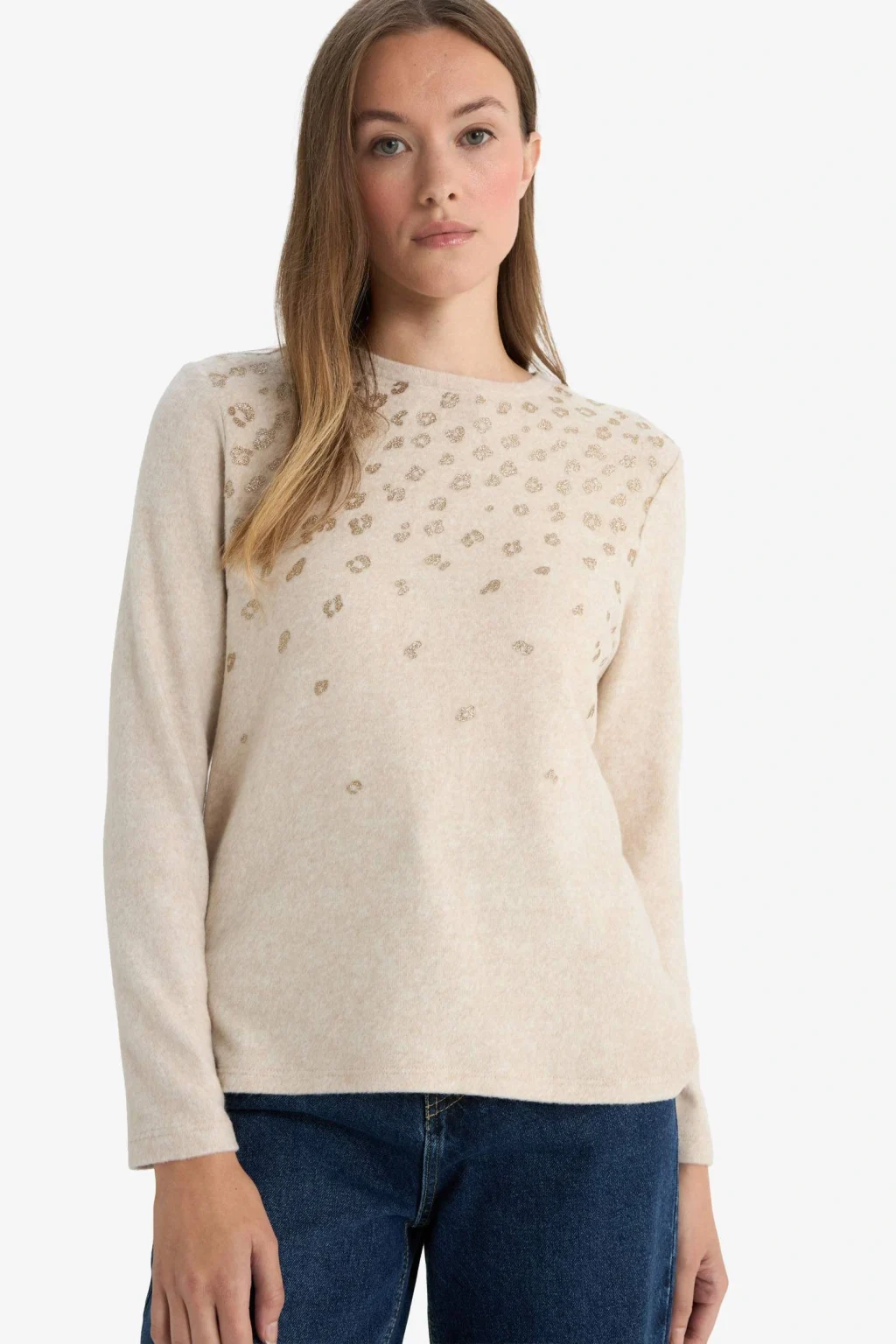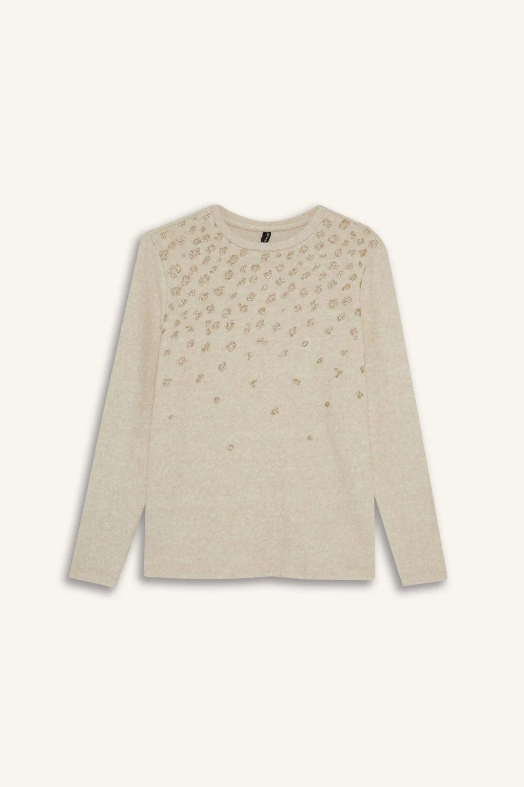 Regular fit kesimi ve şık taş detaylarıyla öne çıkan bu uzun kollu tişört, bisiklet yaka tasarımıyla günlük stilinize zarif bir dokunuş katar. Rahat kumaşıyla konforlu bir kullanım sunar.
