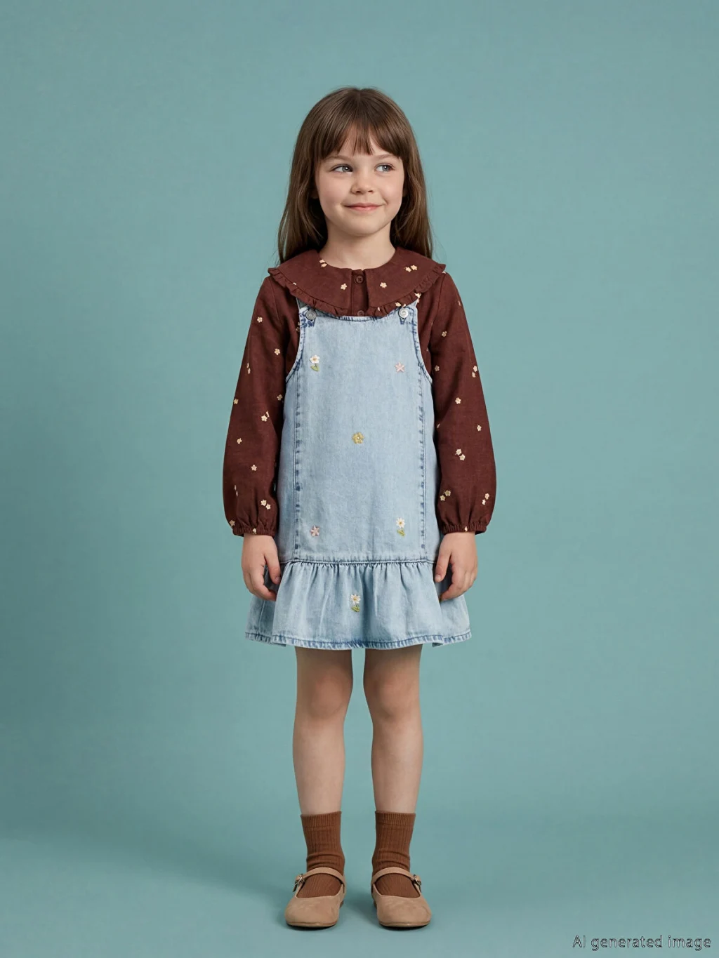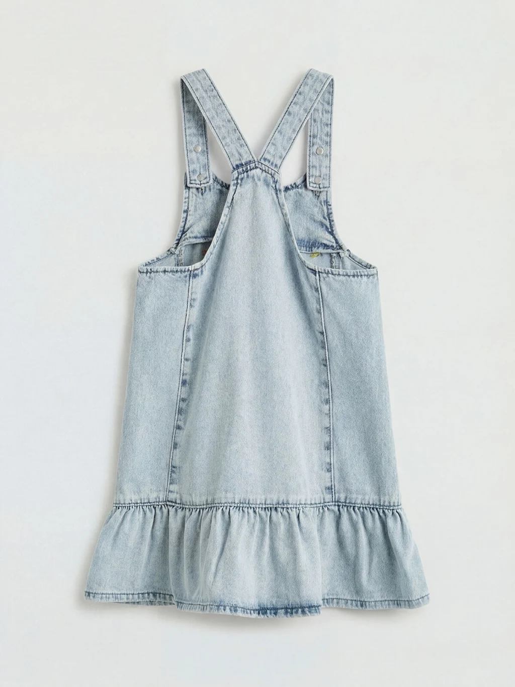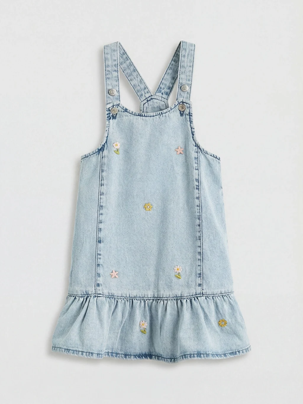 Ayarlanabilir askılı, nakış detaylı ve etek ucu volanlı kız çocuk elbise, %100 pamuk kumaştan üretilmiştir.
