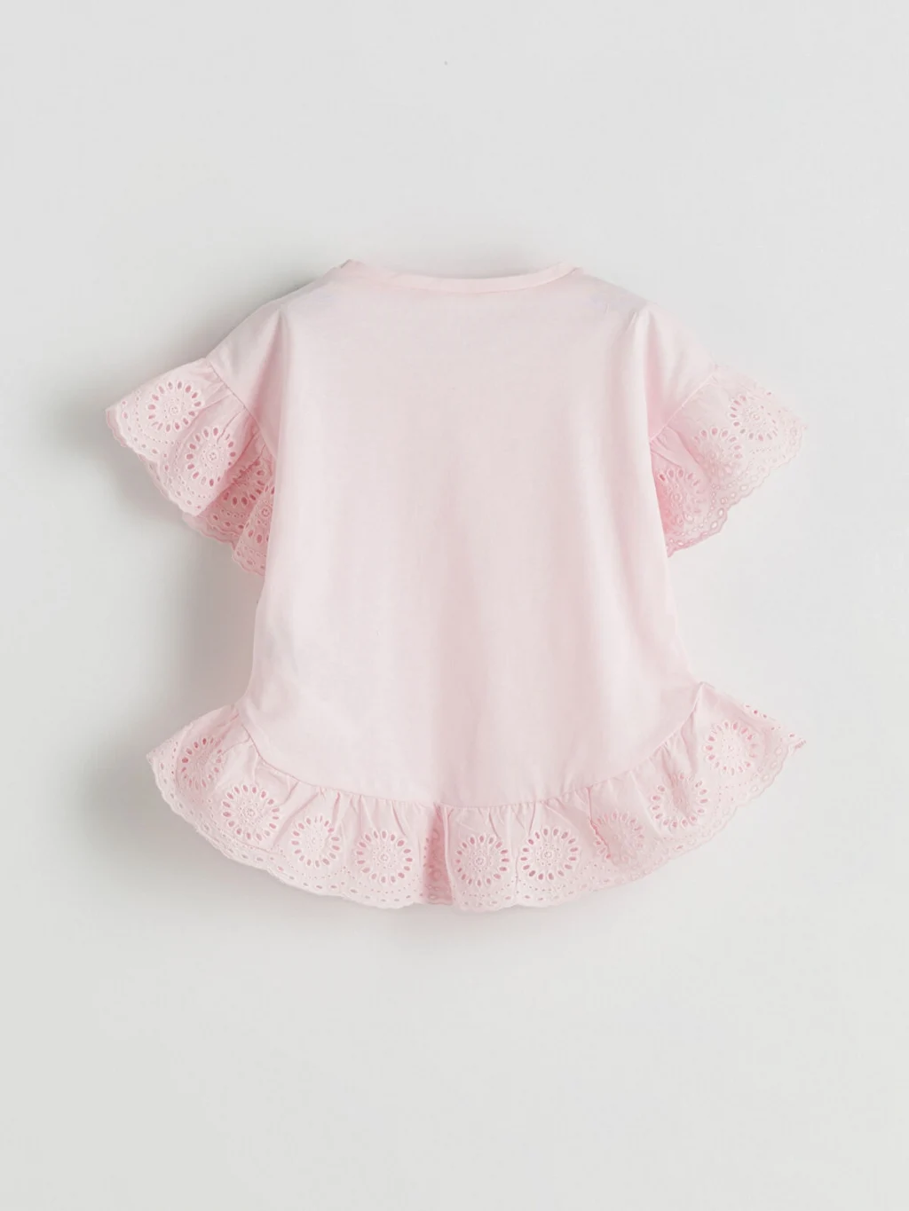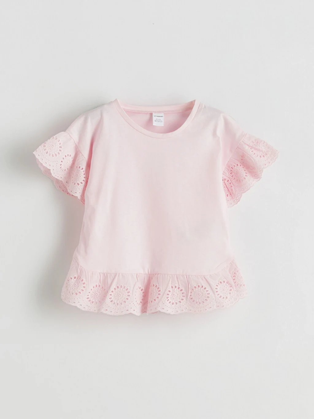 Bisiklet yaka kız çocuk tişört, %100 pamuklu penye kumaştan üretilmiştir. Kısa kolları ve etek ucu volanlı ve brode detaylıdır.