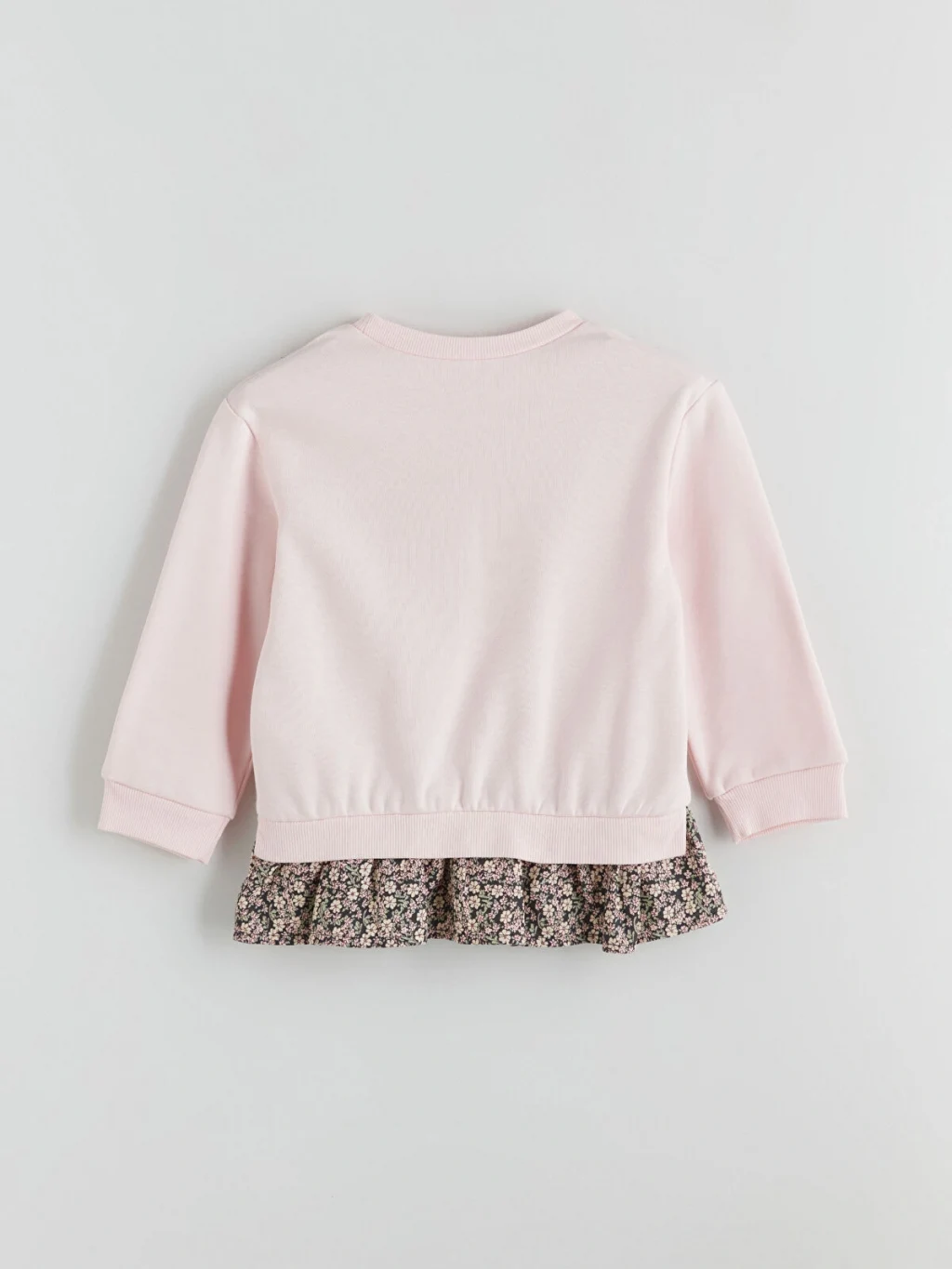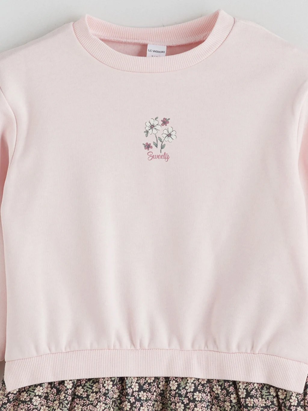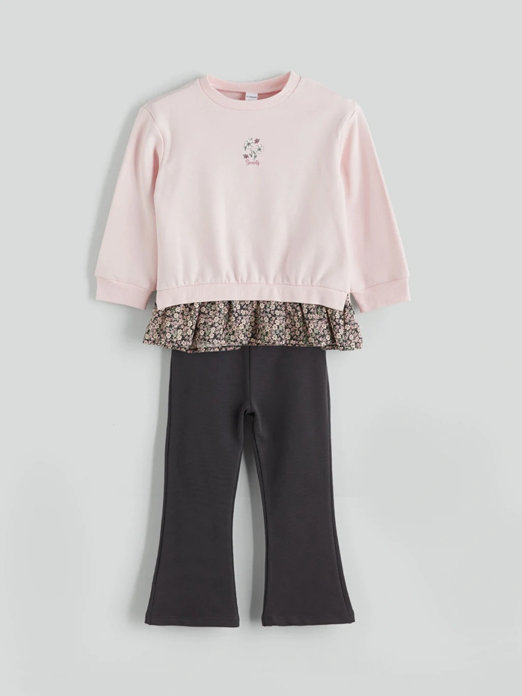 Kız çocuk takım, pamuk karışımlı 3 iplik şardonlu kumaştan üretilmiş, nakışlı, tütü detaylı sweatshirt ve İspanyol paça pantolondan oluşur.