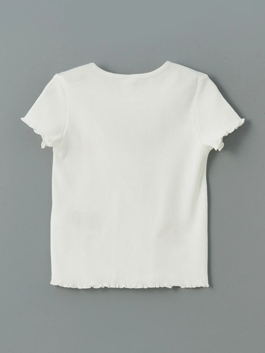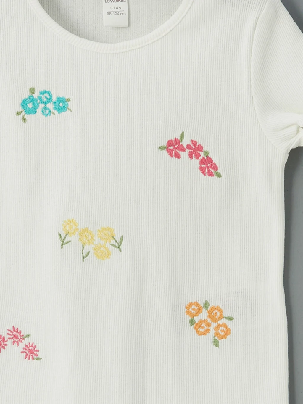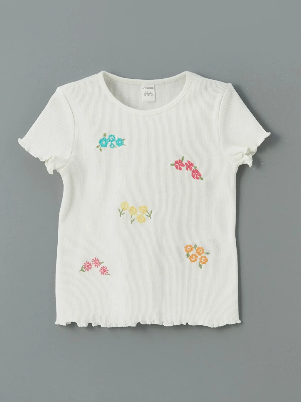 Yüksek pamuk içerikli penye kumaştan üretilen dar kalıp kız çocuk tişört, bisiklet yakalı ve kısa kolludur. Önü çiçek işlemeli, kol ve etek uçları fırfırlıdır.