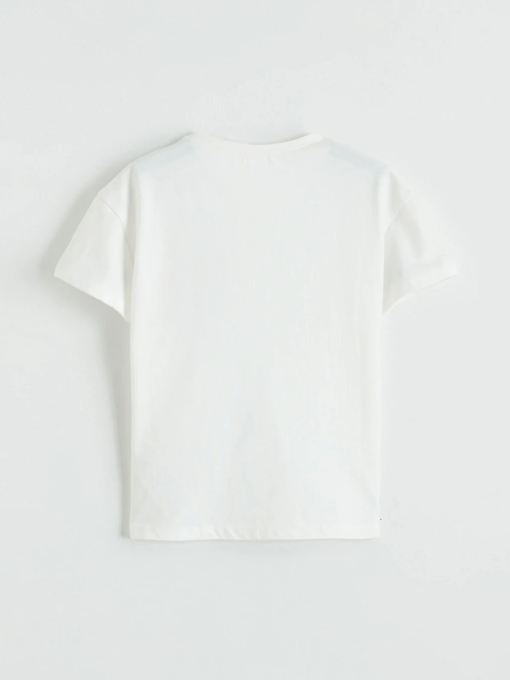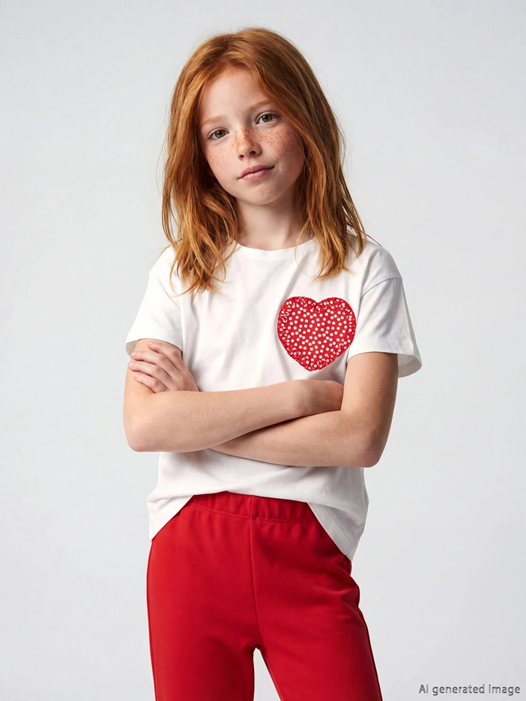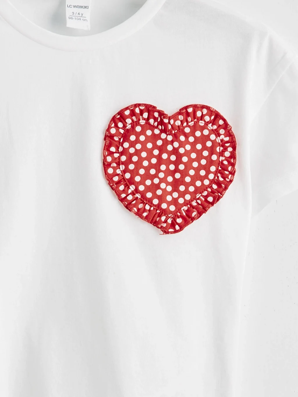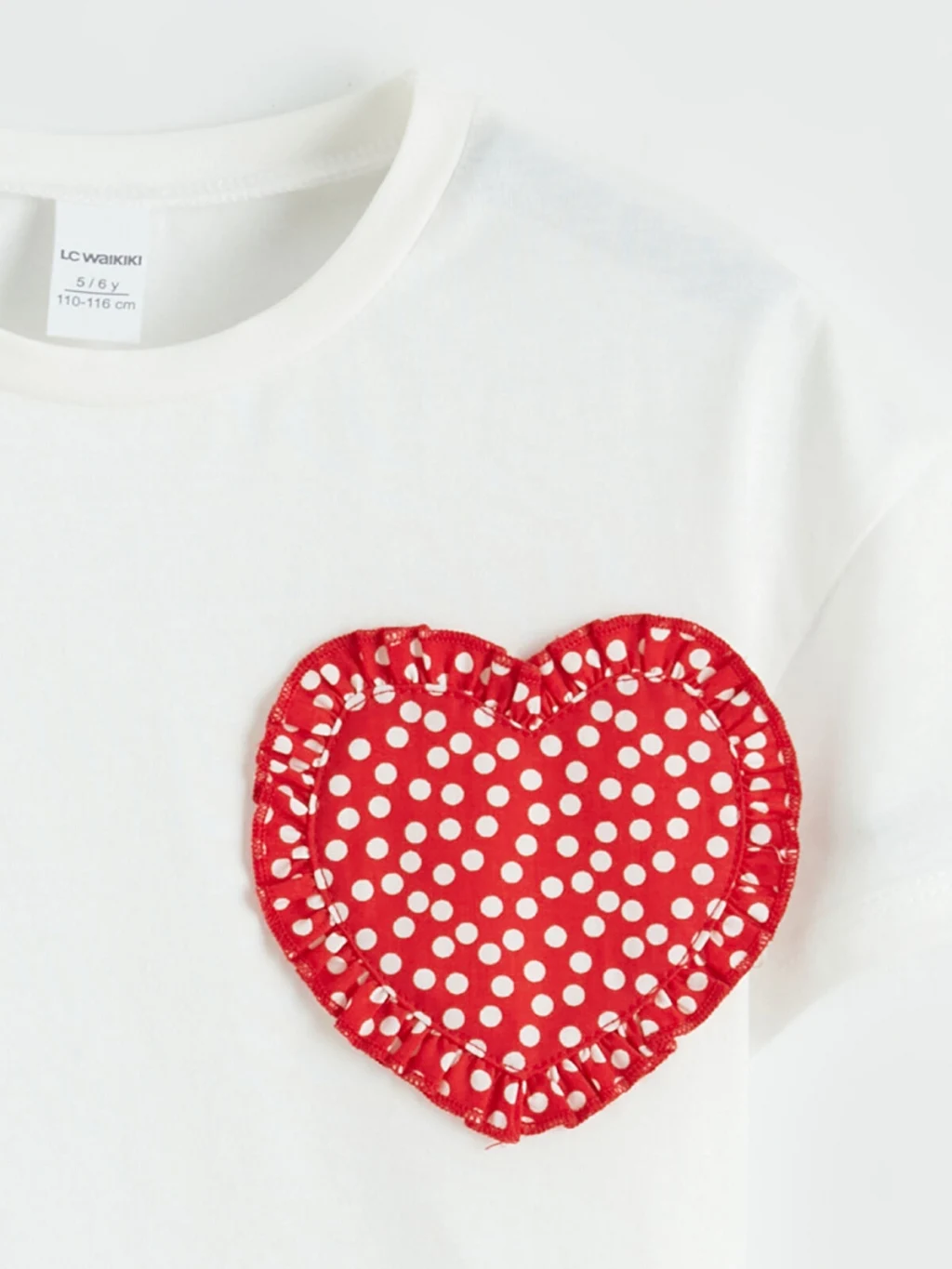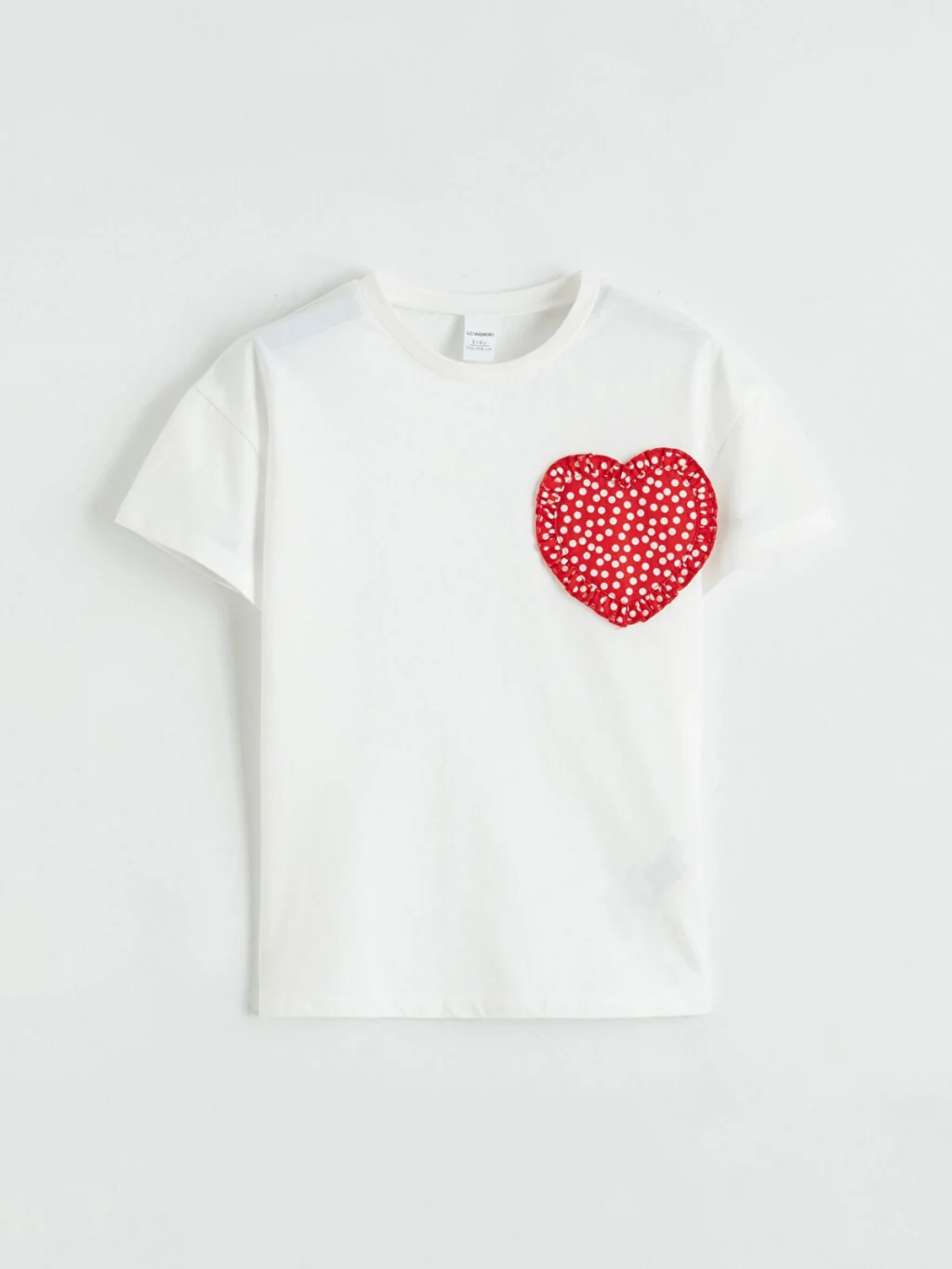Bisiklet yaka ve kısa kollu kız çocuk tişört, penye kumaştan üretilmiştir ve önünde fırfırlı, kalp şeklinde nakış detayı bulunur.