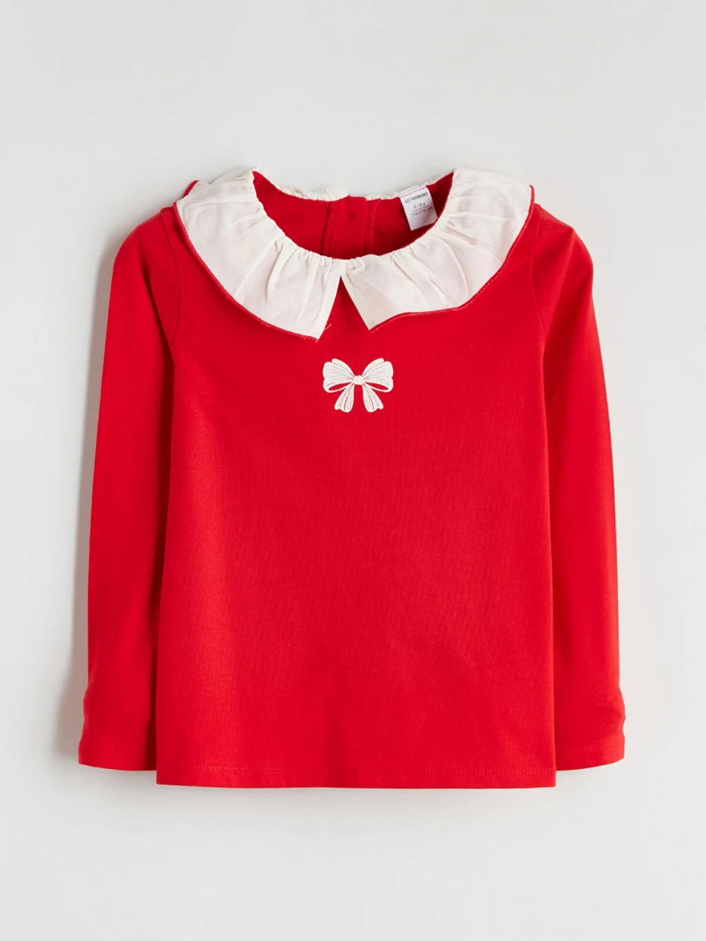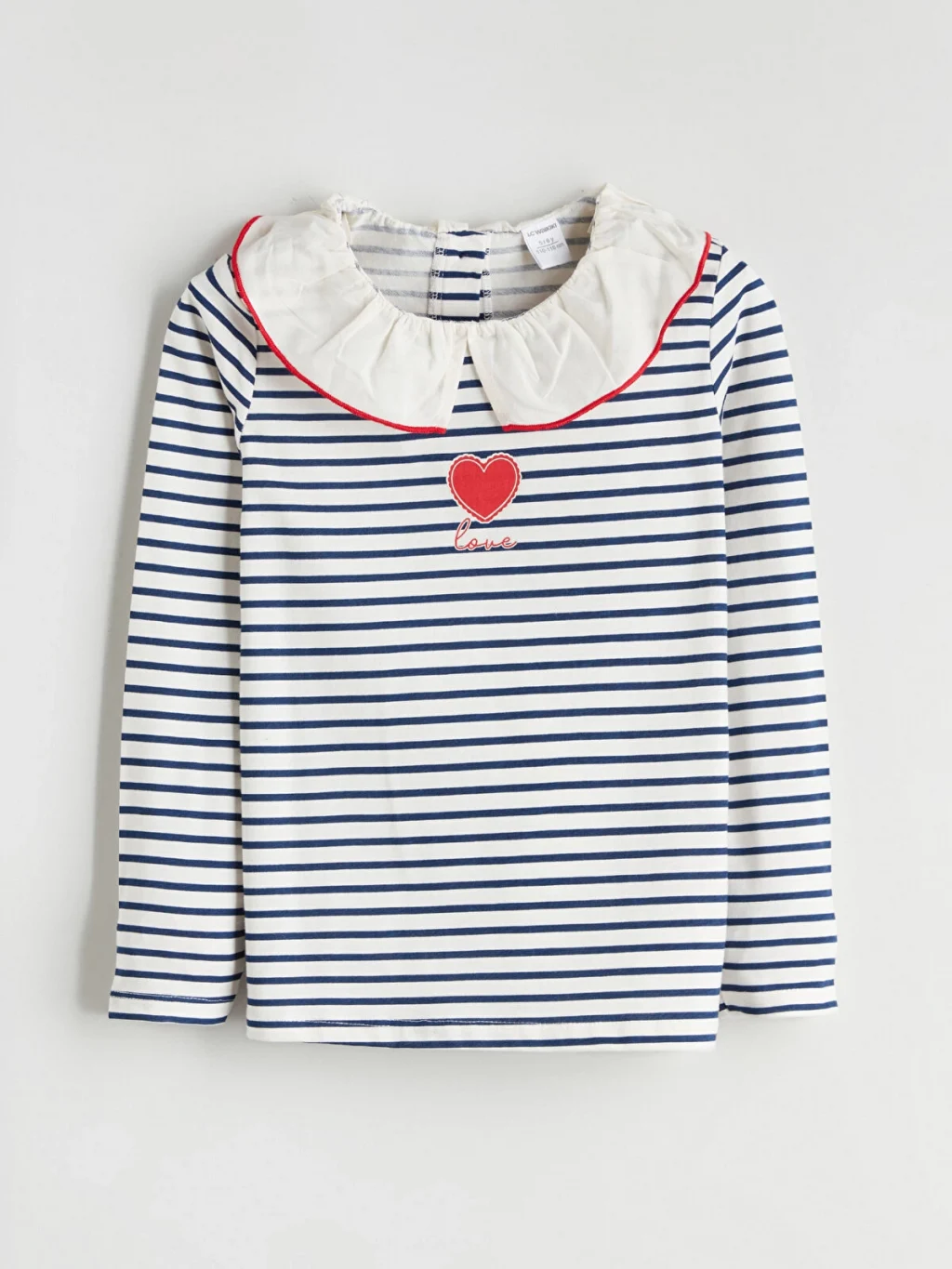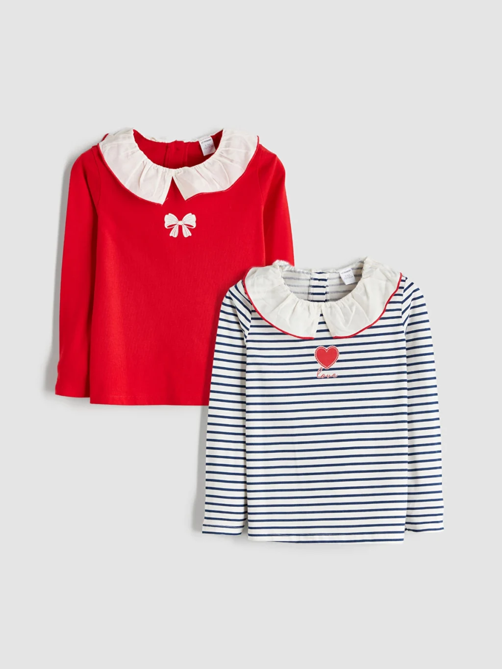 Kız çocuk için %100 pamuklu, uzun kollu ve büzgülü bebe yakalı 2'li tişört seti, enseden düğme kapamalıdır.