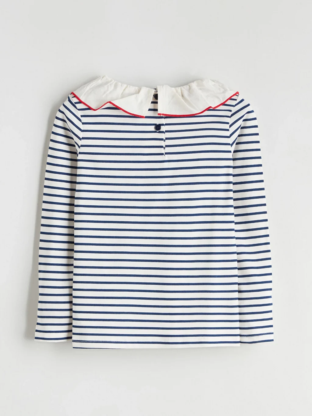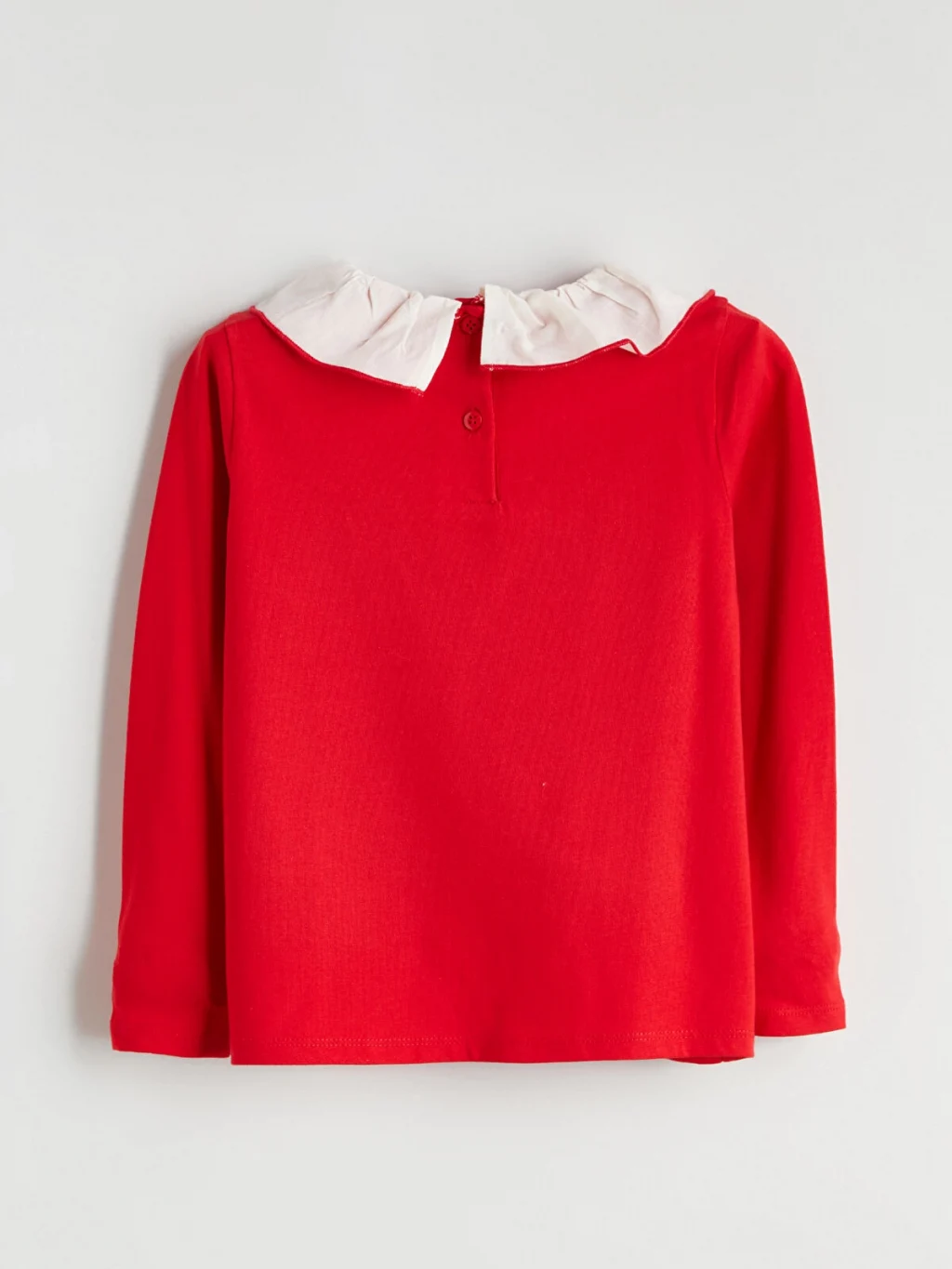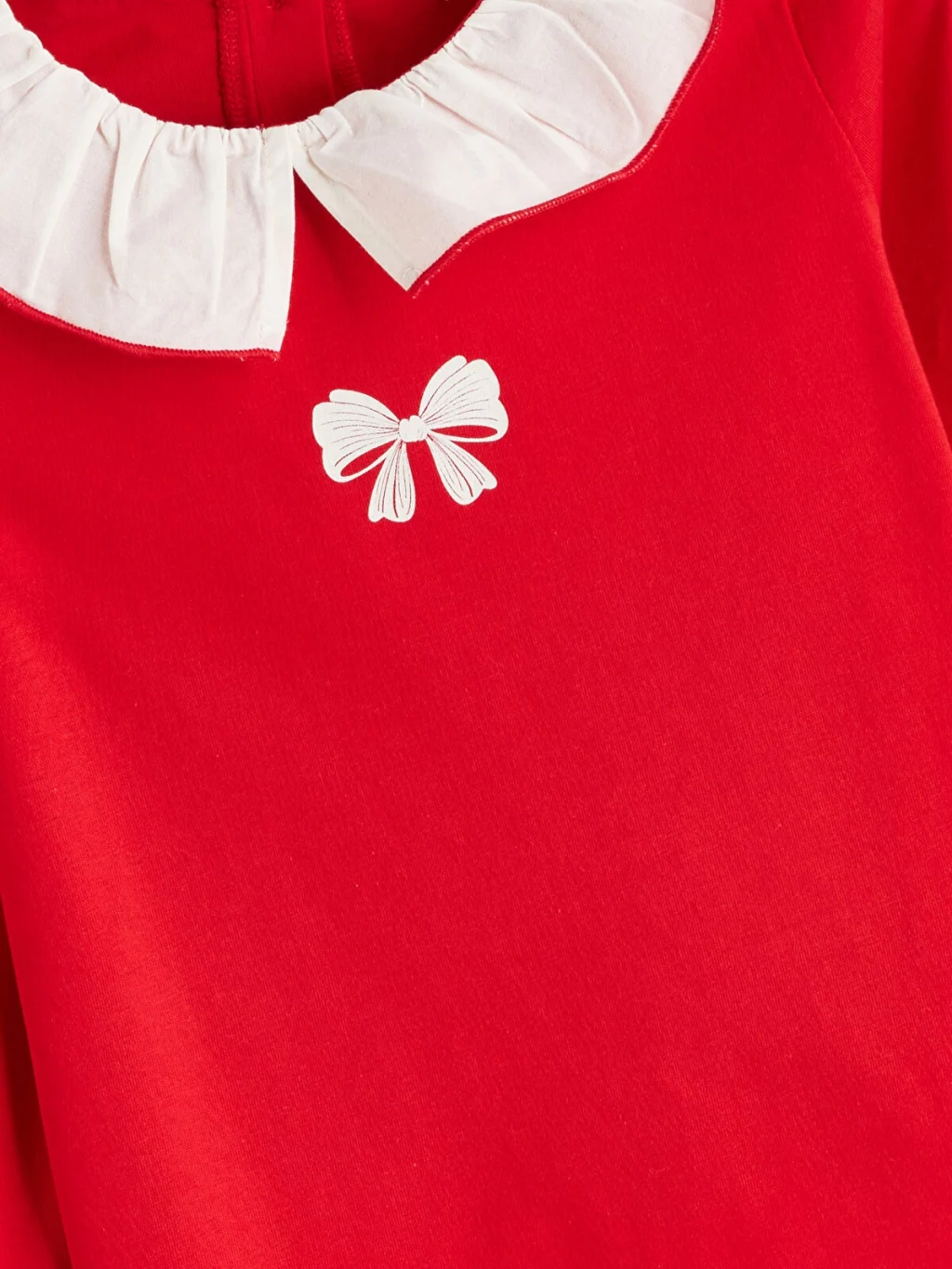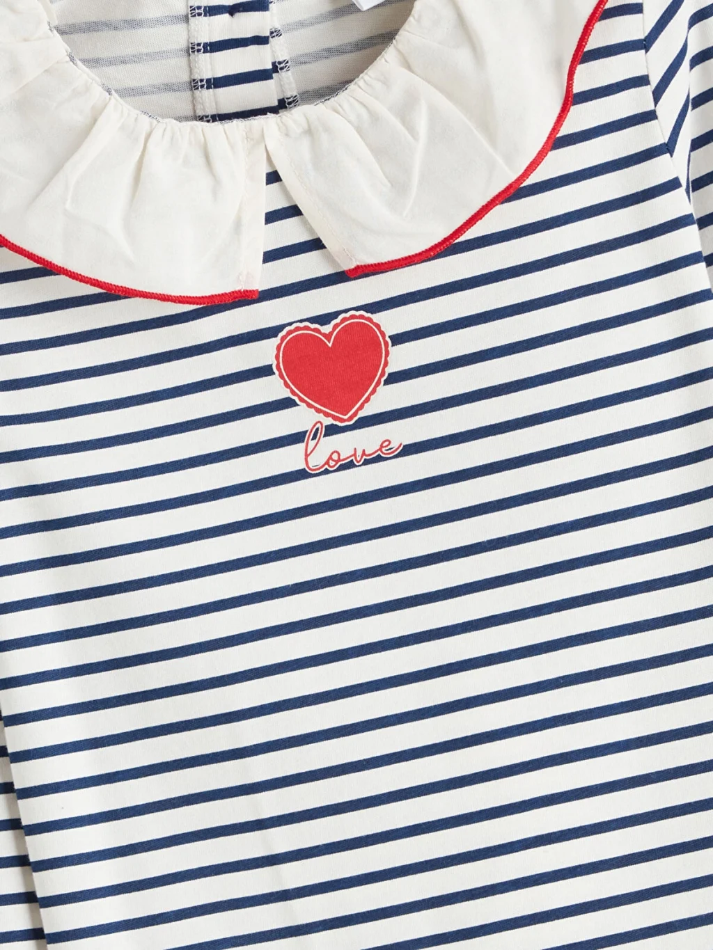 Kız çocuk için %100 pamuklu, uzun kollu ve büzgülü bebe yakalı 2'li tişört seti, enseden düğme kapamalıdır.