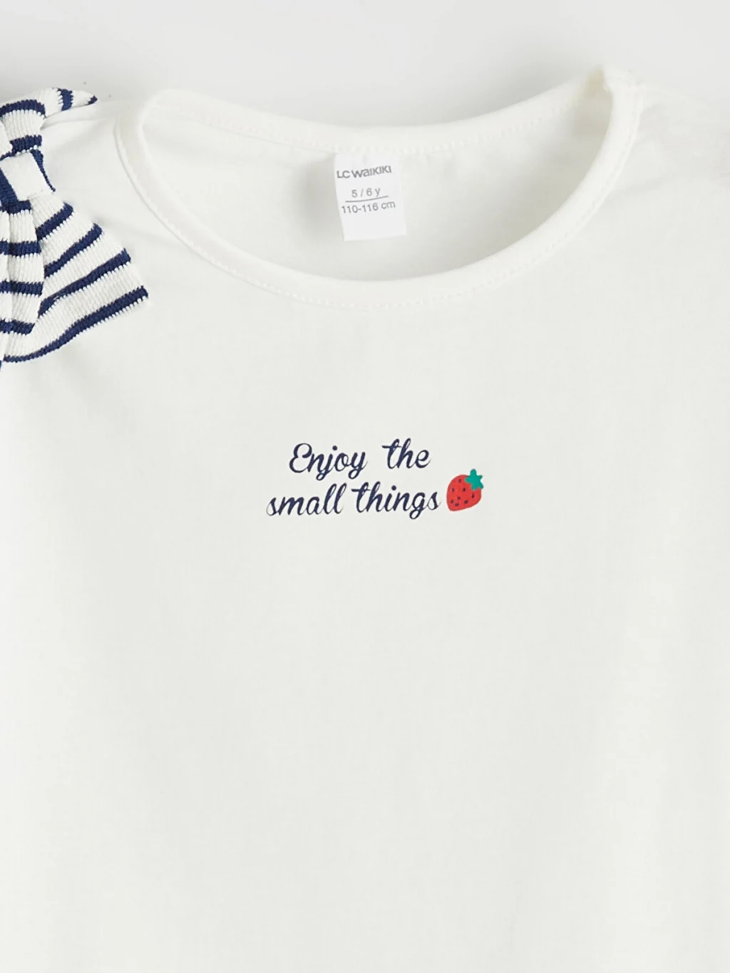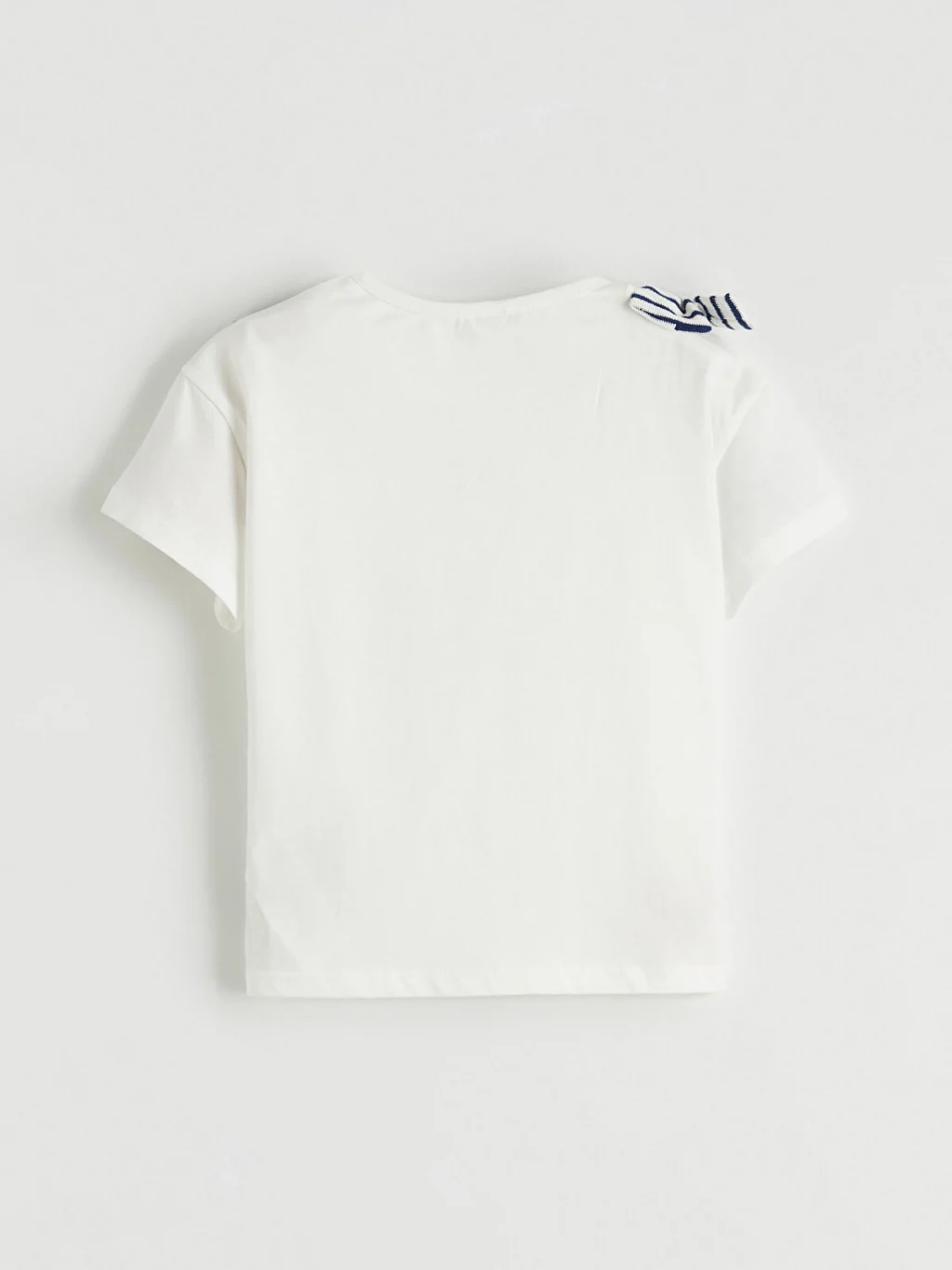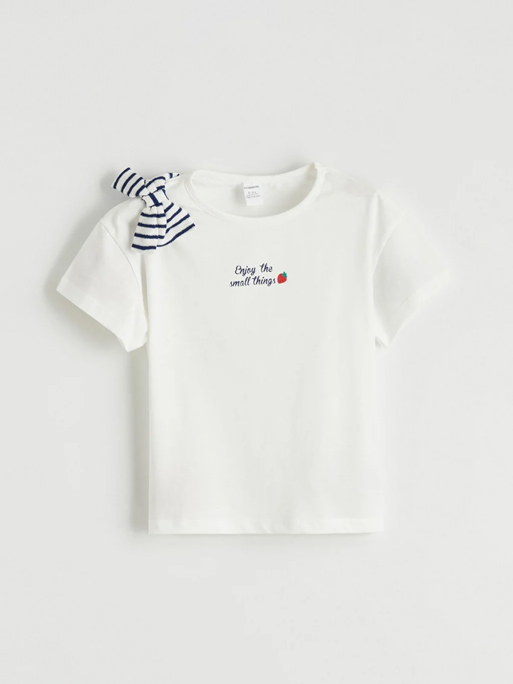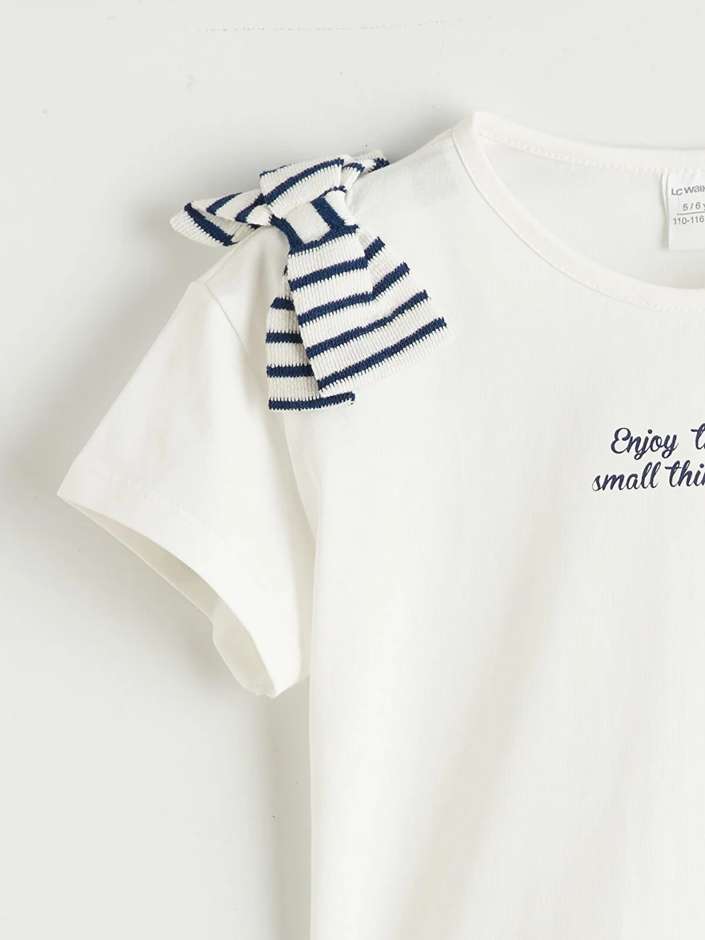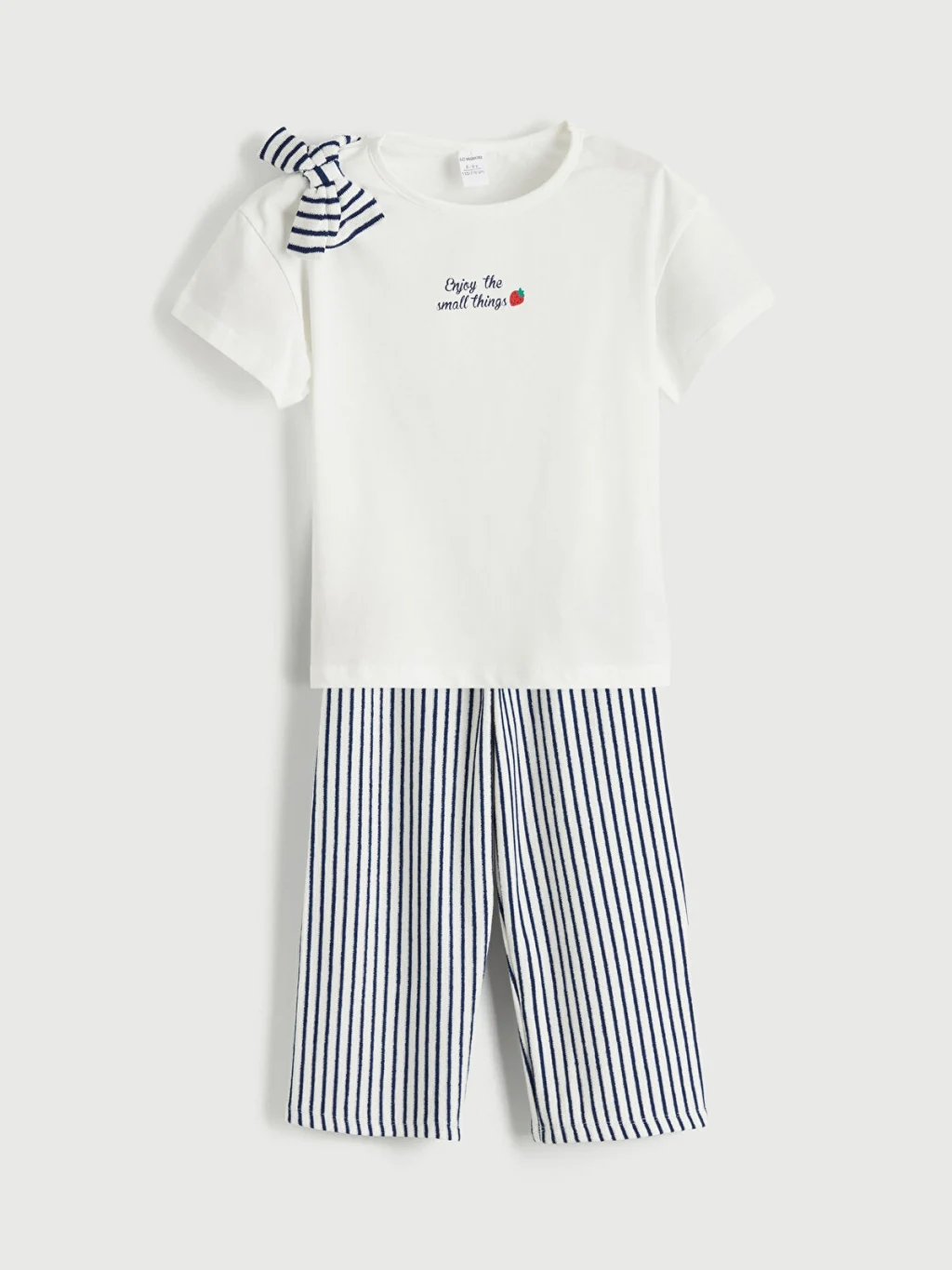 Bisiklet yaka, kısa kollu, omuzunda fiyonk detaylı tişört ve çizgili pantolondan oluşan kız çocuk takım, pamuk karışımlı kumaştan üretilmiştir.