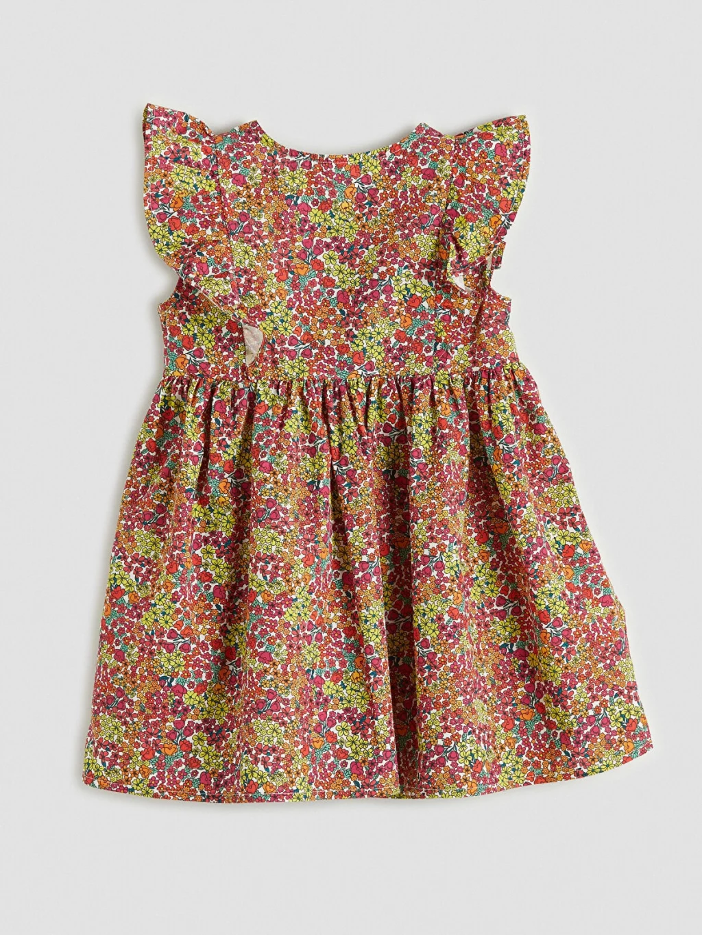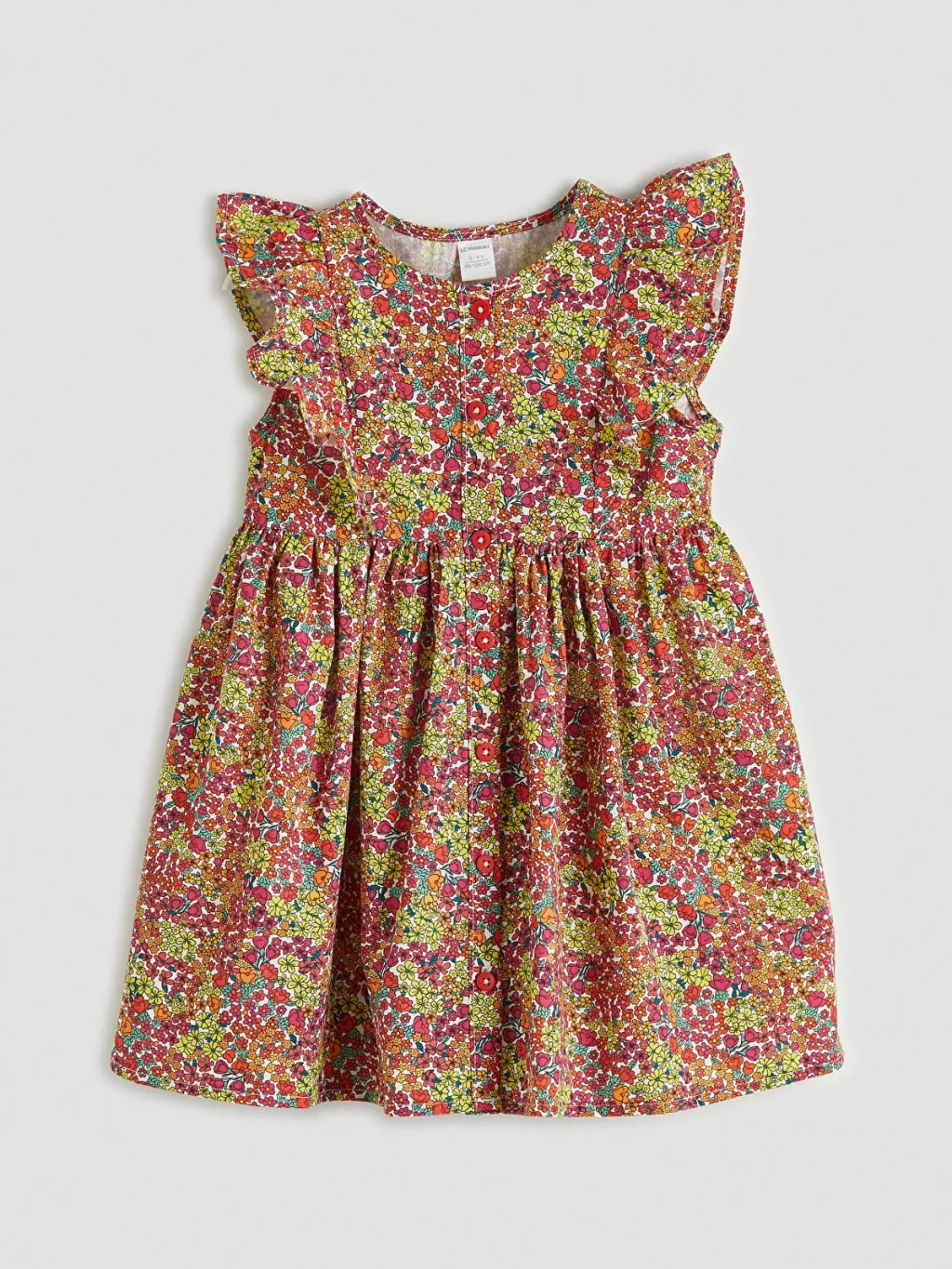 Bisiklet yaka, omuzları fırfırlı, kolsuz kız çocuk elbise, %100 pamuklu kumaştan üretilmiştir ve önden düğme kapamalıdır.