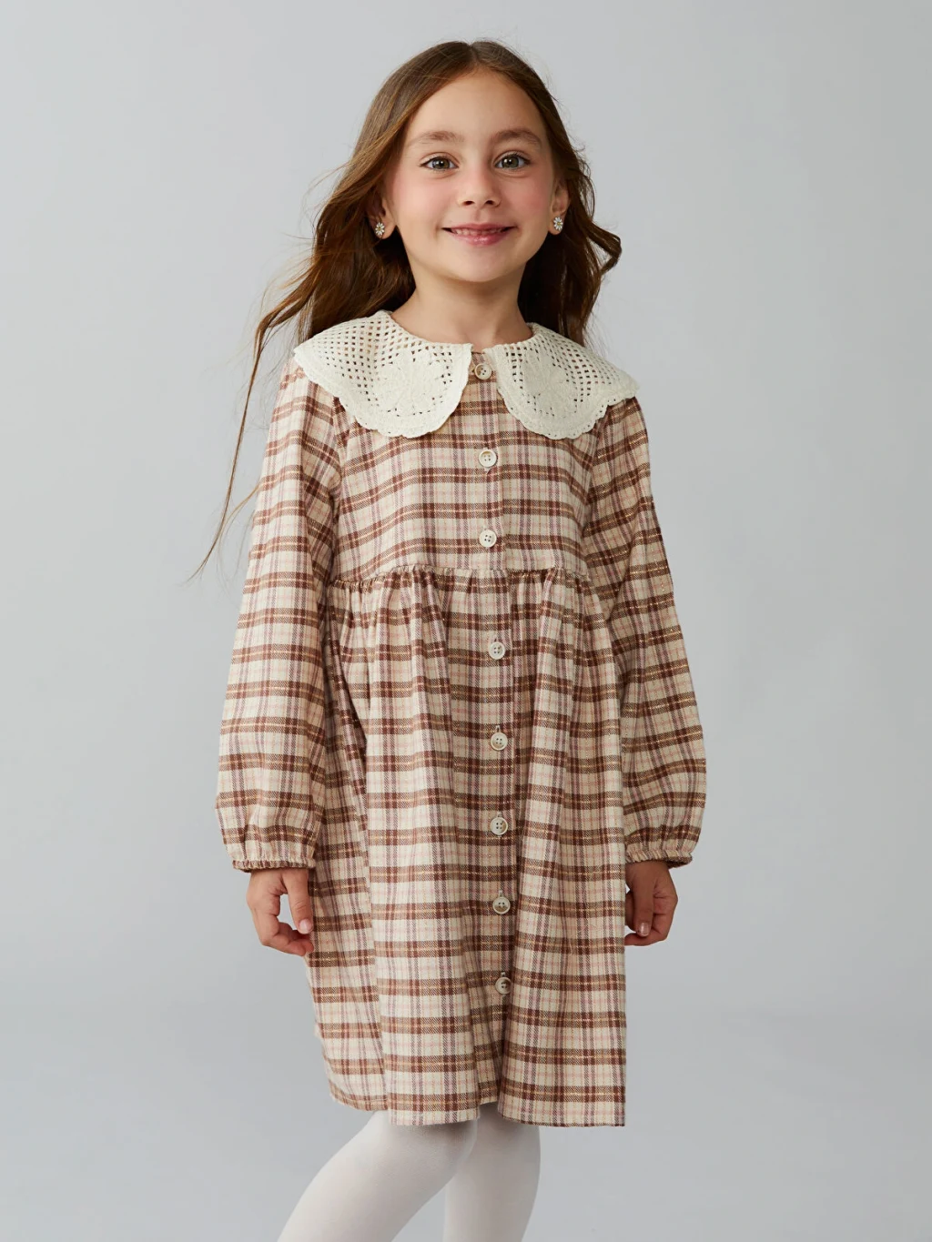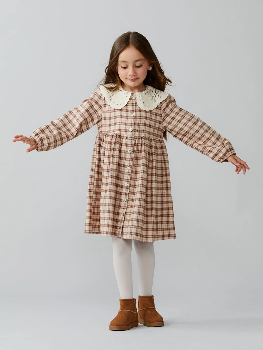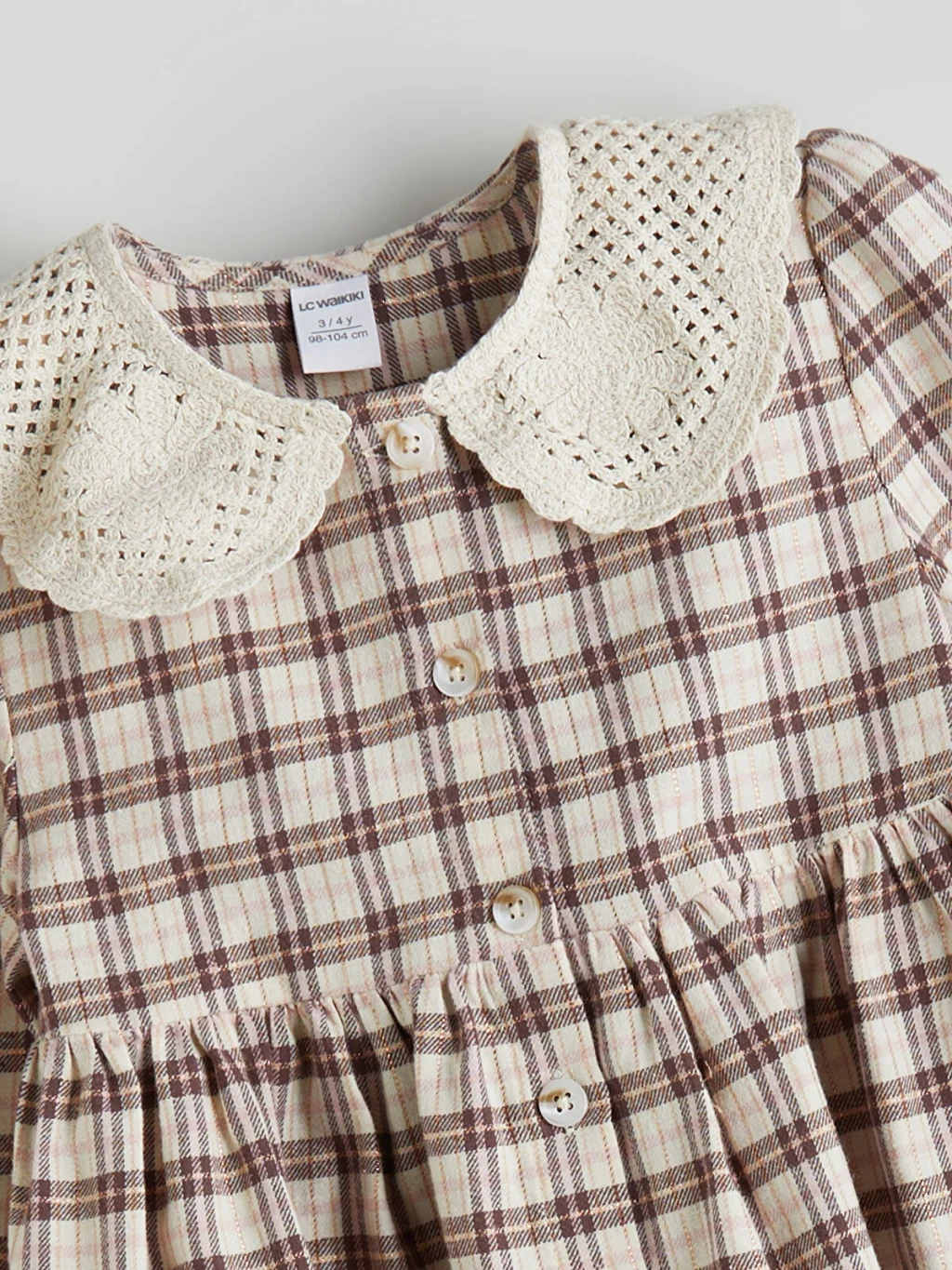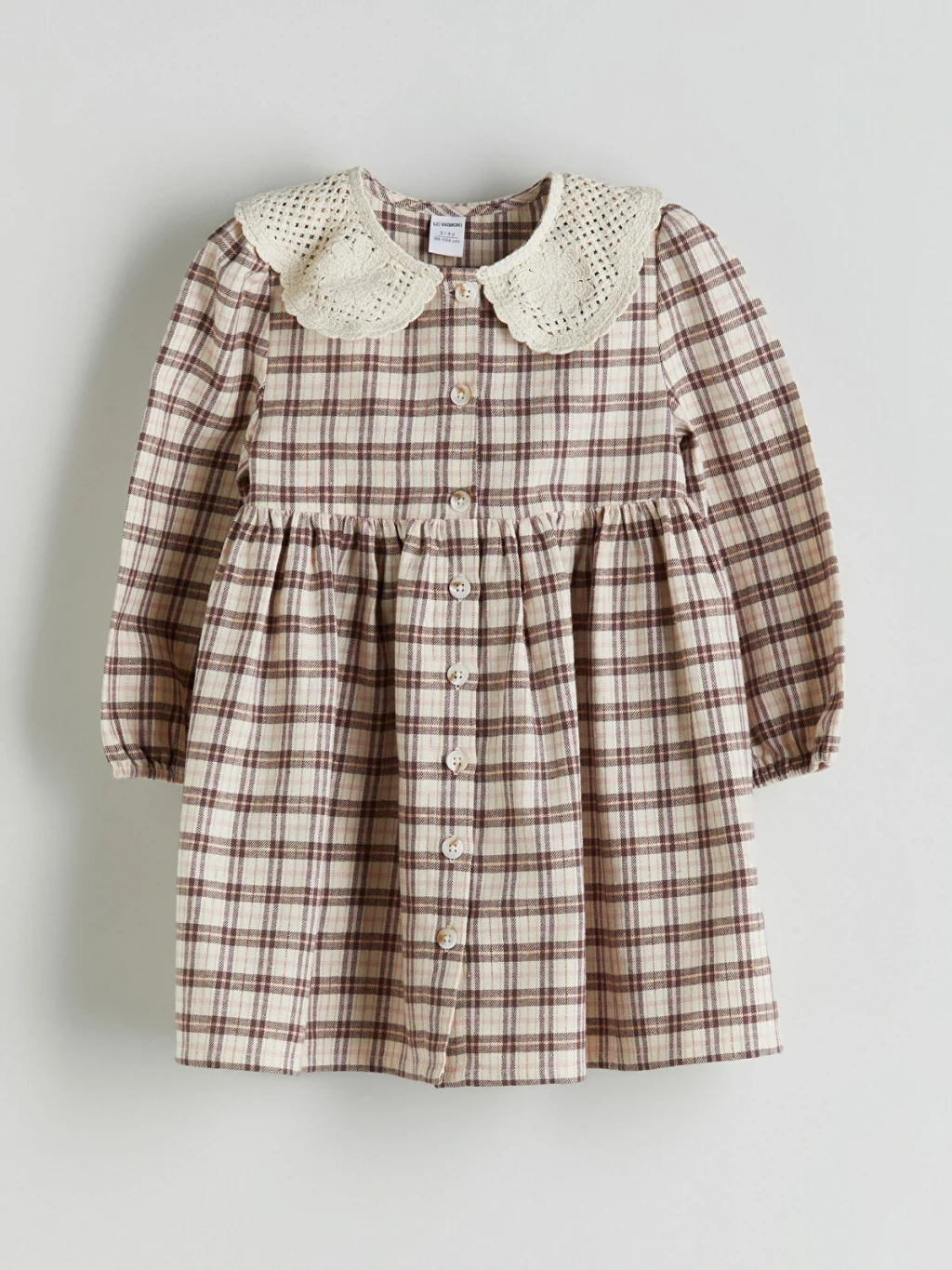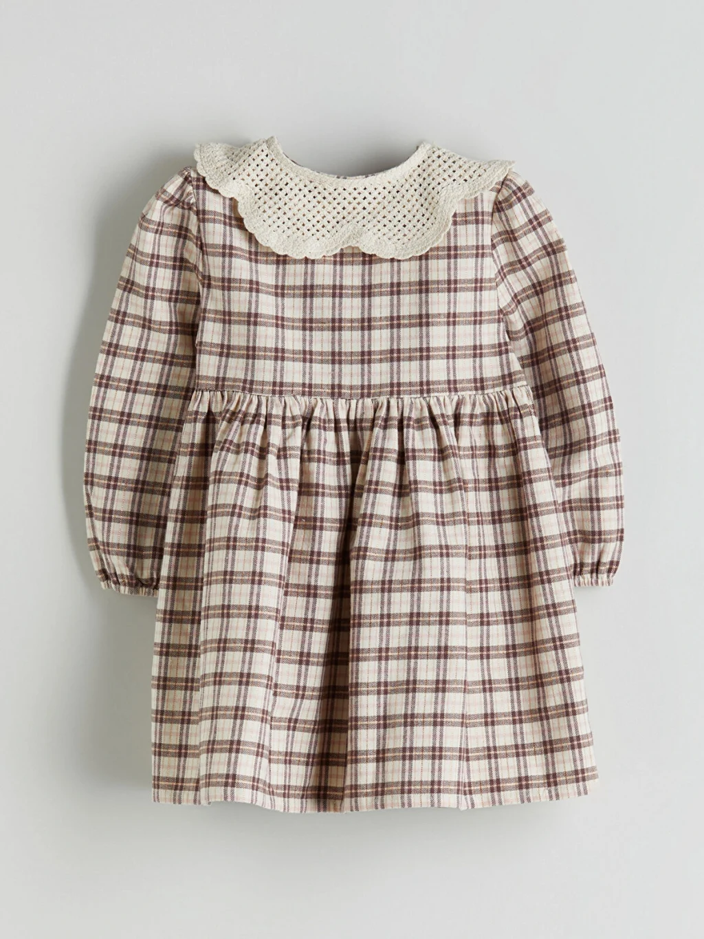 Kareli desenli, örgü detaylı bebe yakalı kız çocuk elbise, flanel kumaştan üretilmiştir. Beli büzgülü, uzun kollu ve önden düğme kapamalıdır.