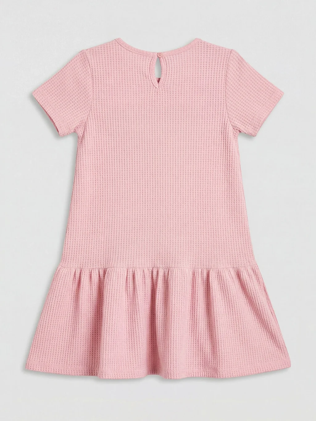Kız çocuk elbise, bisiklet yaka, kısa kollu ve etek ucu fırfırlıdır. Önünde fiyonk detayları bulunur ve arkası düğme kapamalıdır.