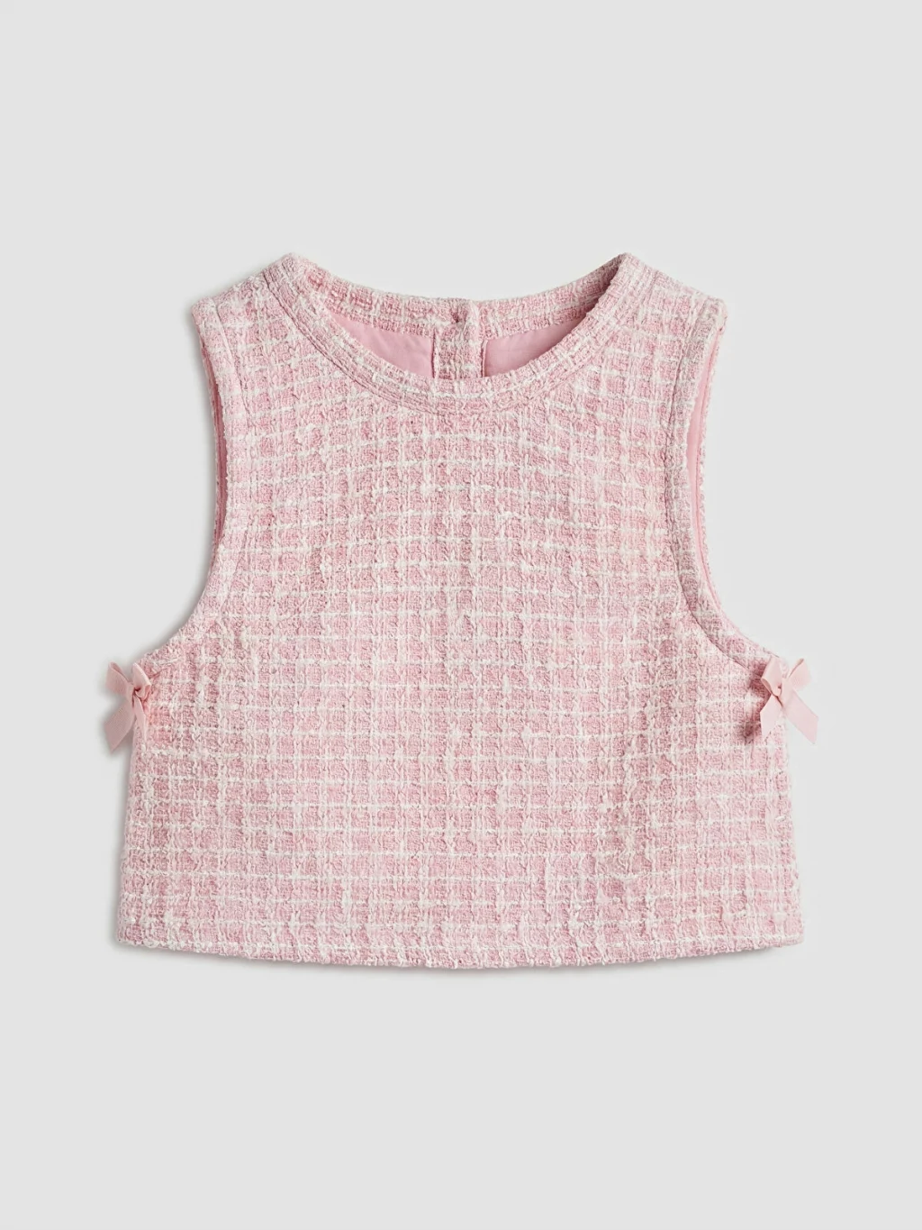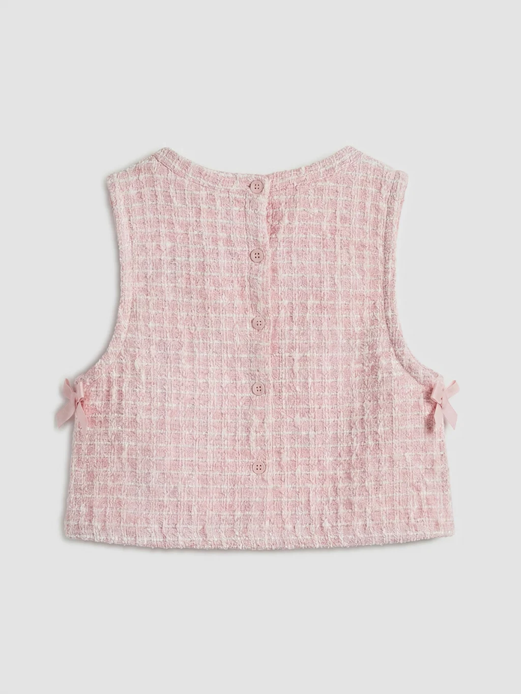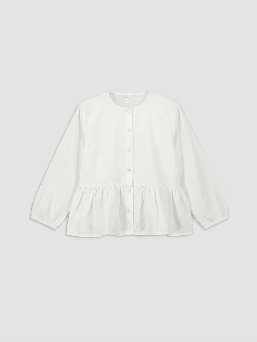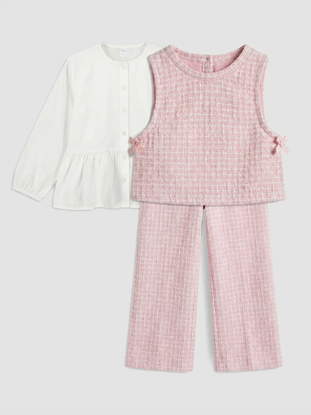 Kız çocuk takım; uzun kollu, bisiklet yakalı, düğme kapamalı poplin gömlek, kolsuz üst ve pantolondan oluşur. %100 pamuk içerir.