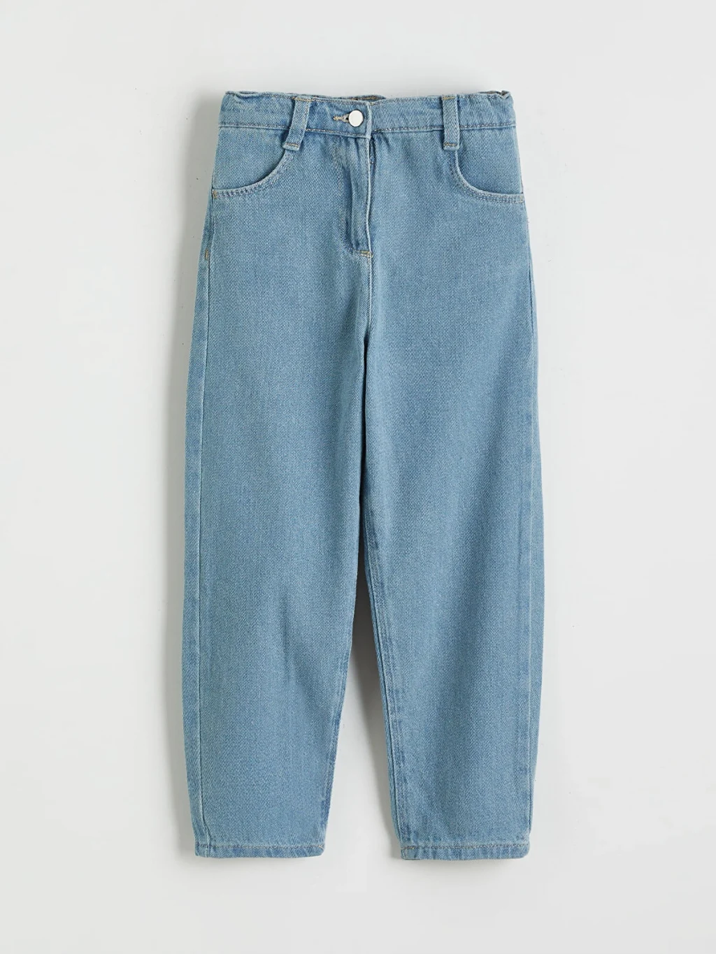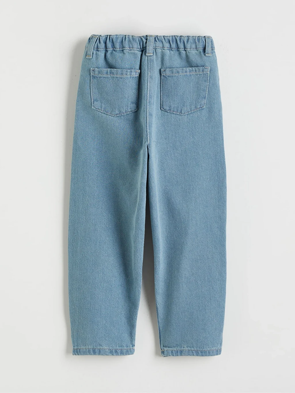 Mom fit kesimli kız çocuk jean pantolon, pamuklu denim kumaştan üretilmiştir. Beli lastikli, daralan paçalı ve beş cepli tasarıma sahiptir.