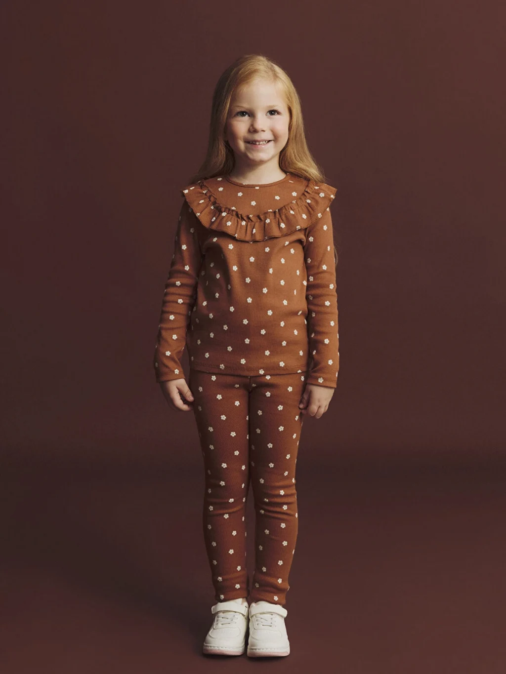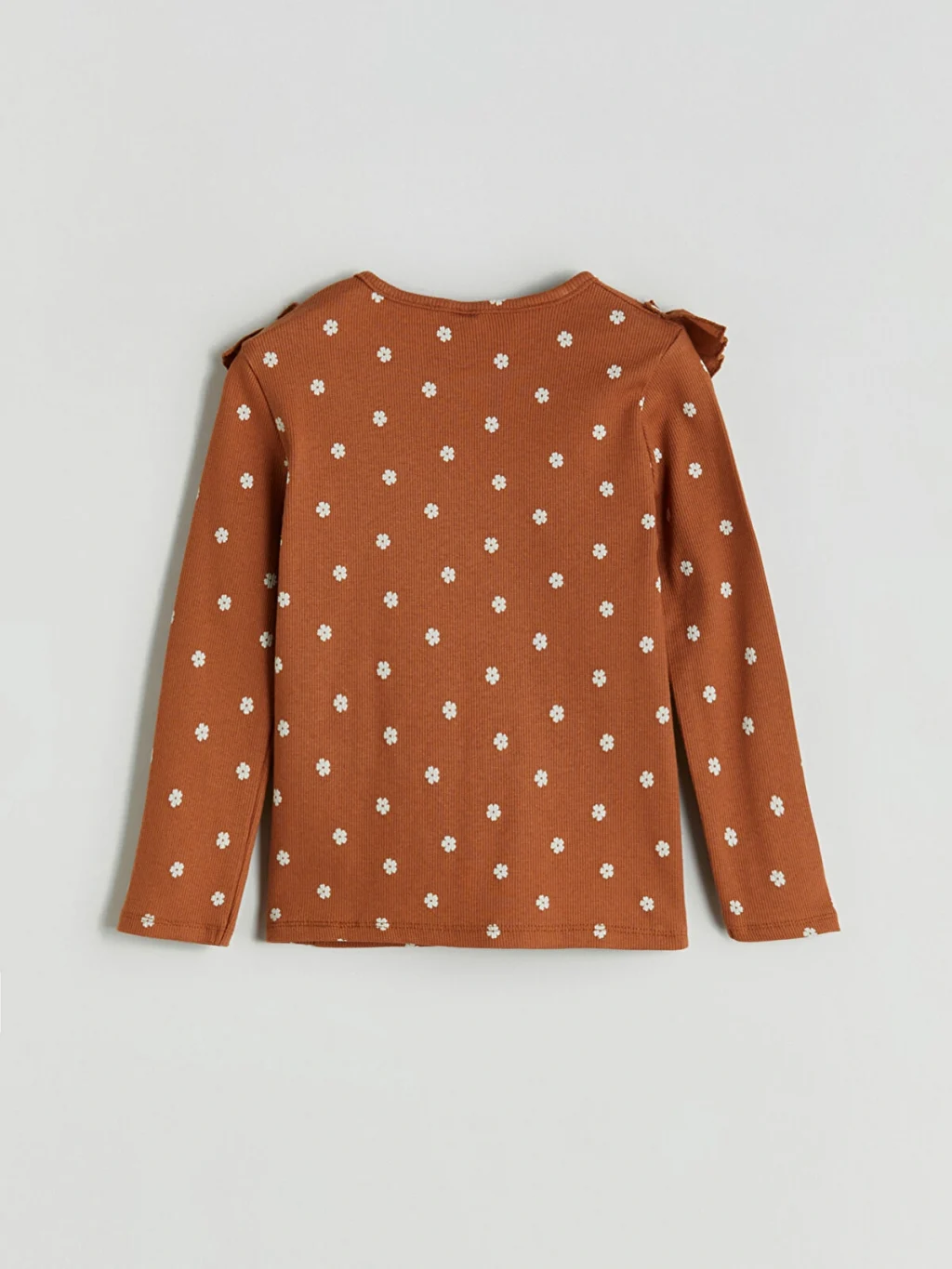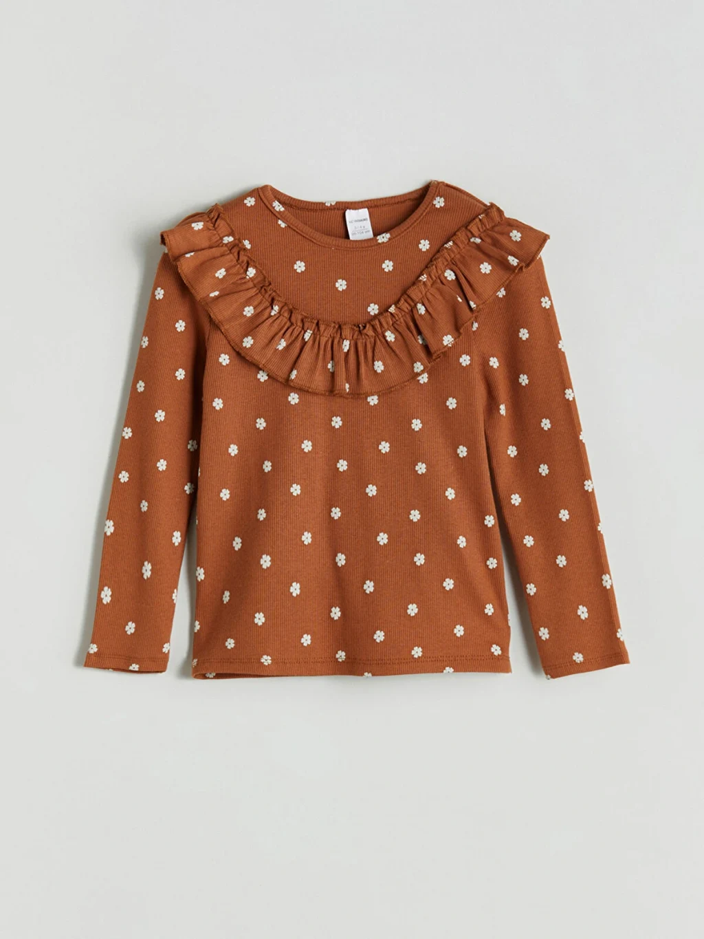 Dar kalıplı kız çocuk tişört, bisiklet yakalı ve uzun kolludur. Desenli kaşkorse kumaştan üretilmiştir ve yakası fırfır detaylıdır.