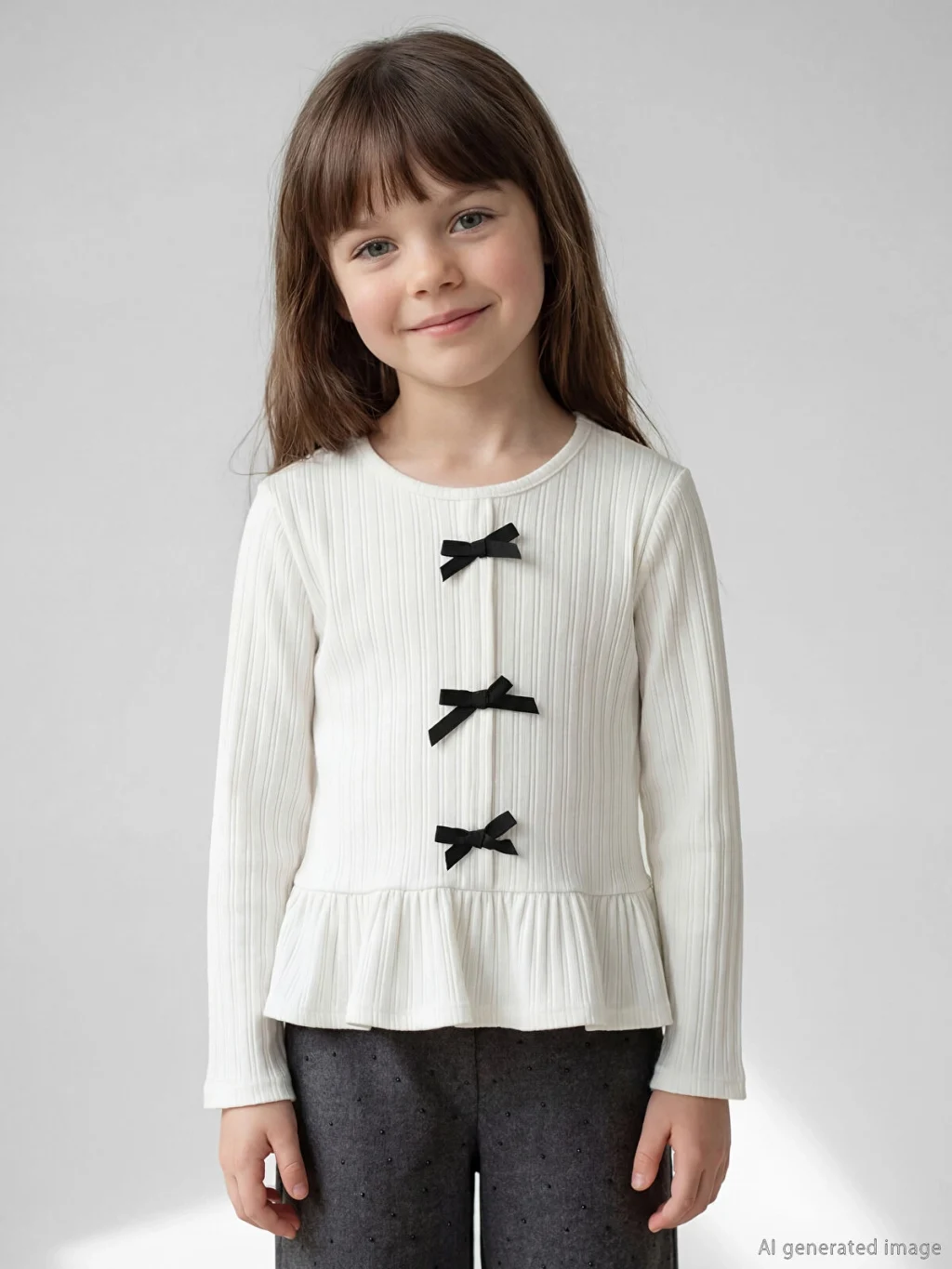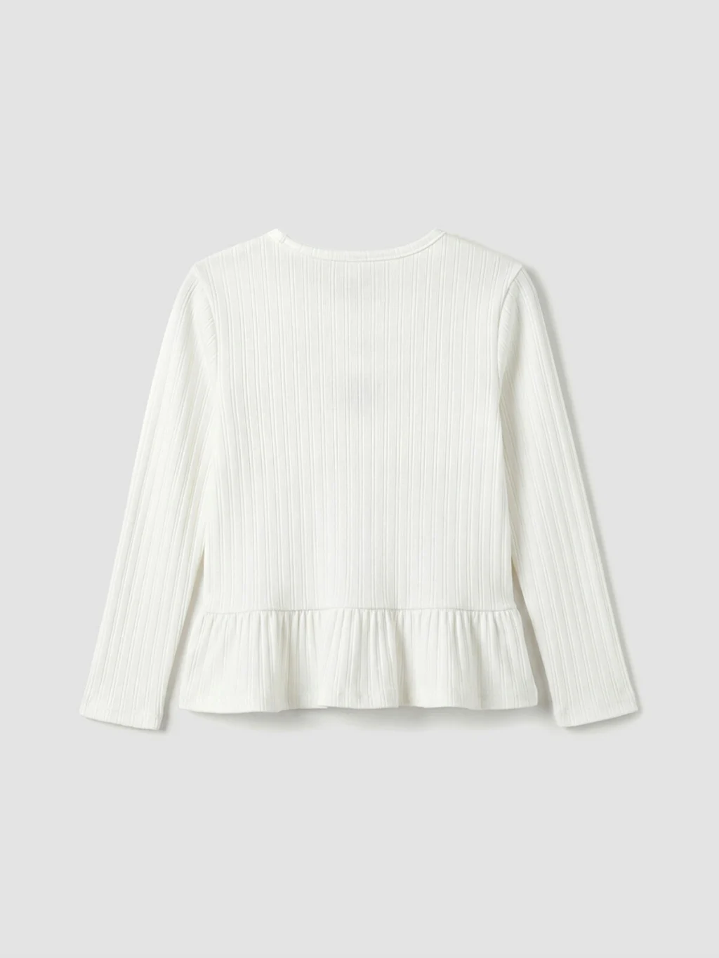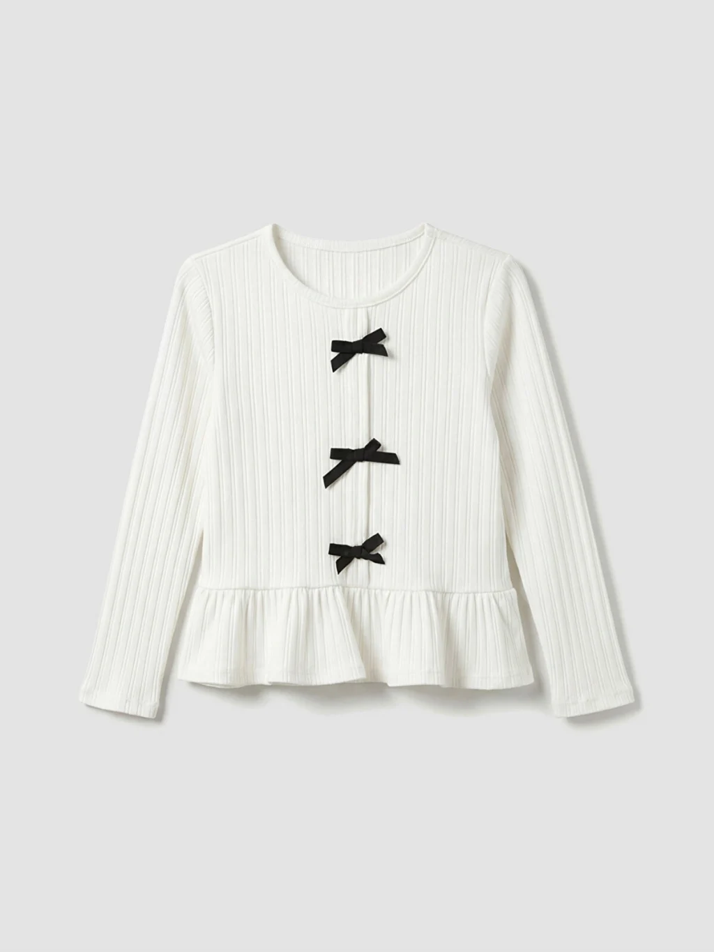 Bisiklet yaka ve uzun kollu kız çocuk tişört, kaşkorse kumaştan üretilmiştir. Etek ucu volanlıdır ve önü fiyonk detaylıdır.