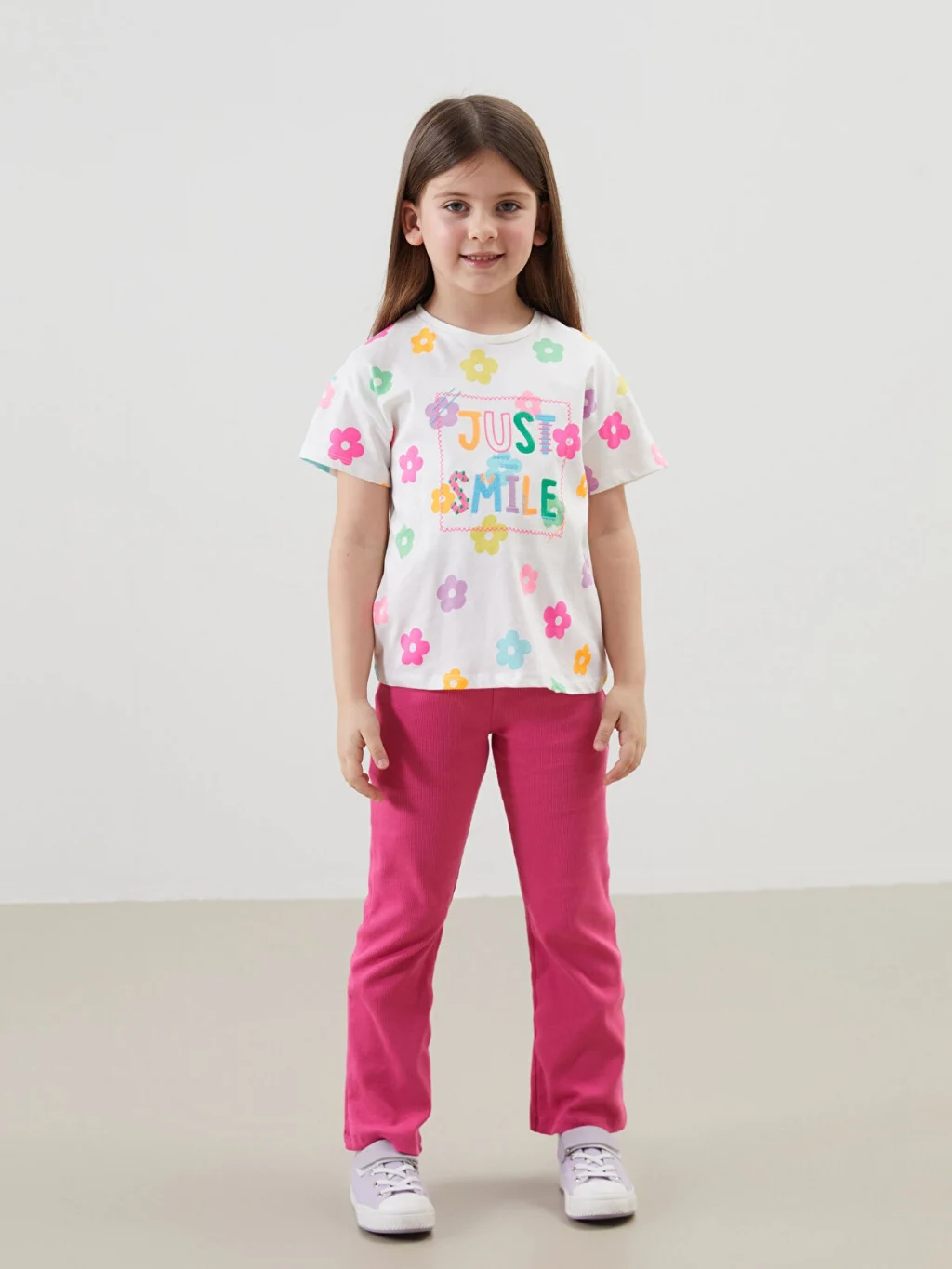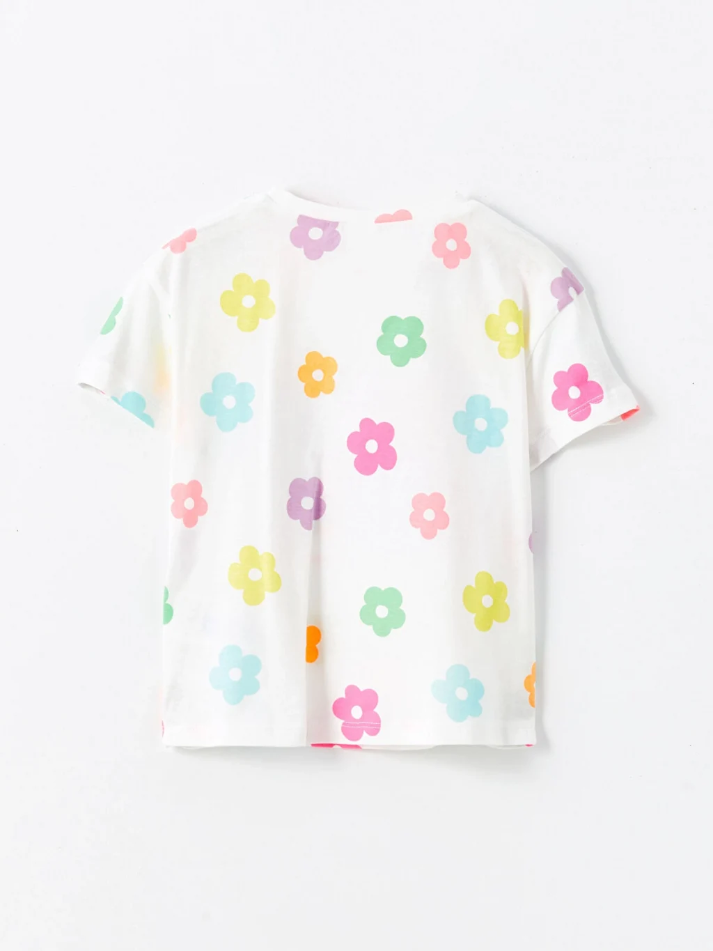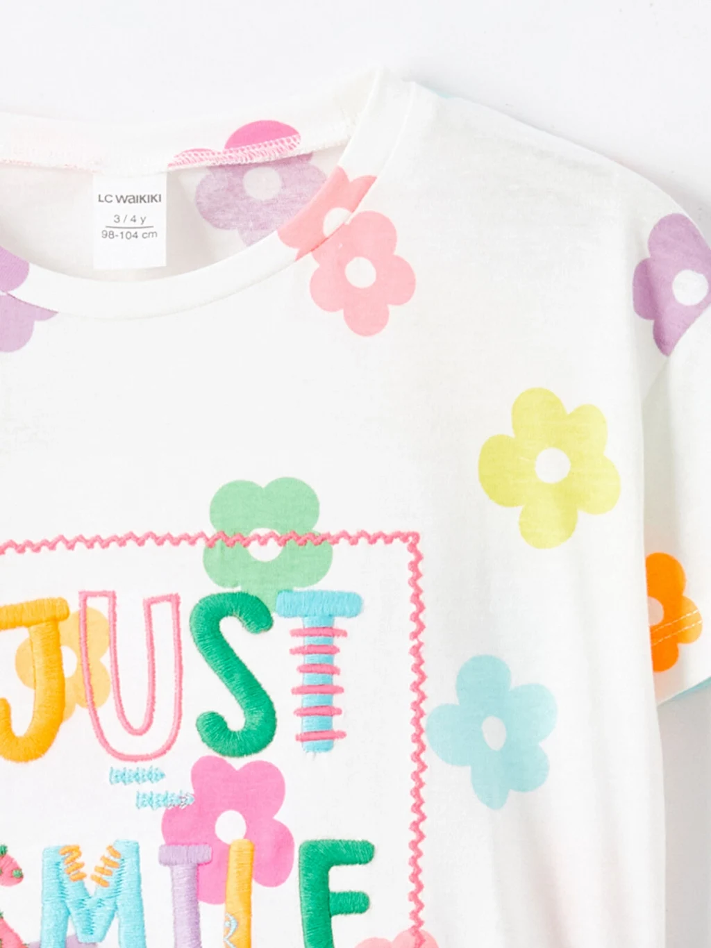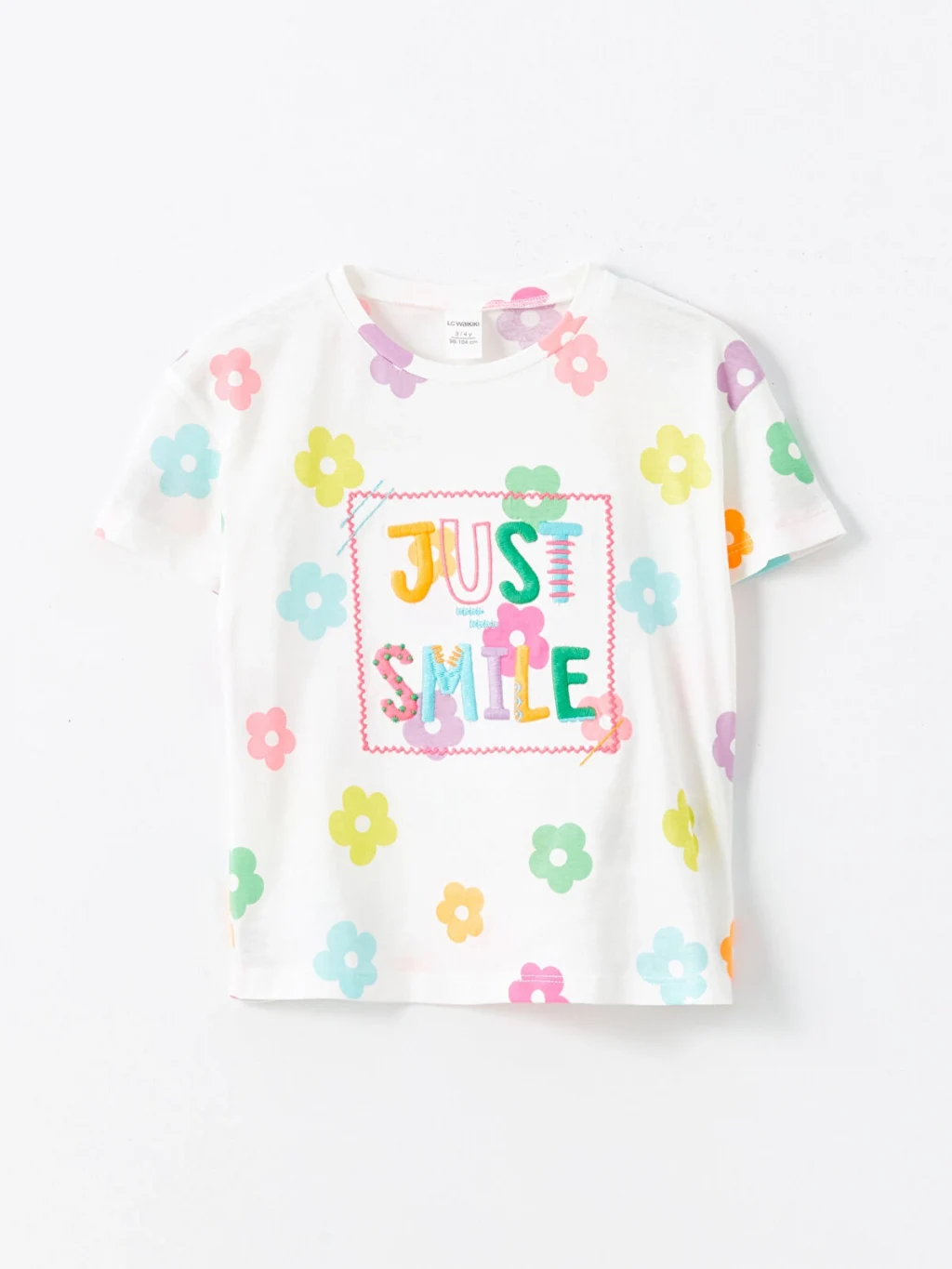 Bisiklet yaka, kısa kollu kız çocuk tişört, %100 pamuklu penye kumaştan üretilmiştir. Çiçek desenli, önü yazı baskılı ve nakış detaylıdır.