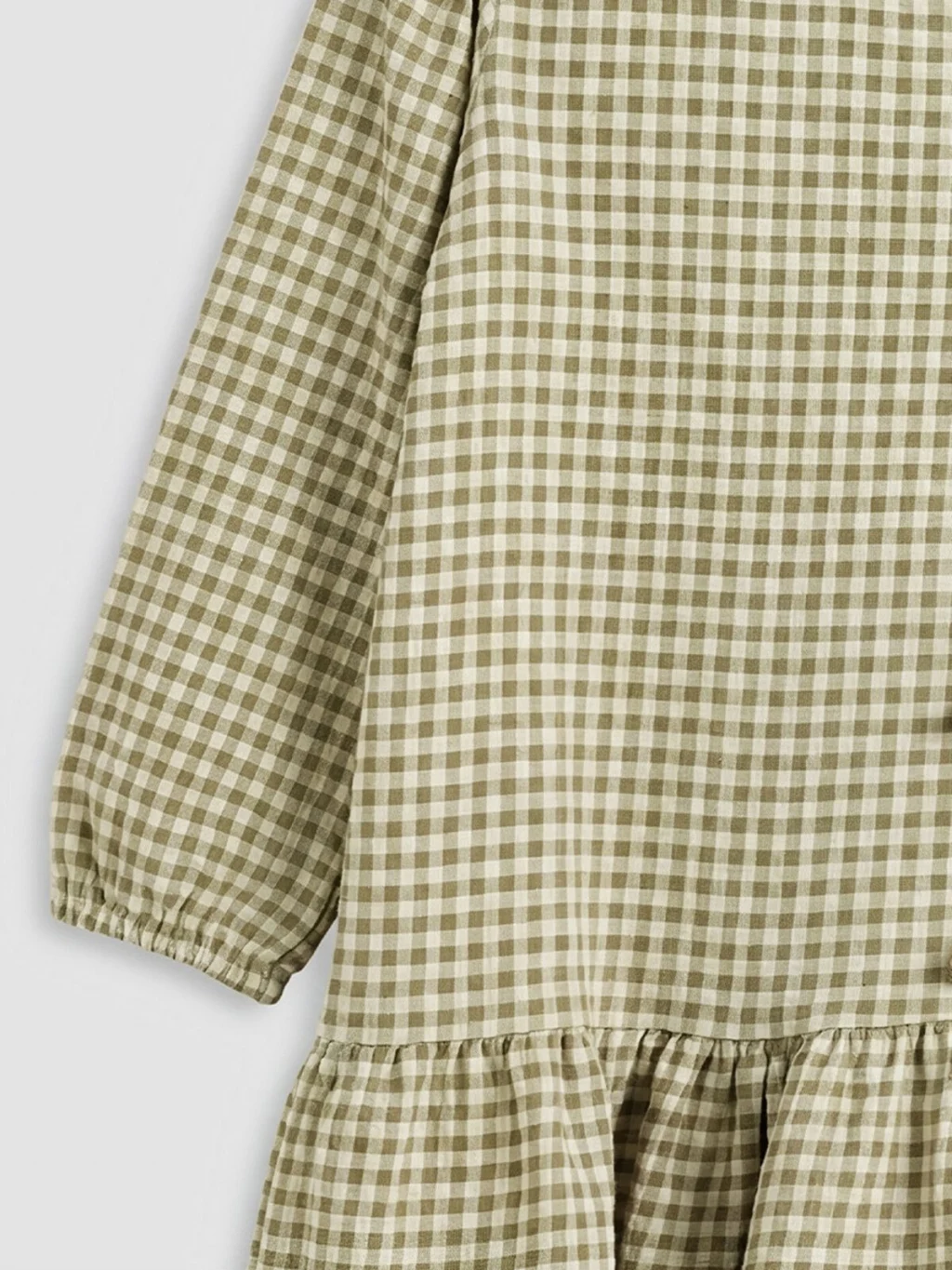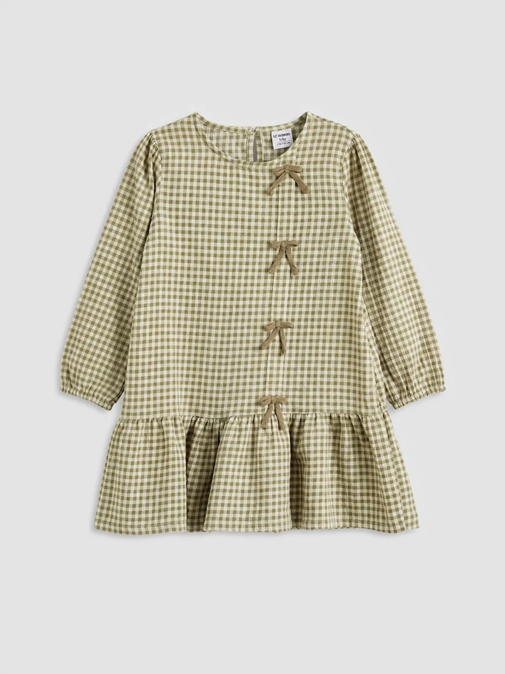 Kareli, bisiklet yakalı ve uzun kollu kız çocuk elbise, penye kumaştan üretilmiştir. Etek ucu fırfırlı, önü fiyonk detaylı ve enseden düğme kapamalıdır.