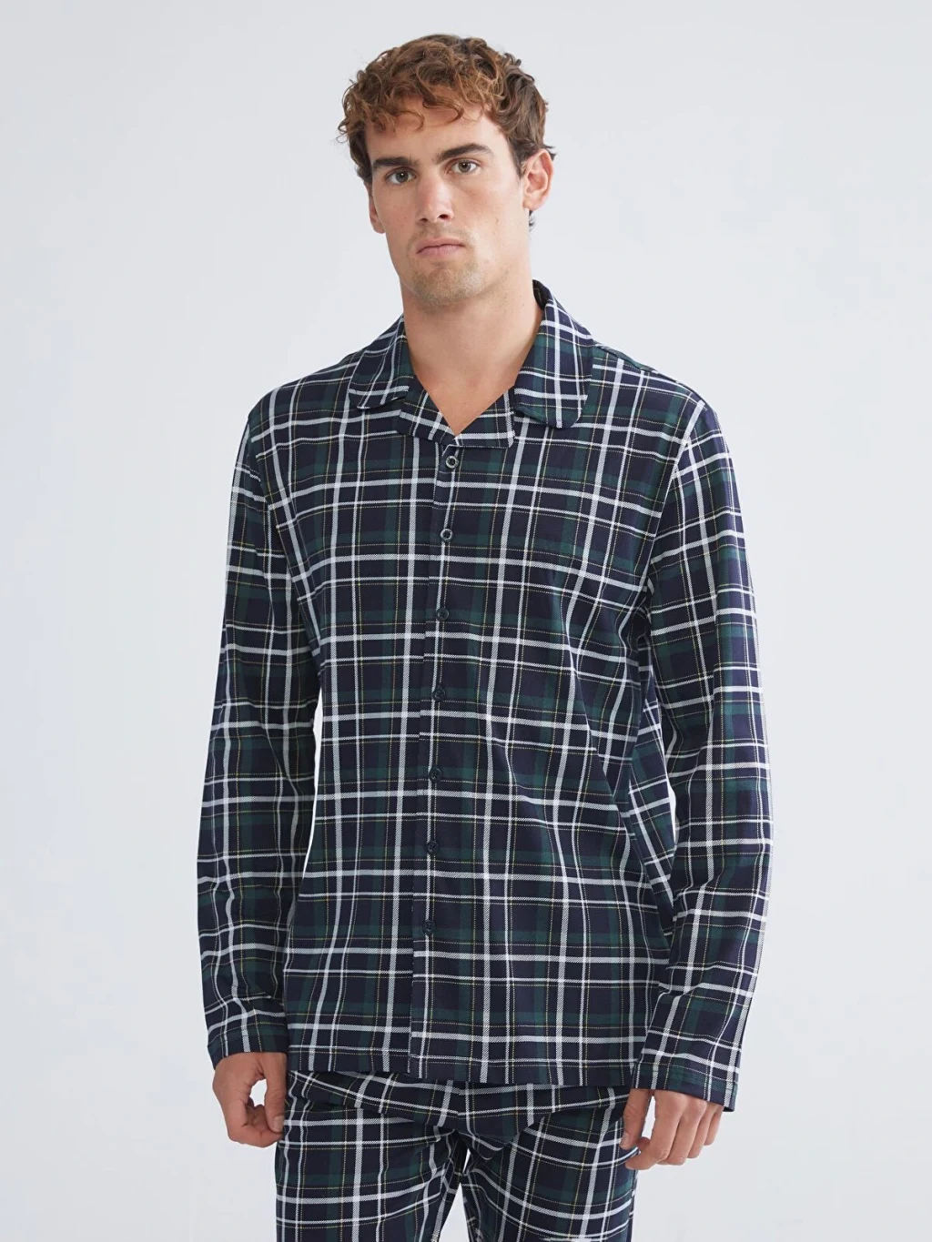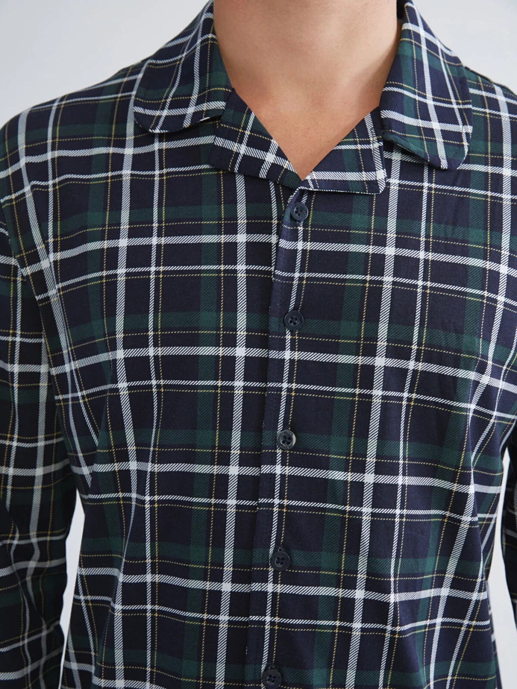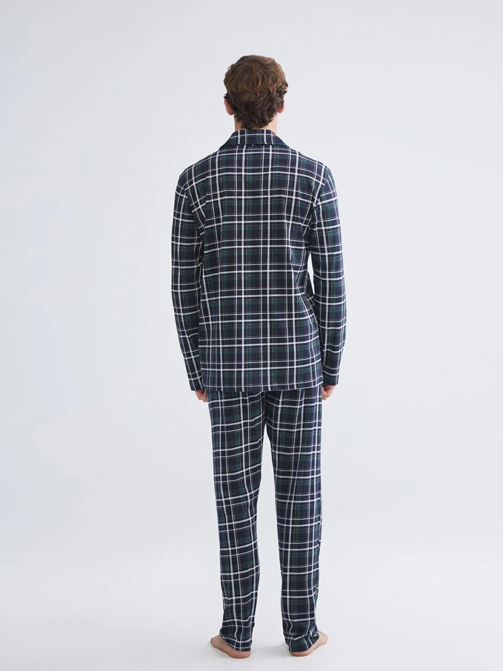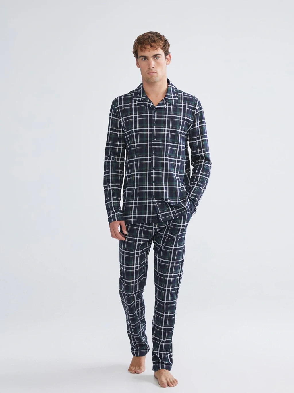 Ekose desenli erkek pijama takımı, gömlek yakalı, uzun kollu ve önden düğmeli bir üst ile uzun bir alttan oluşur. %100 pamuklu penye kumaştır.