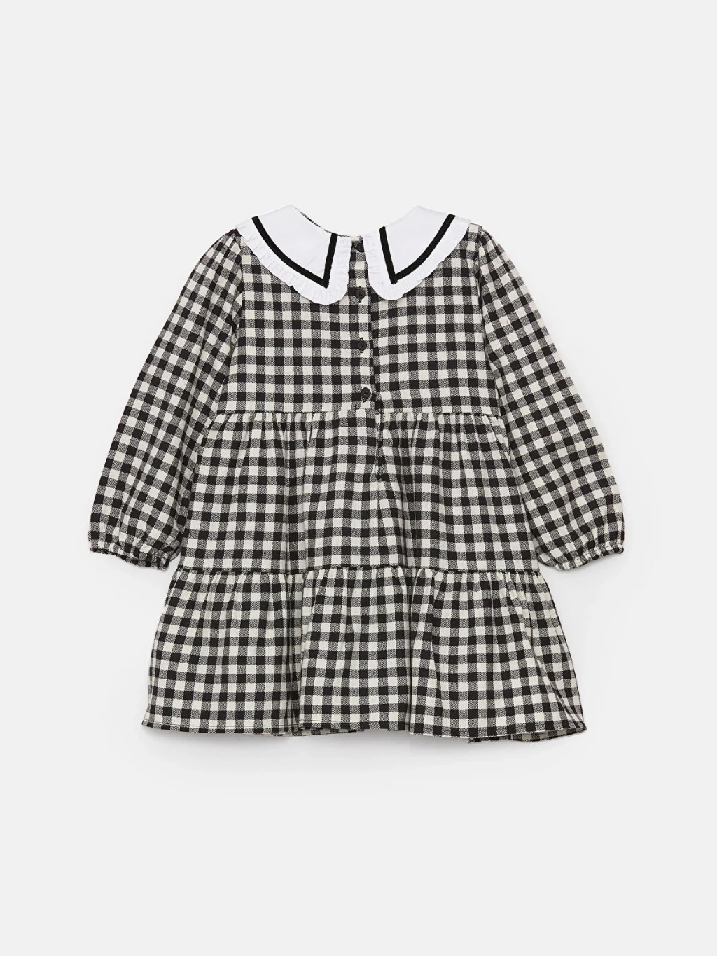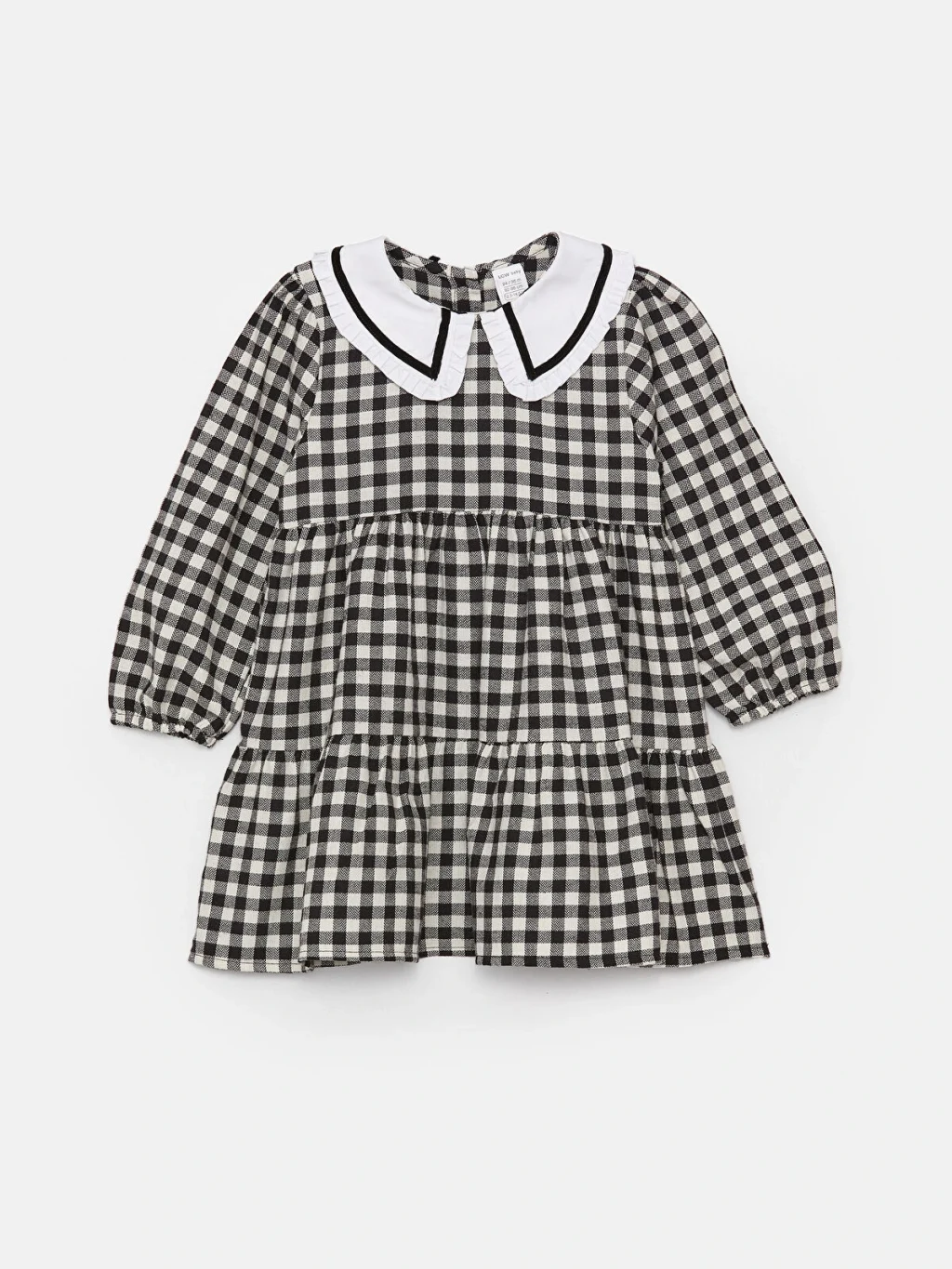 Kareli desenli, bebe yakalı ve uzun kollu kız çocuk elbise, katlı eteklidir. %100 pamuklu flanel kumaştan üretilmiştir ve arkadan düğme kapamalıdır.