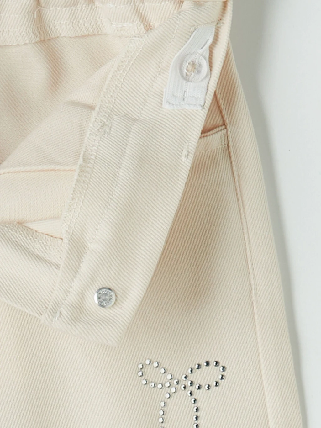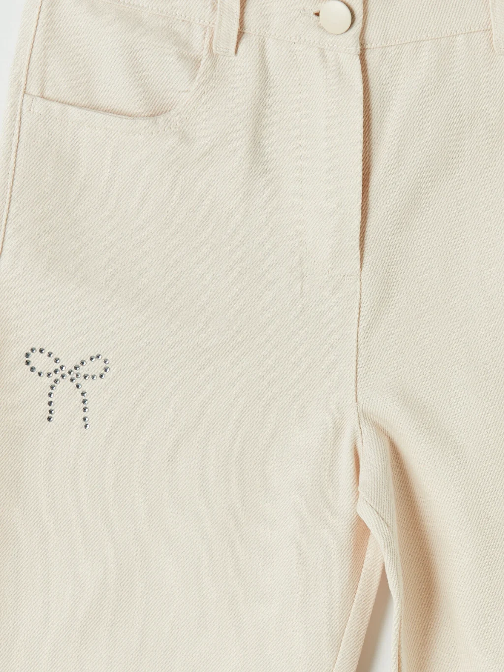 Standart kalıp kız çocuk gabardin pantolon, %100 pamuk kumaştan üretilmiştir. Fiyonk desenlidir, cepleri bulunur, fermuar ve düğme kapamalıdır.
