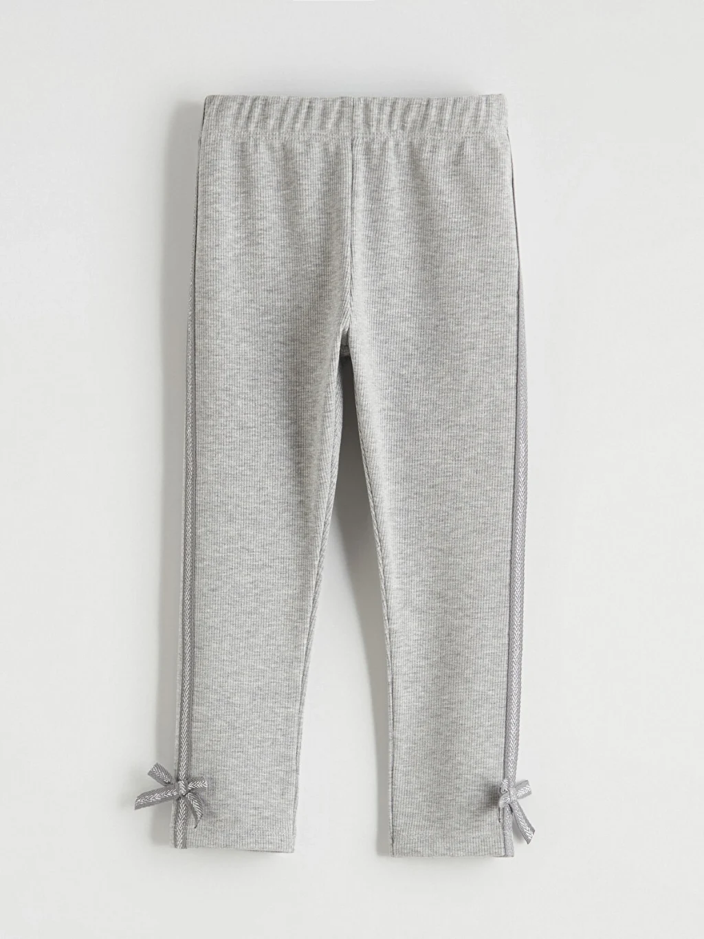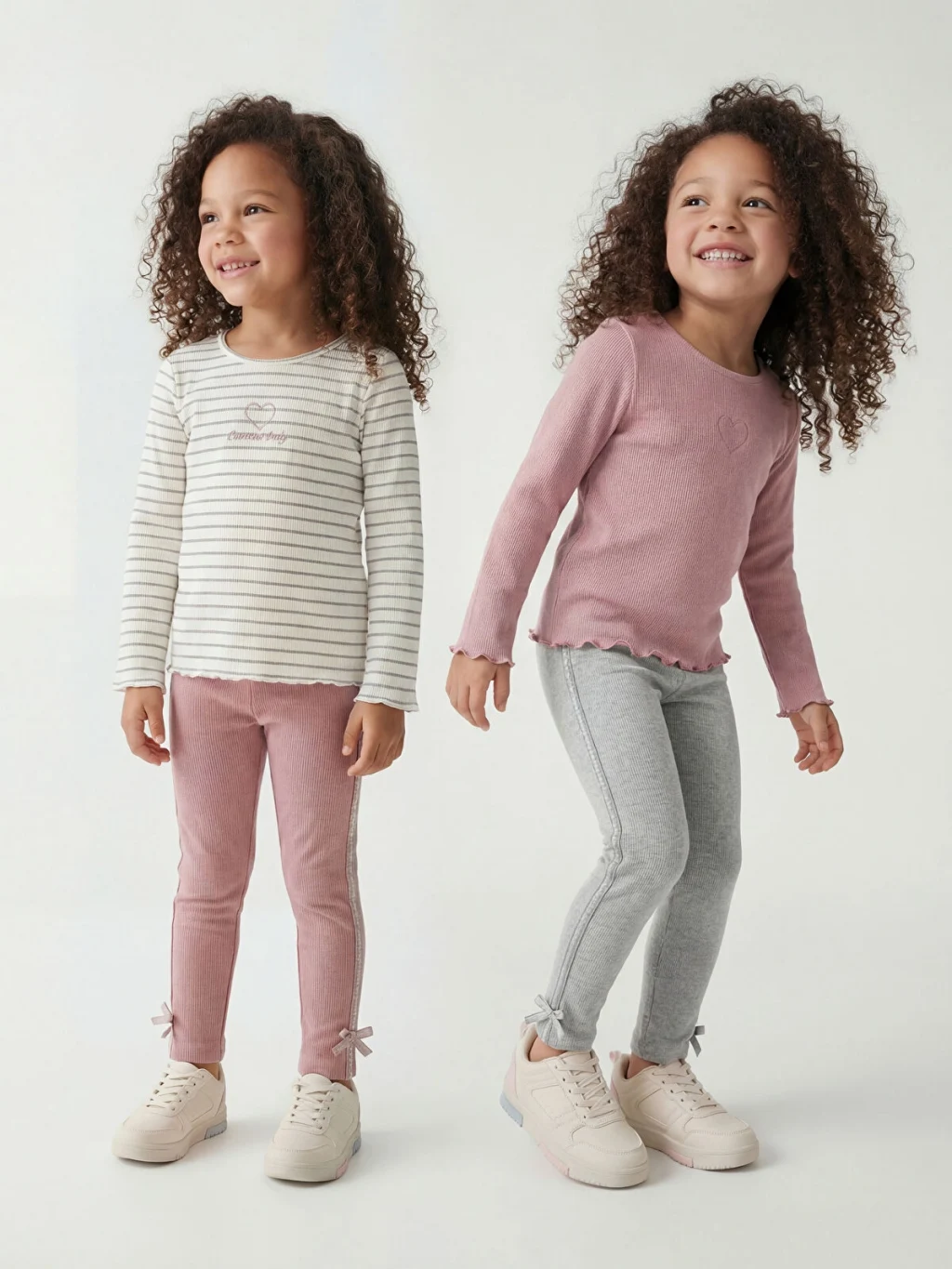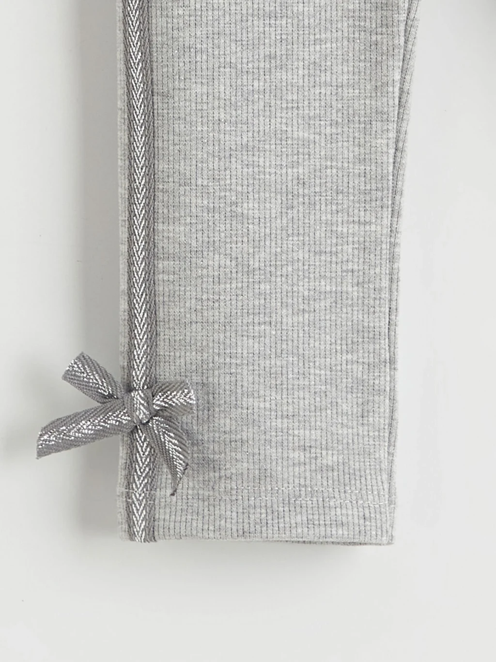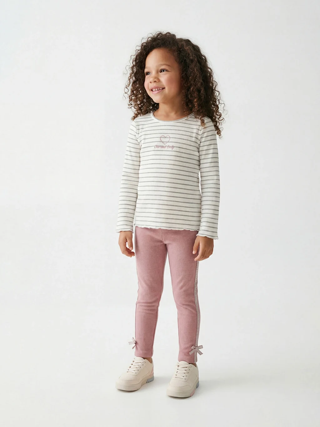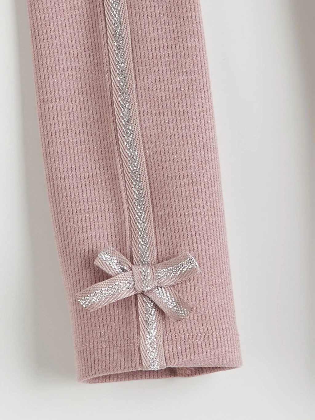Yüksek pamuk içerikli kaşkorse kumaştan üretilen, beli lastikli ve uzun paçalı kız çocuk tayt, fiyonk detaylı bir tasarıma sahiptir.