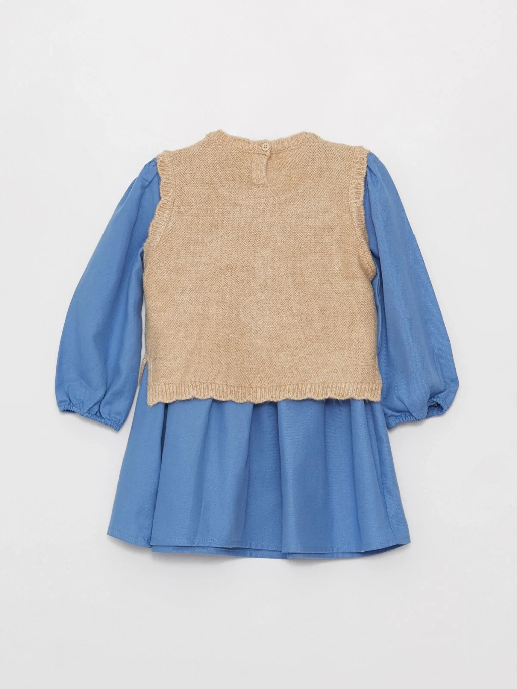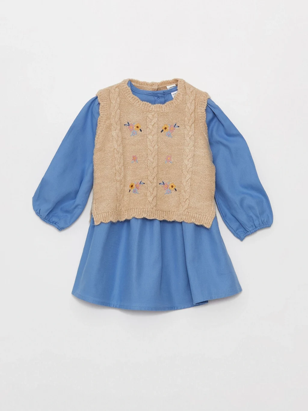 Bu şık 2'li takım, kız bebekler için mükemmel bir kombinasyon sunuyor. Elbisenin kol ucu lastikleri ve arka yakadan düğme kapamalı tasarımı, giyimi kolaylaştırırken süveterin çiçek nakışlı detayları ise şıklığı tamamlar.