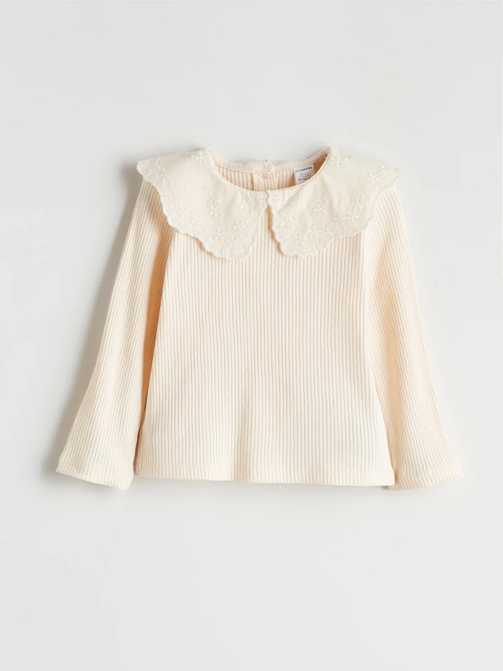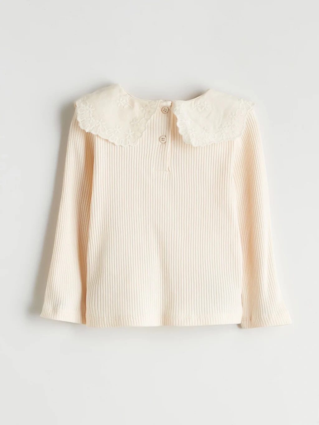 İşlemeli bebe yakalı, uzun kollu kız çocuk tişört, dar kalıp kaşkorse kumaştan üretilmiştir. Arkadan düğme kapamalıdır.