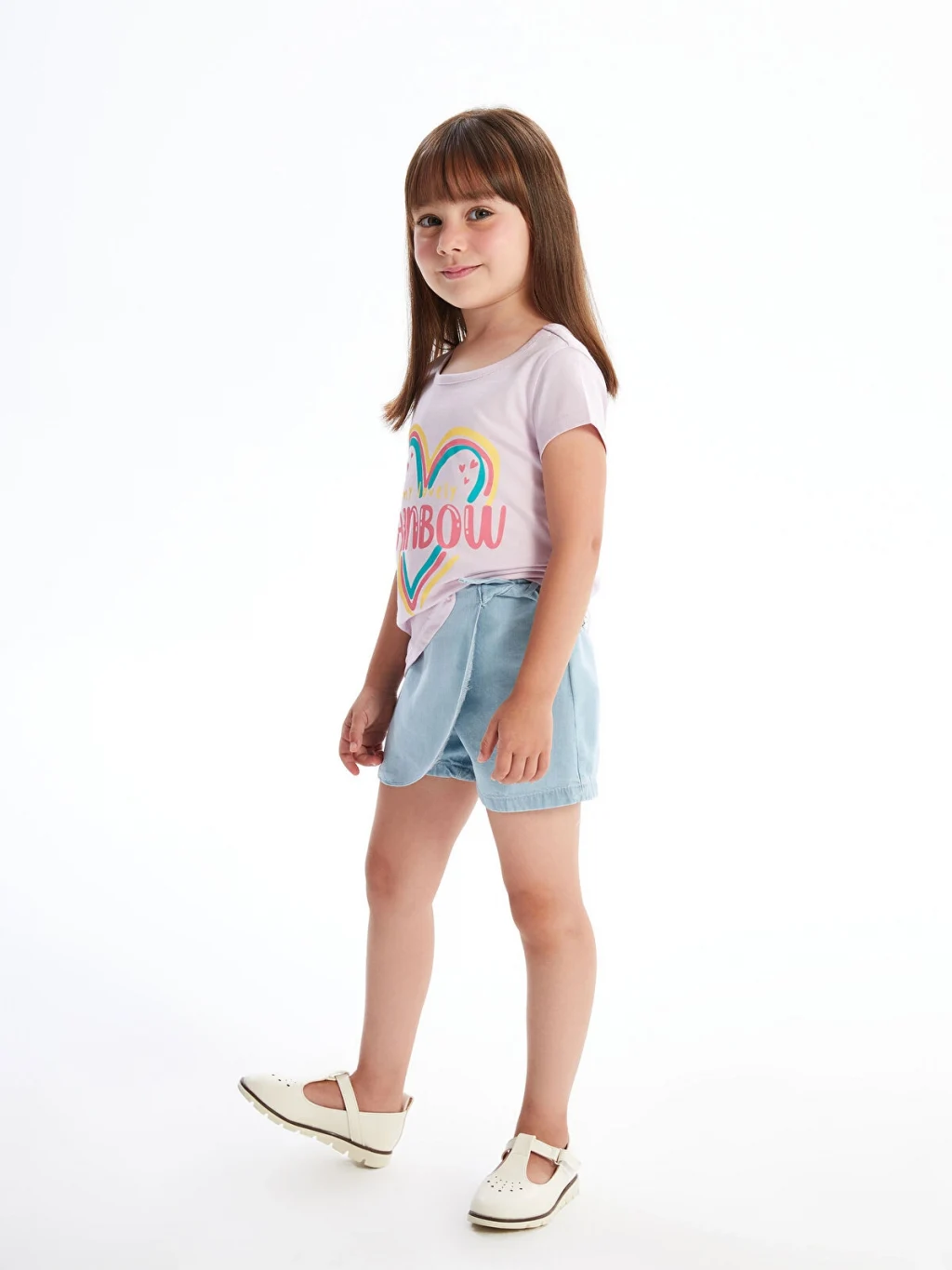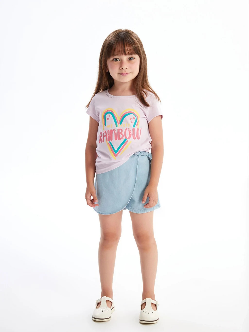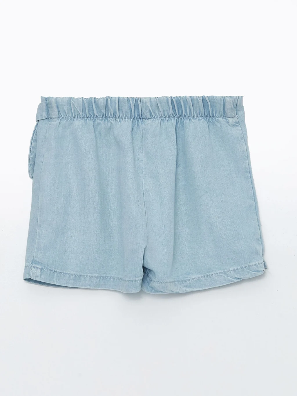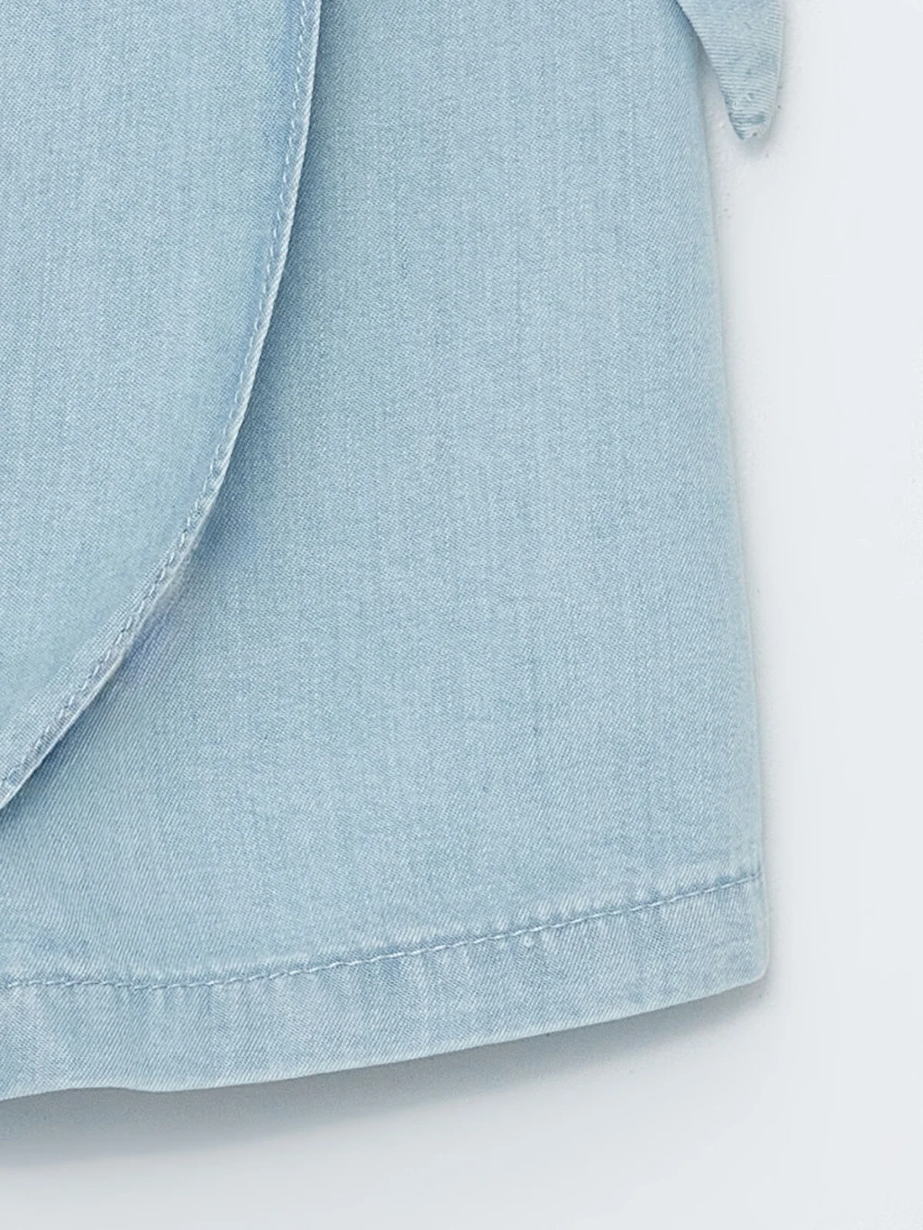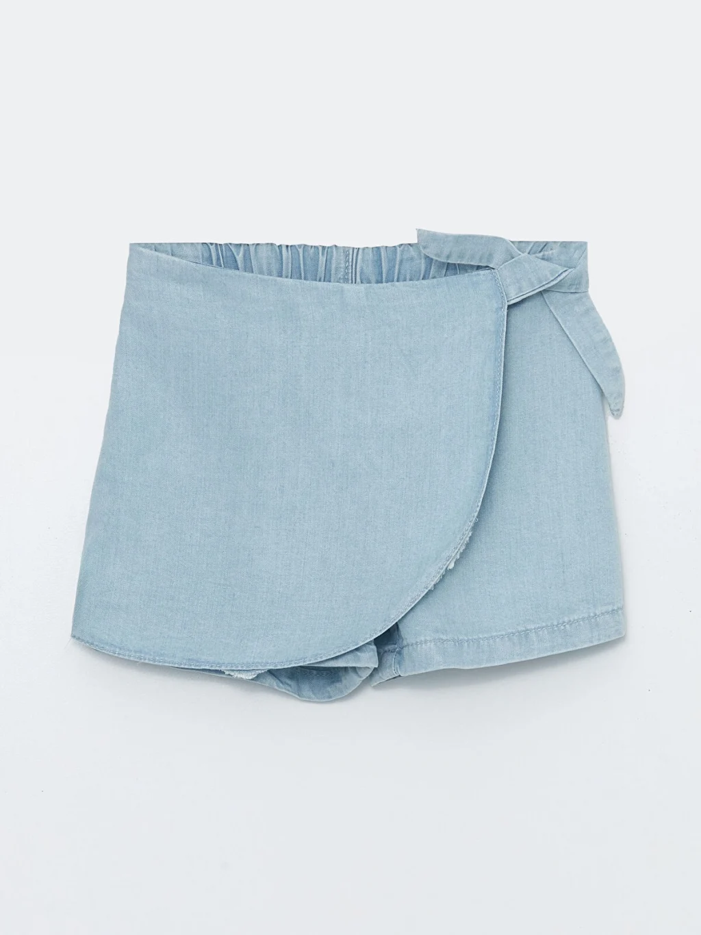 Denim kumaştan üretilen kız çocuk şort etek, beli lastiklidir. Önü anvelop kesimlidir ve yandan bağlama detayına sahiptir.
