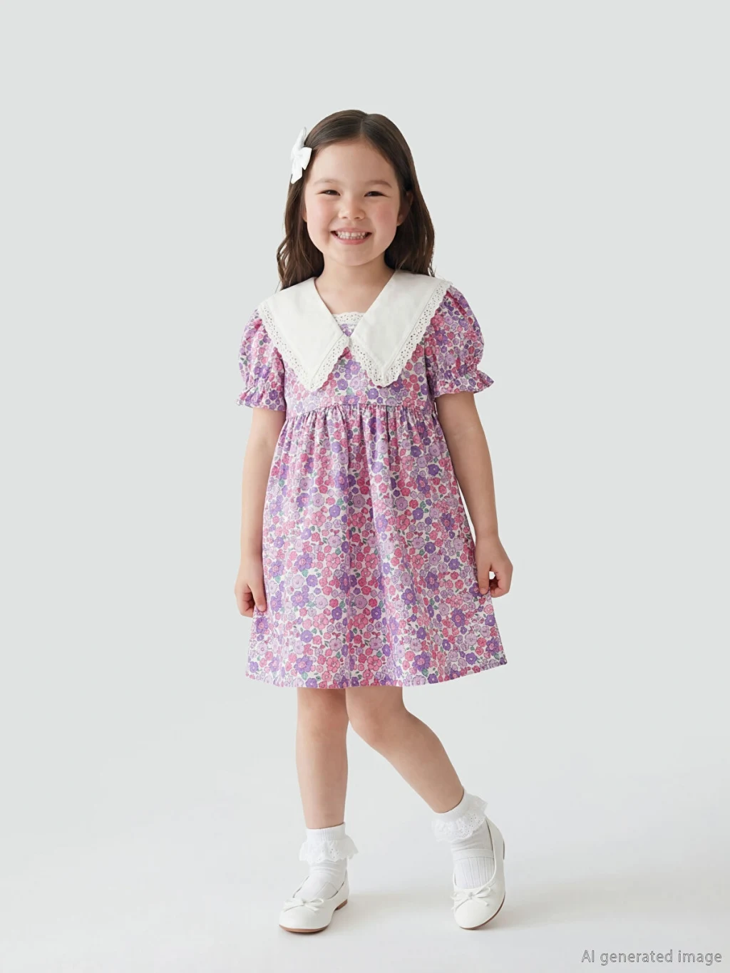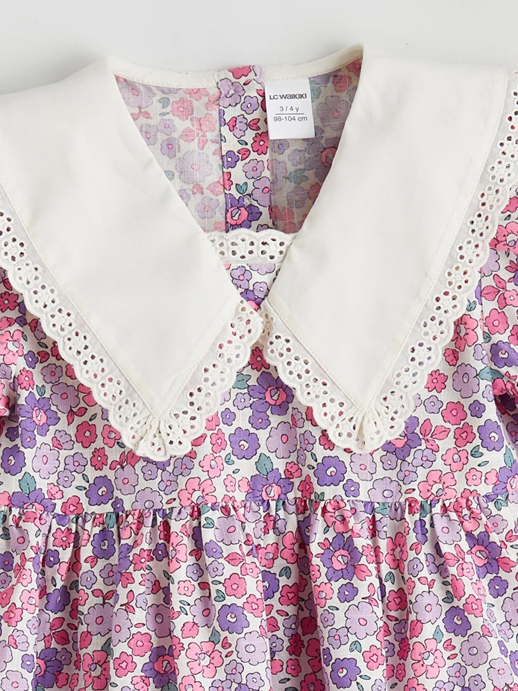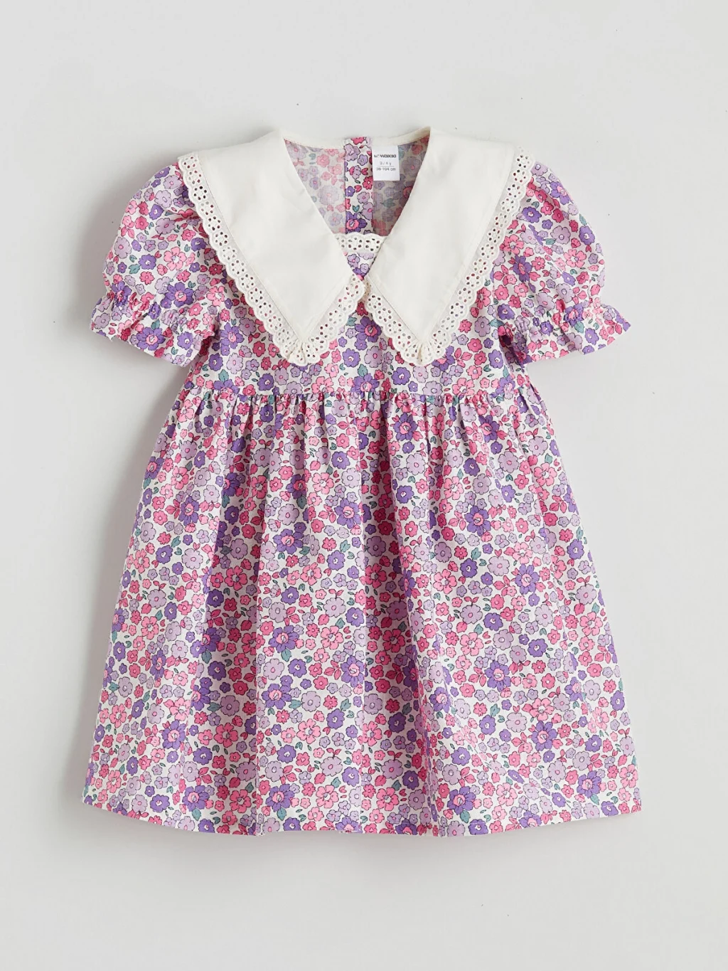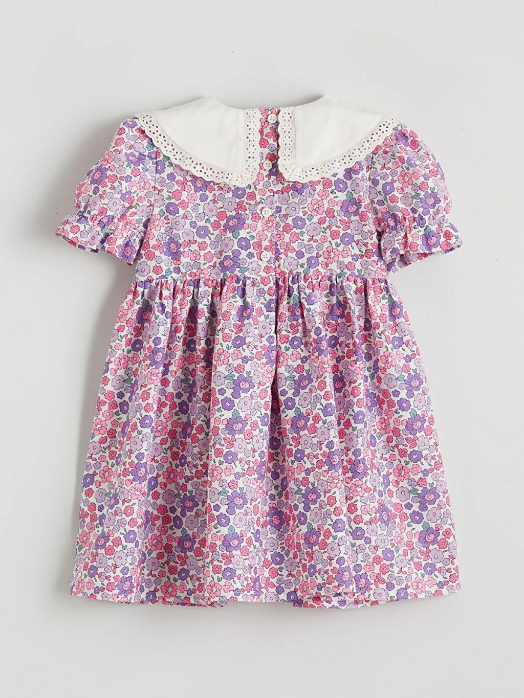 Keten kumaştan üretilmiş, çiçek desenli kız çocuk elbise, fisto detaylı bebe yakalıdır. Kısa balon kollu ve arkadan düğme kapamalıdır.