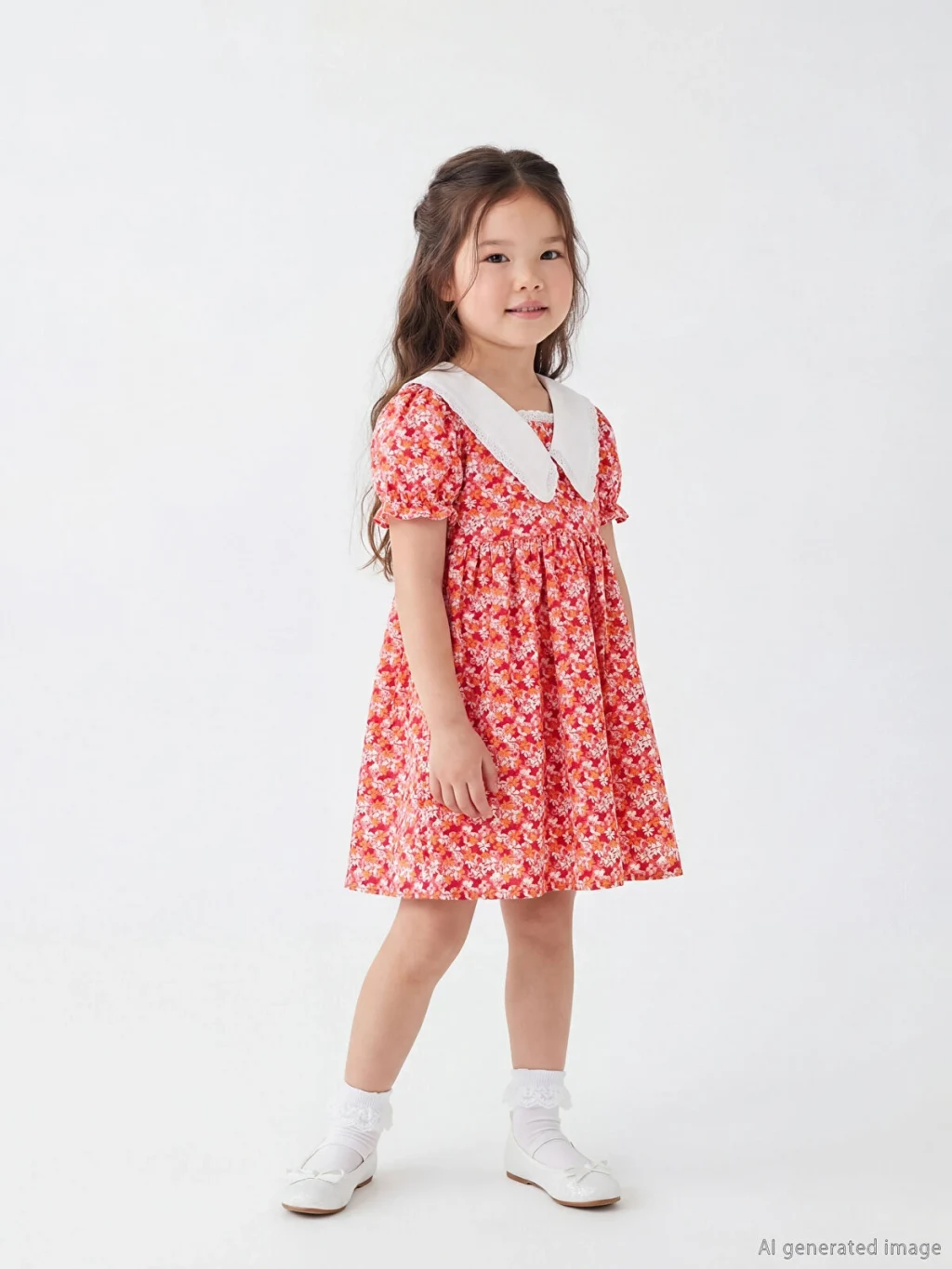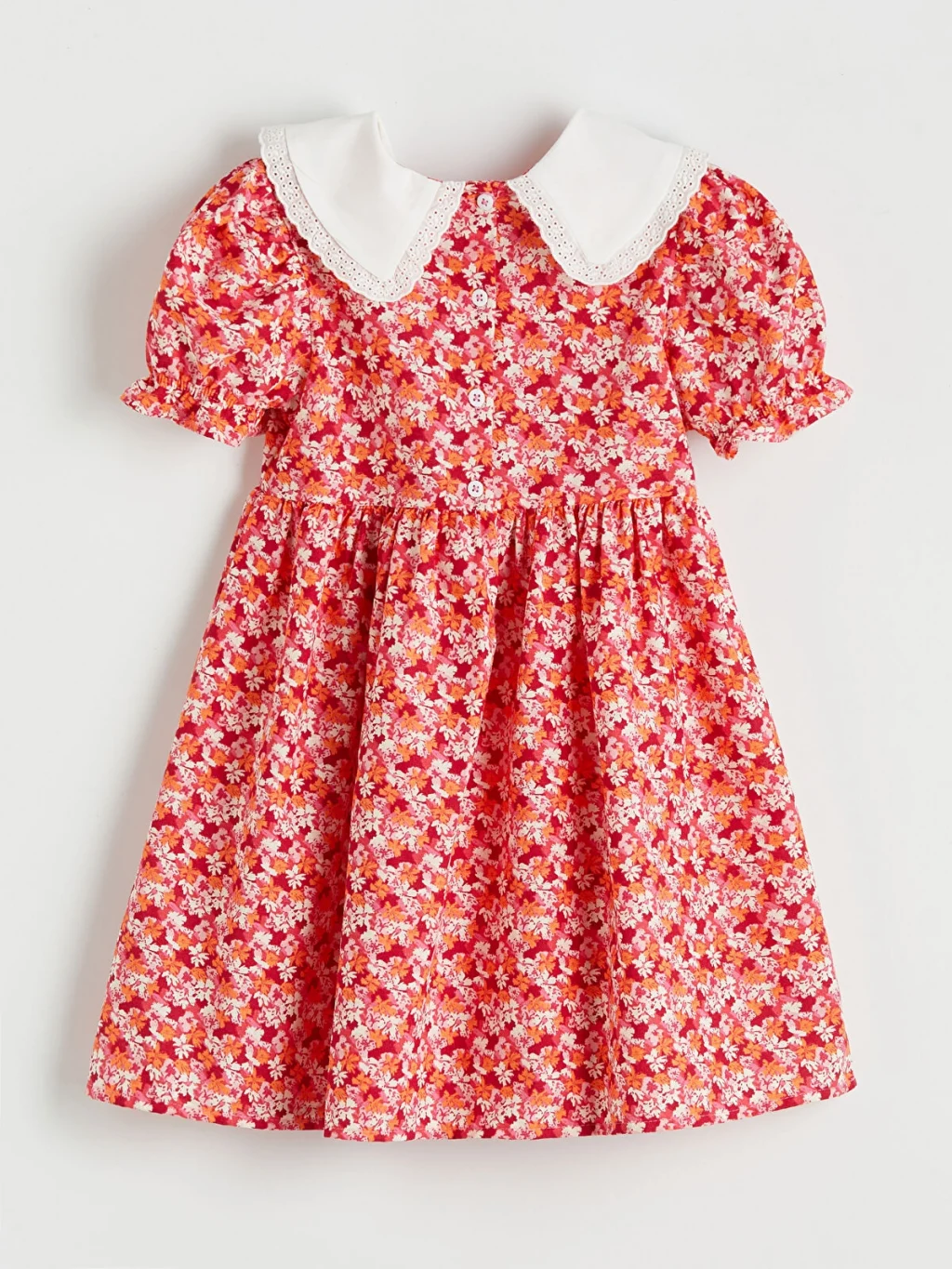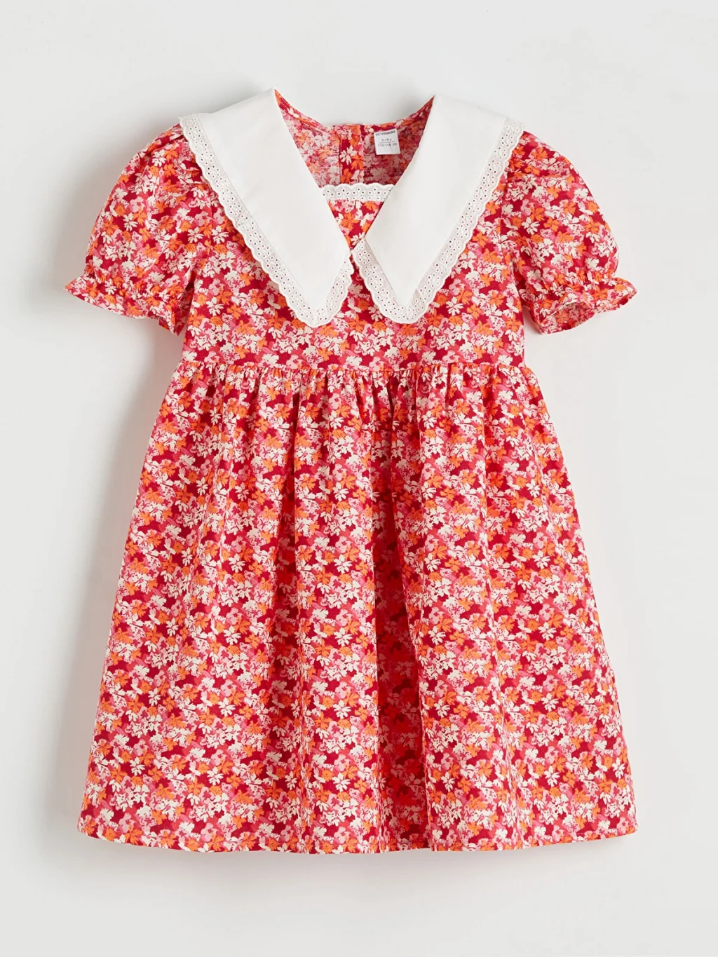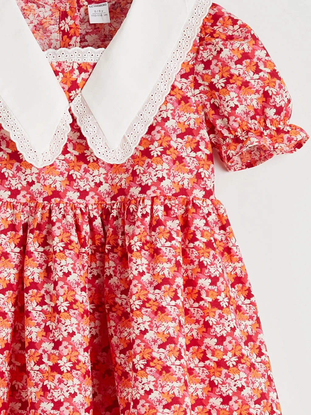 Keten kumaştan üretilmiş, çiçek desenli kız bebek elbise, dantel detaylı bebe yakalı ve kısa kolludur. Beli büzgülüdür ve arkadan düğme kapamalıdır.