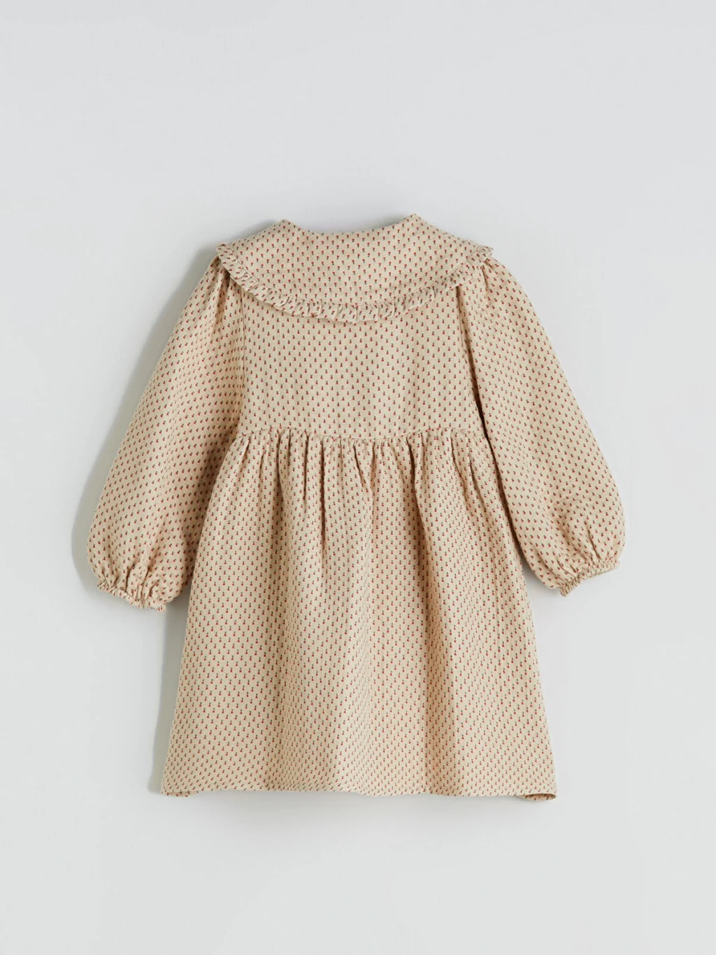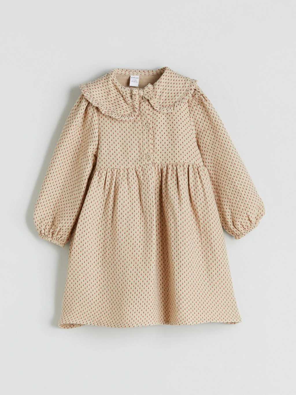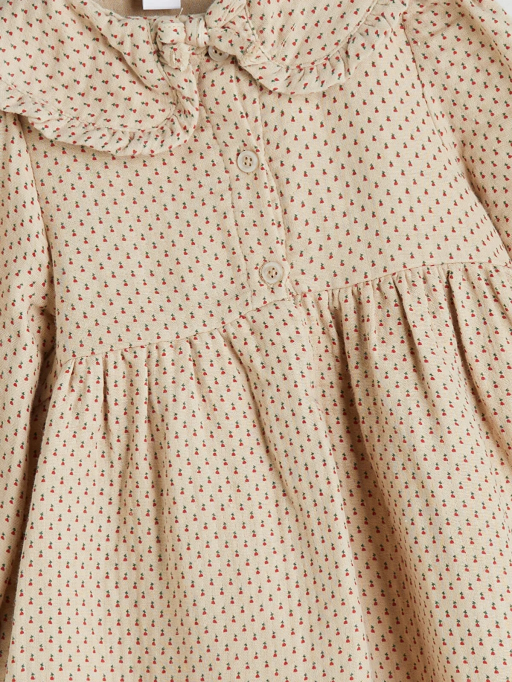 Desenli, fırfır detaylı bebe yakalı kız bebek elbise, uzun kollu ve manşetleri lastiklidir. Önden düğme kapamalı ve göğüs altından büzgülüdür.