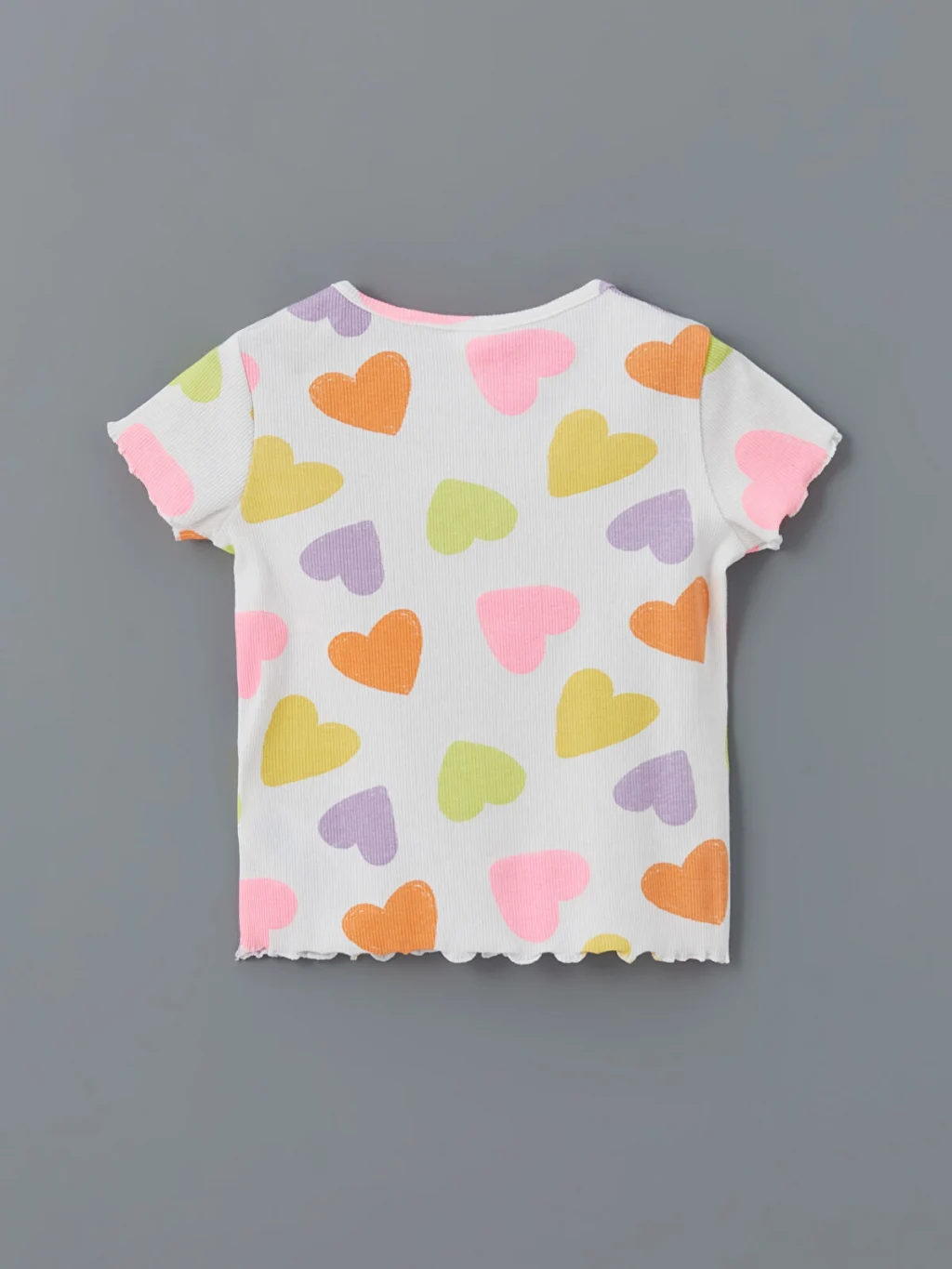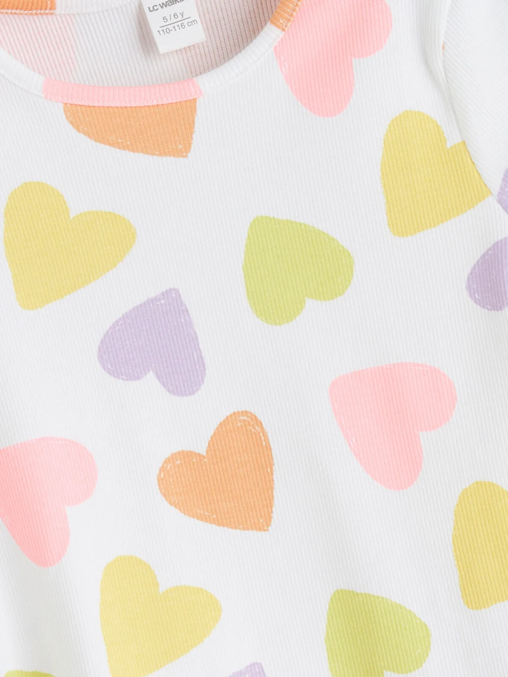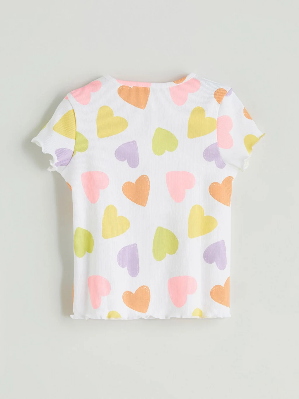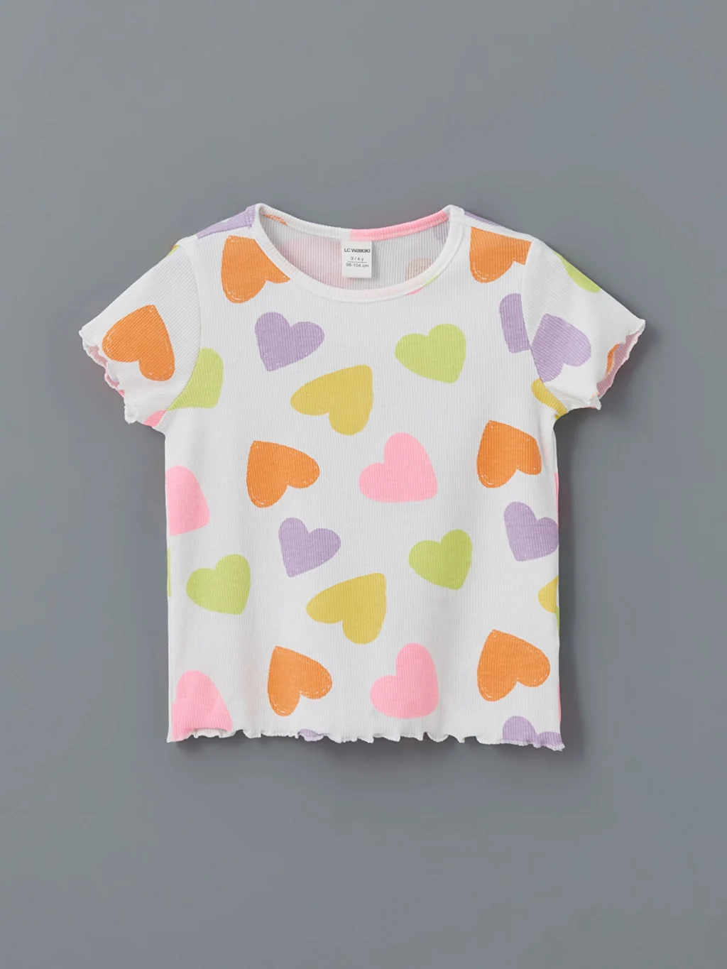 Kalp desenli kız çocuk tişört, yüksek pamuk içerikli kaşkorse kumaştan üretilmiştir. Bisiklet yakalı, kısa kollu ve dar kalıplıdır. Kol ve etek uçları kıvrımlı kenarlıdır.