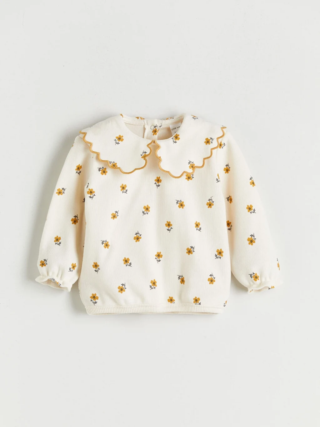 Kız bebek takım, çiçek desenli, bebe yakalı ve uzun kollu üst ile fitilli ispanyol paça pantolondan oluşur. Enseden düğme kapamalıdır.