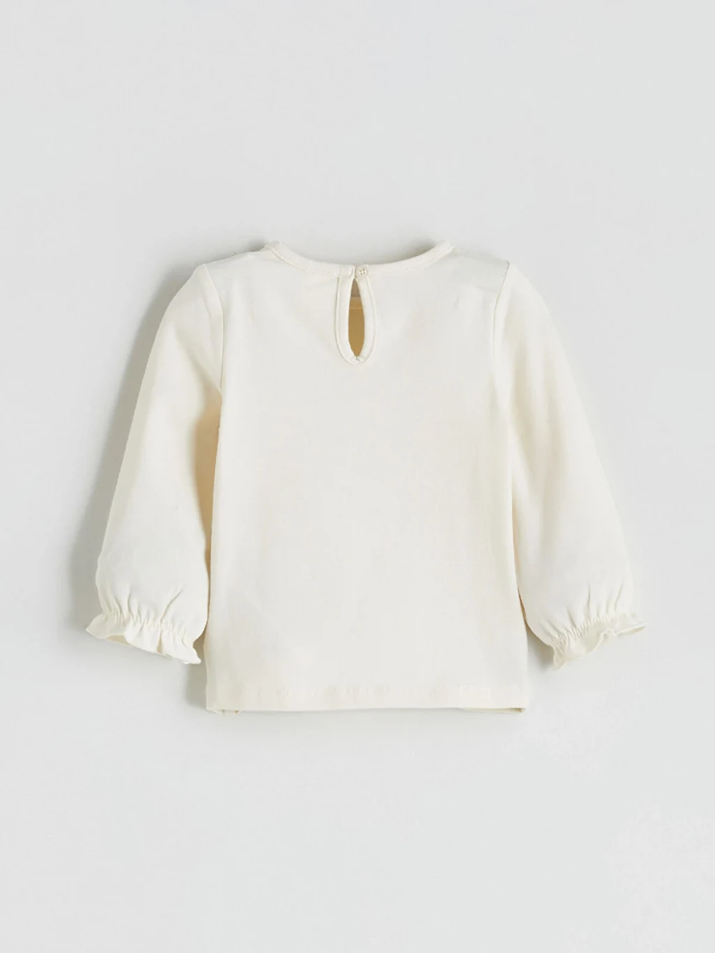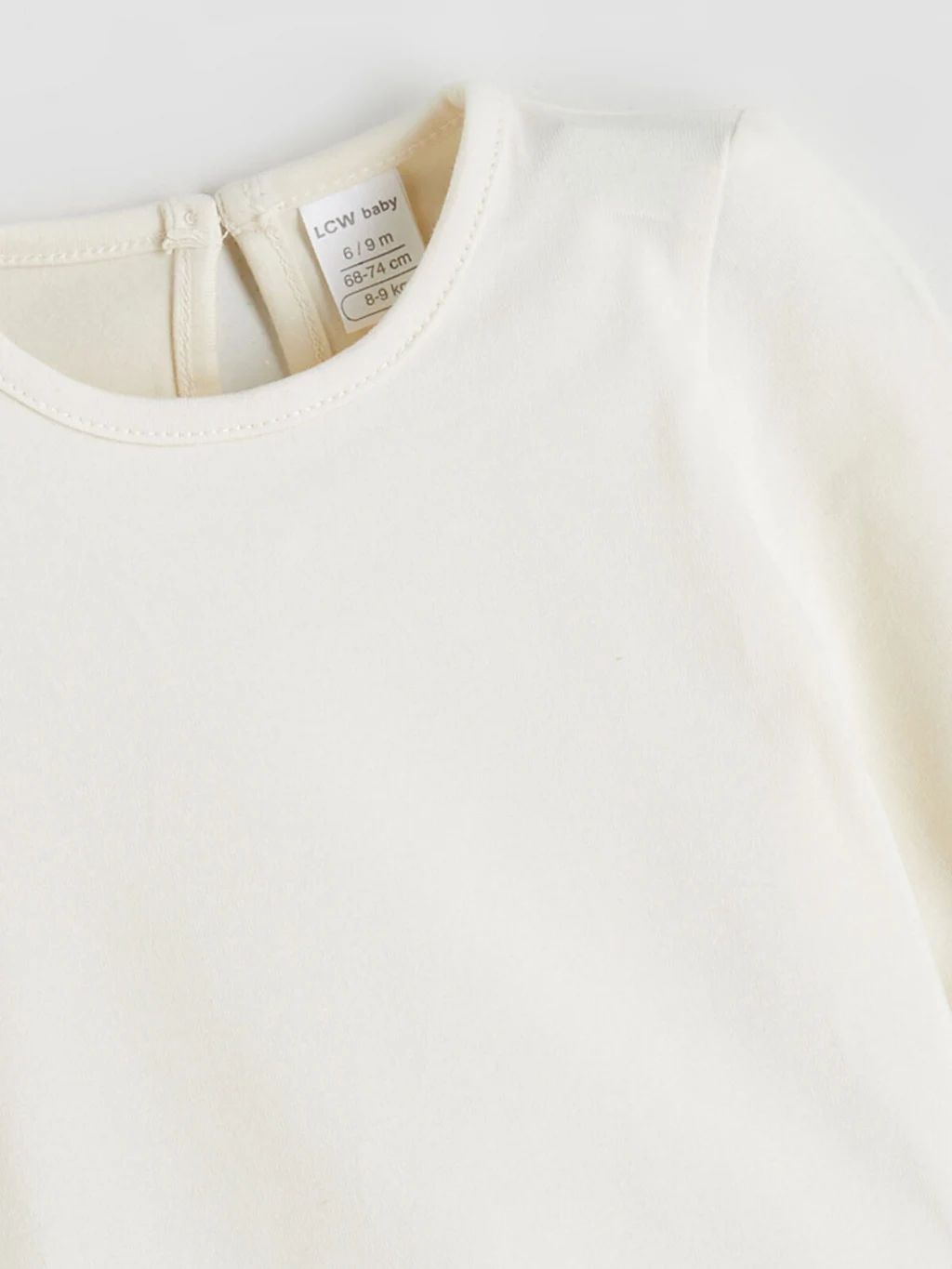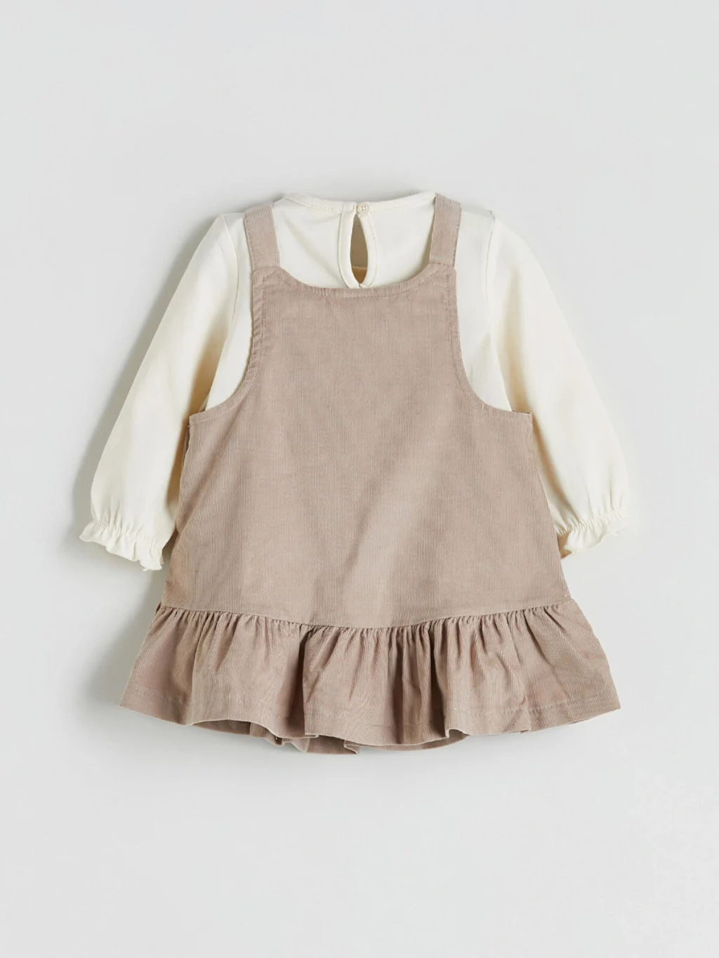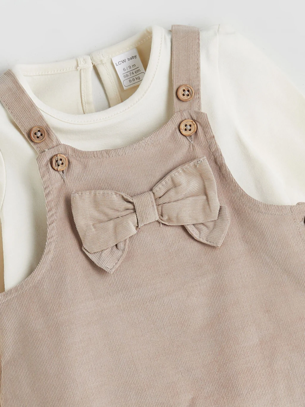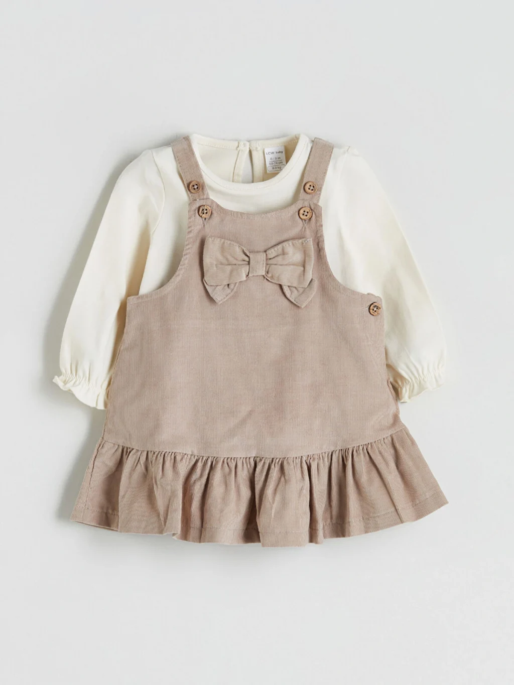 Kız bebek takımı, uzun kollu bluz ve fiyonk detaylı askılı kadife elbiseden oluşur. Elbise düğme kapamalı ve fırfır detaylıdır.