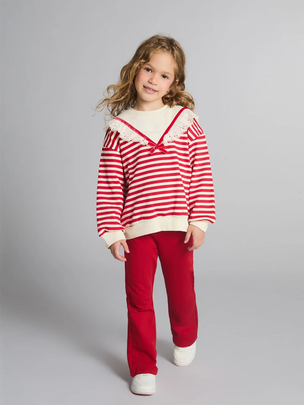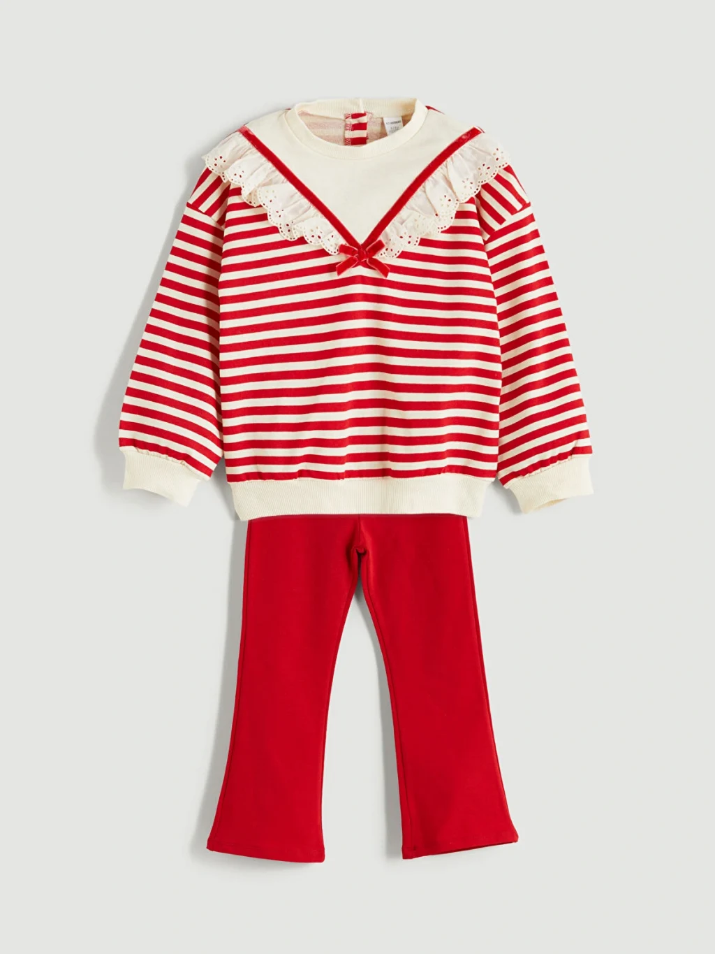 Bisiklet yaka çizgili kız bebek sweatshirt ve tayt 2'li takım, 3 iplik şardonlu kumaştan üretilmiştir. Takımın dayanıklılığını artırır ve uzun süreli kullanım sağlar. Taytın esnek yapıs bebeğinizin hareket özgürlüğünü kısıtlamadan rahat etmesini sağlar.