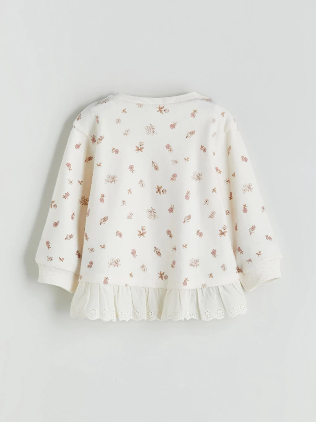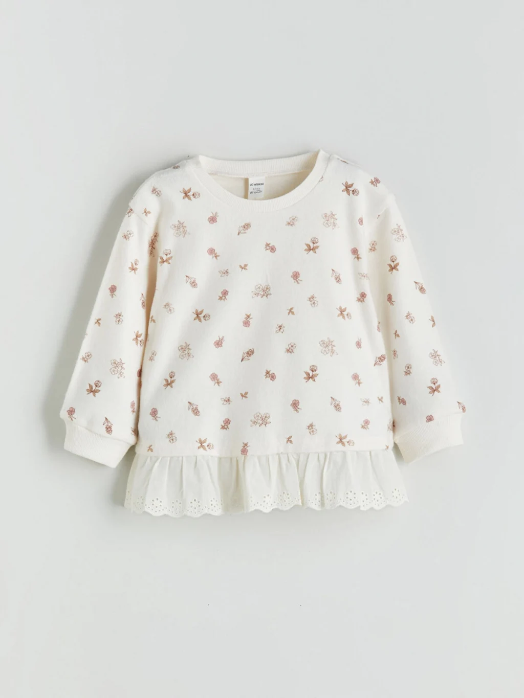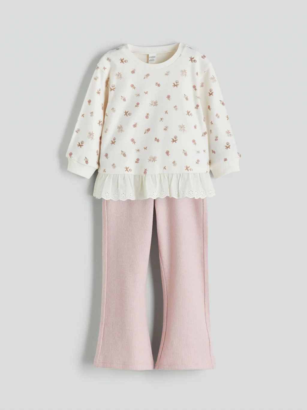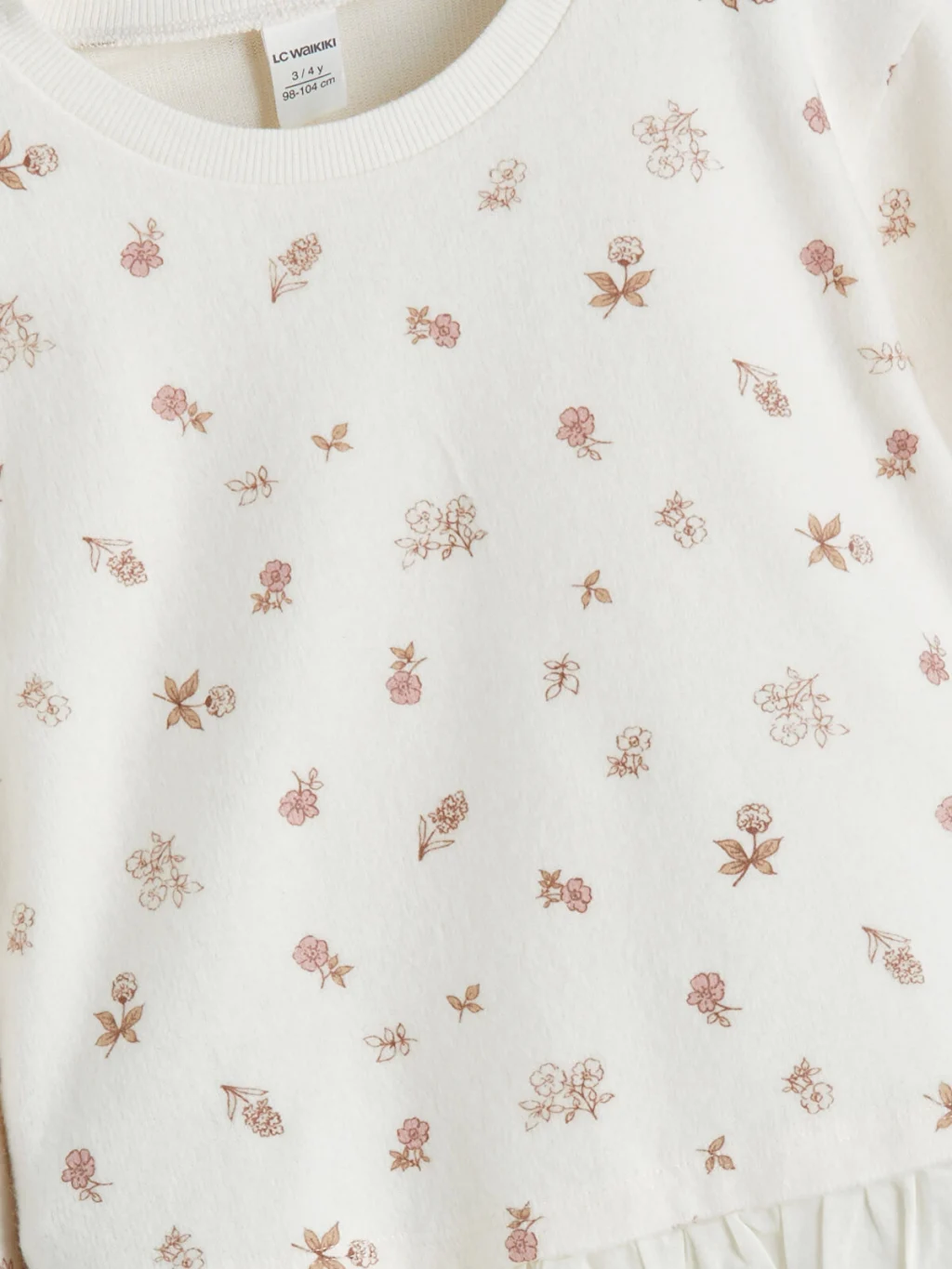 Kız çocuk takım, bisiklet yaka, uzun kollu, çiçek desenli, etek ucu fırfırlı ve brode detaylı sweatshirt ile ispanyol paça tayttan oluşur.