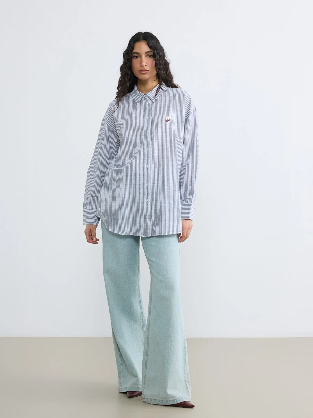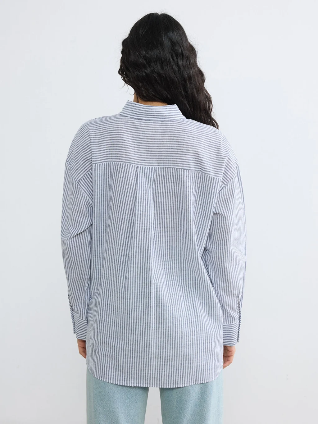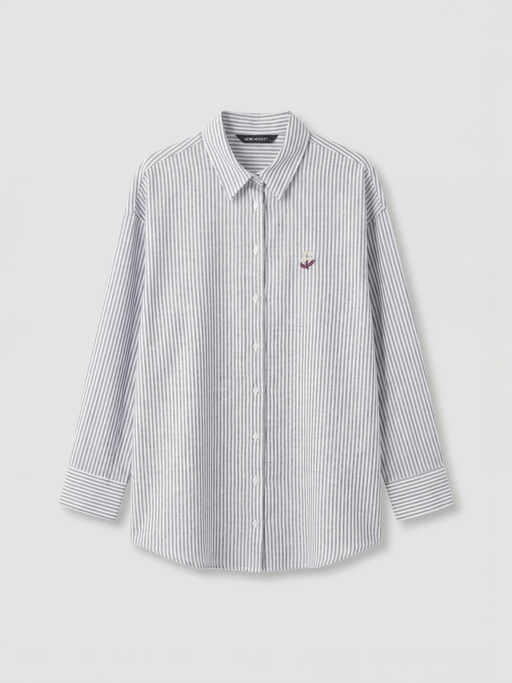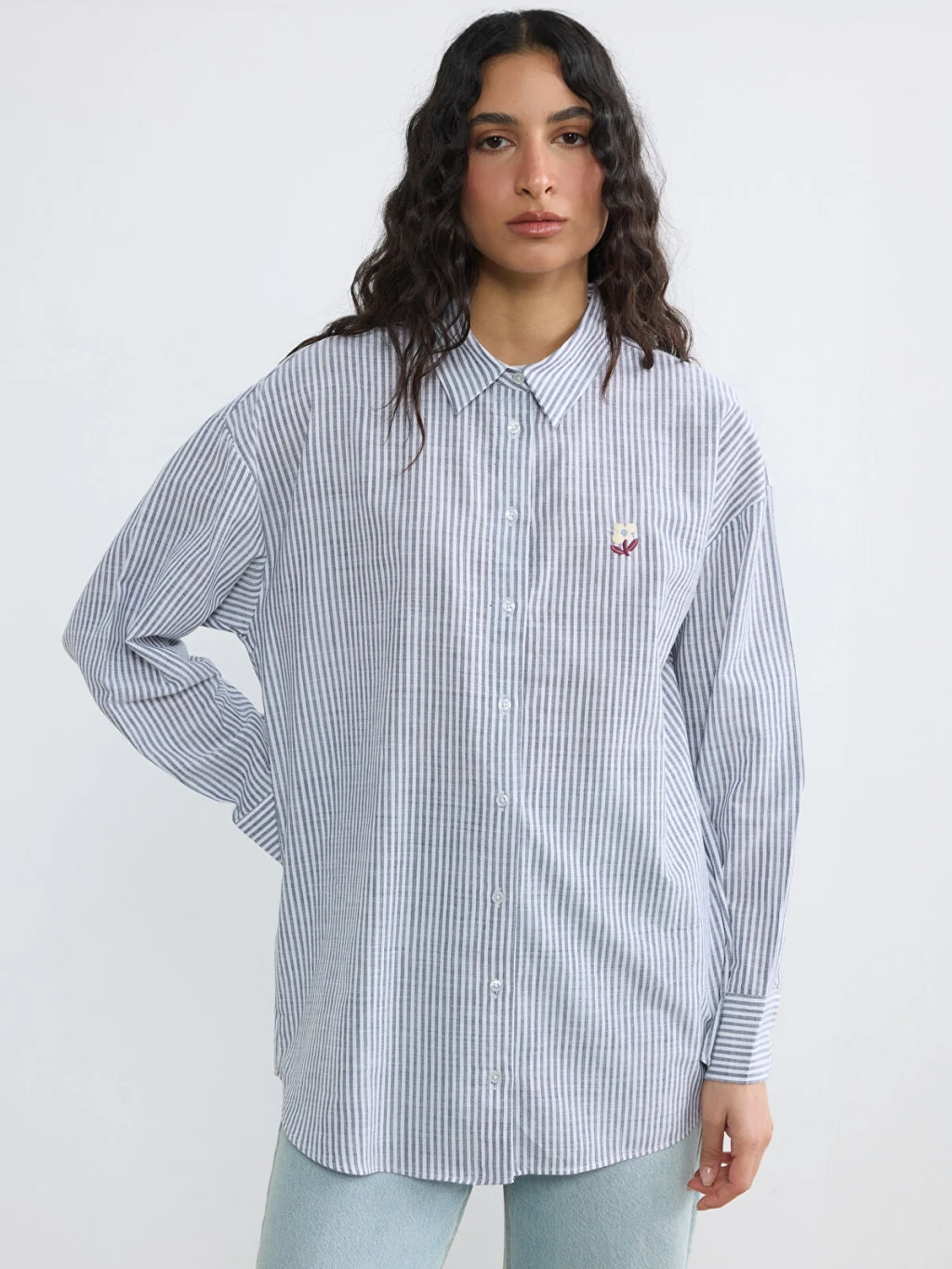Uzun kollu ve çizgili desenli kadın gömlek tunik, %100 pamuk kumaştan üretilmiştir. Önden düğme kapamalıdır ve nakış detayı bulunur.