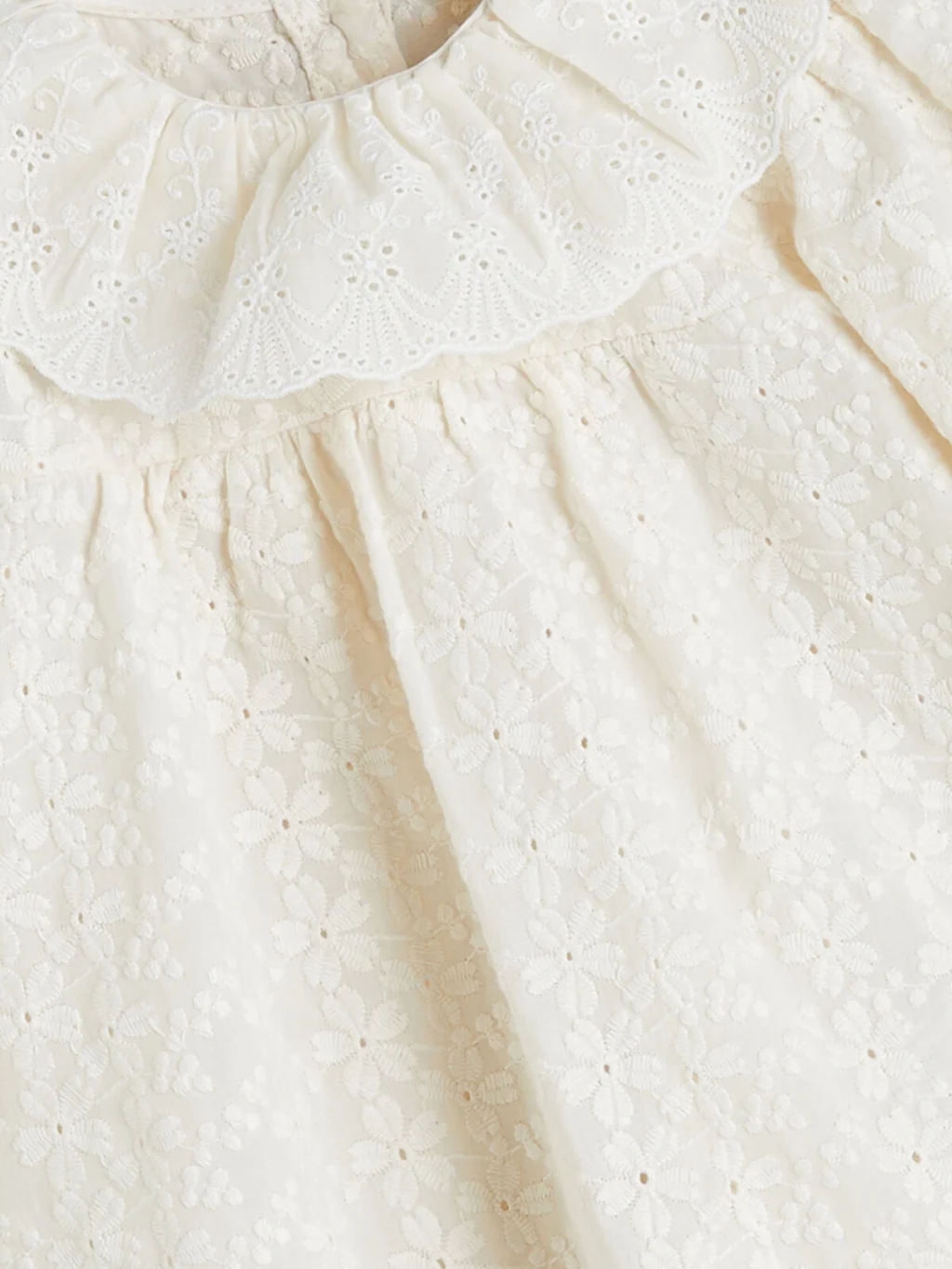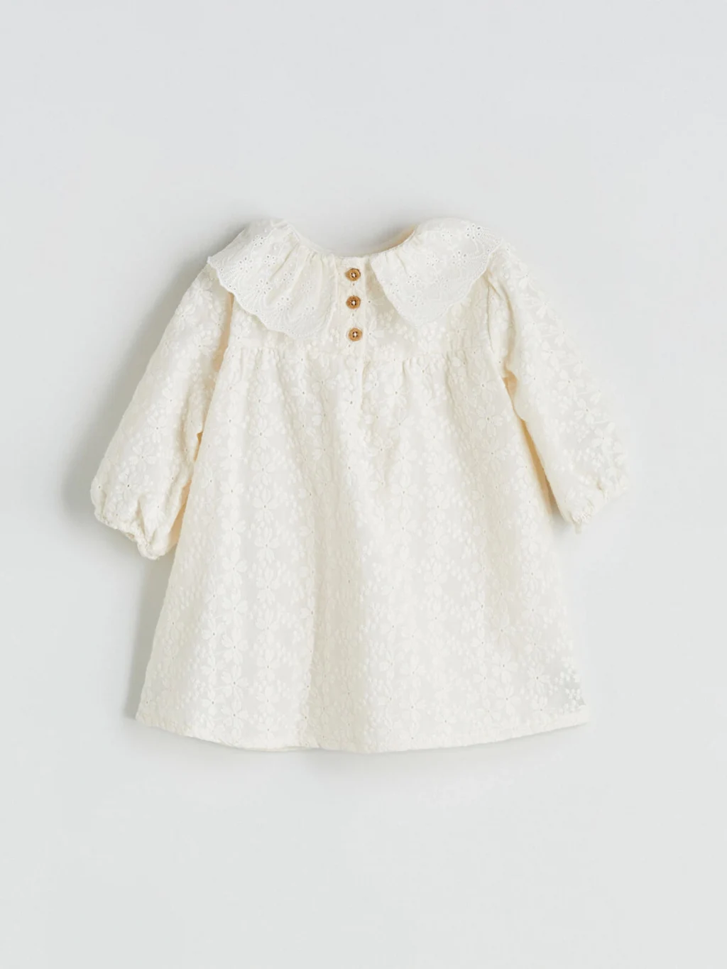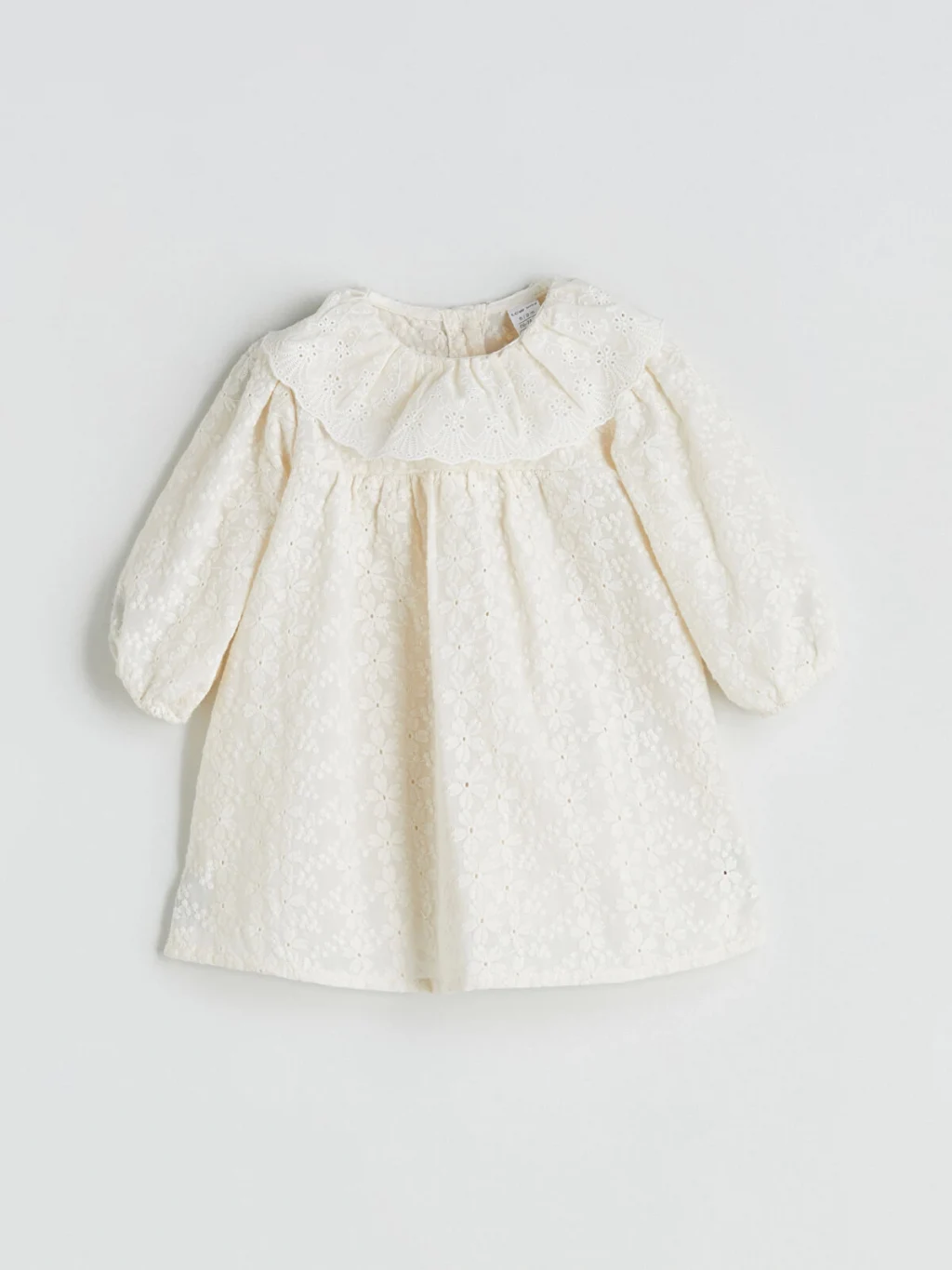Fırfırlı ve fisto işlemeli bebe yakalı kız bebek elbise, uzun kollu ve kol ucu lastiklidir. Arkadan düğme kapamalıdır.