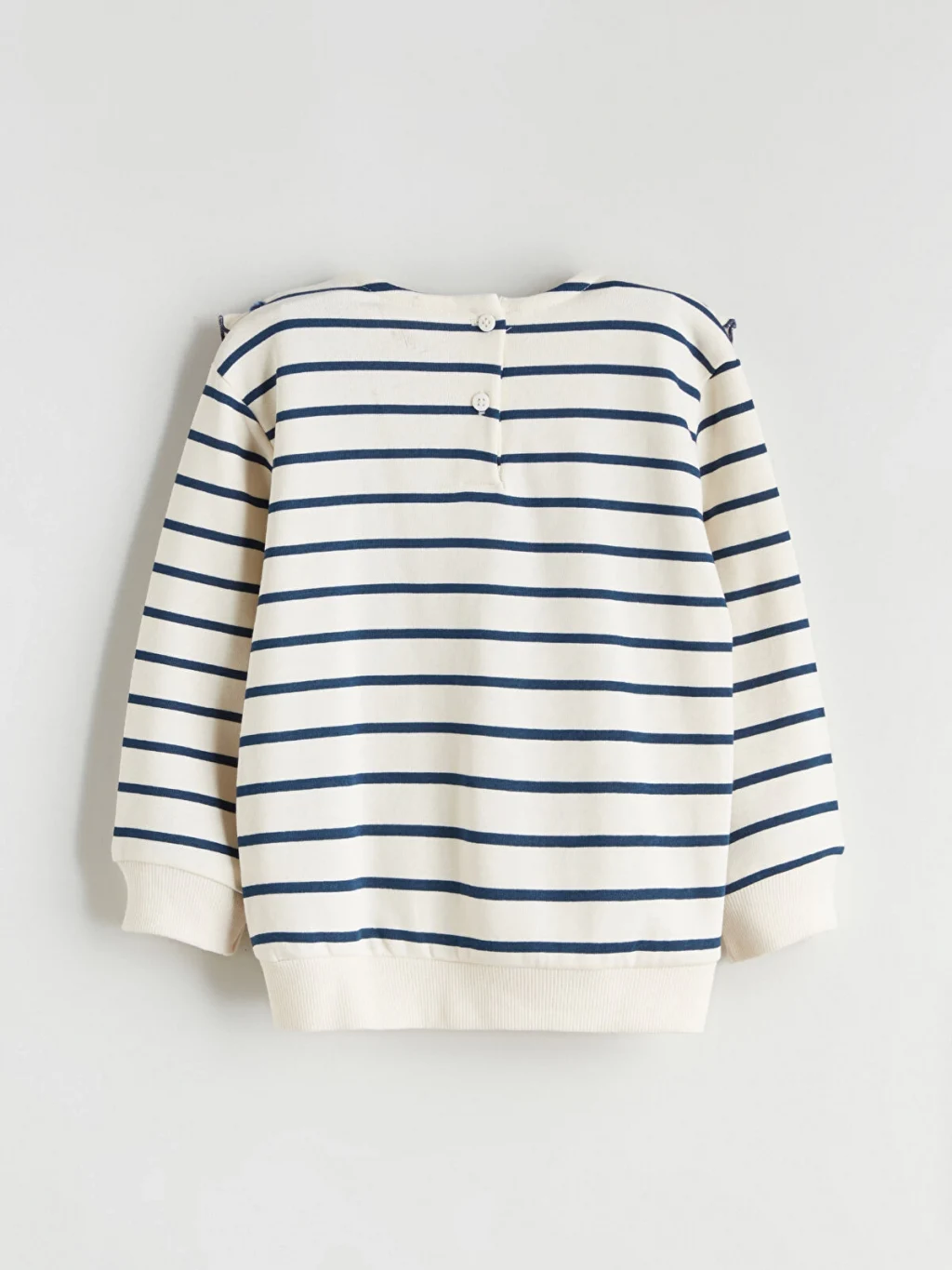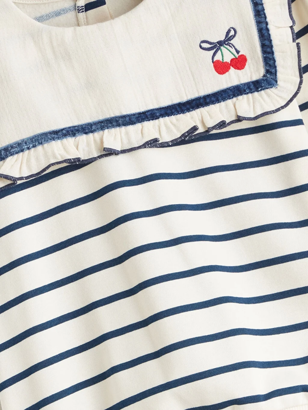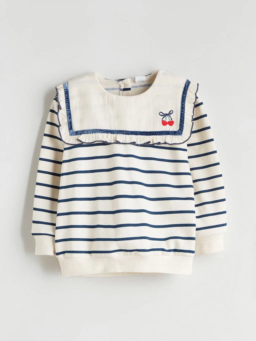 3 iplik şardonlu kumaşlı kız çocuk takım; fırfırlı, işlemeli denizci yakalı, çizgili sweatshirt ve İspanyol paça pantolondan oluşur.