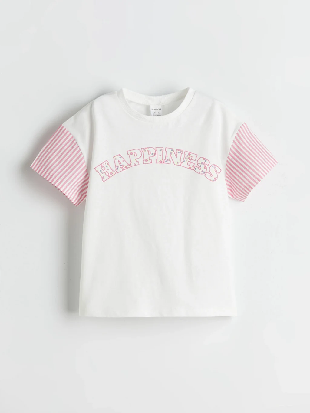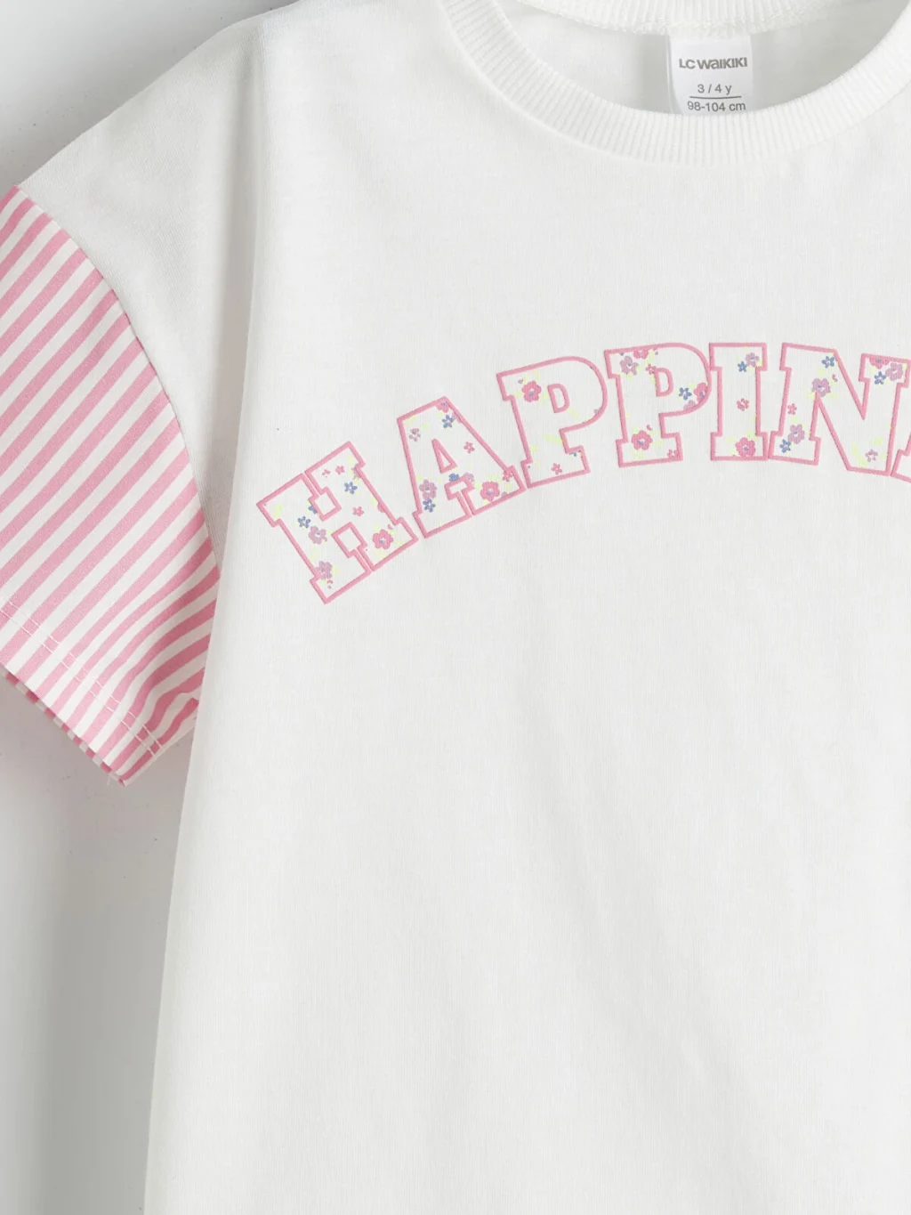 Bisiklet yakalı kız çocuk tişört, %100 pamuklu penye kumaştan üretilmiştir. Kısa kolları çizgili, önü desenli yazı baskılı tasarıma sahiptir.