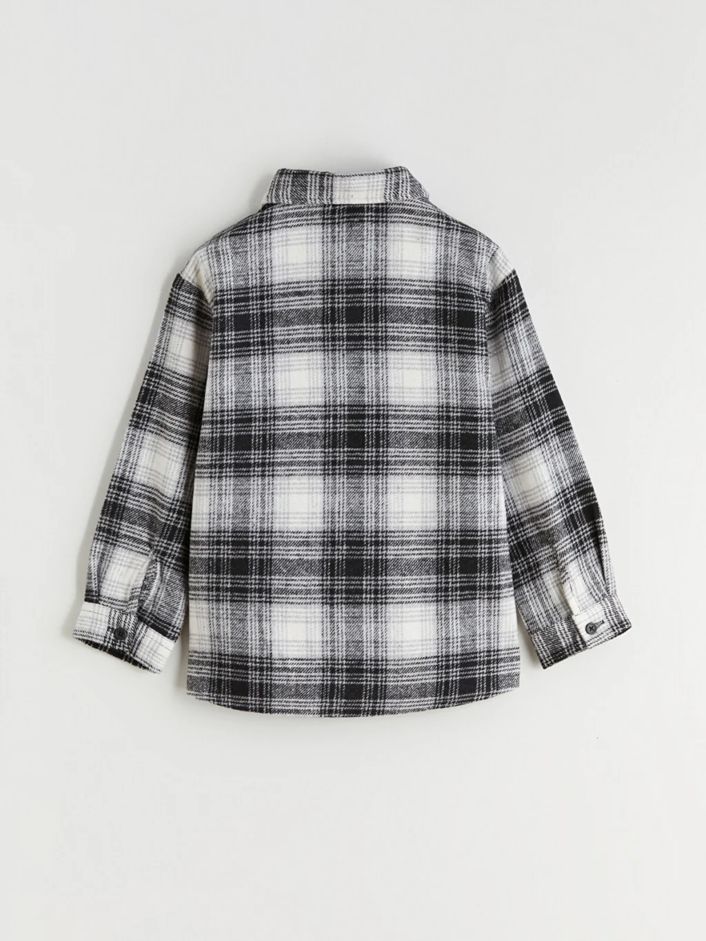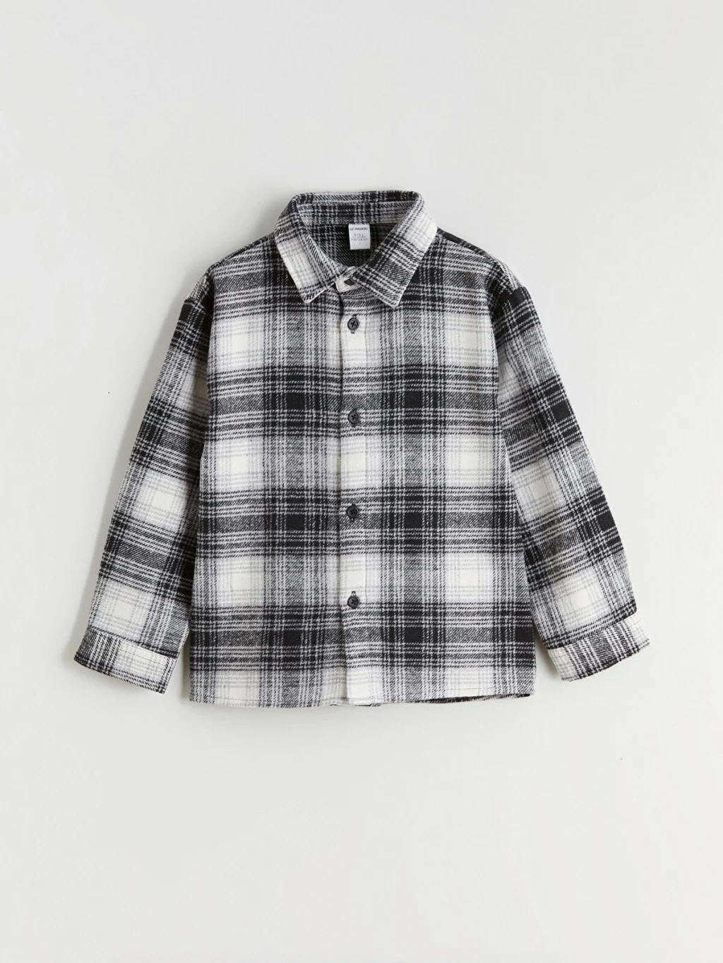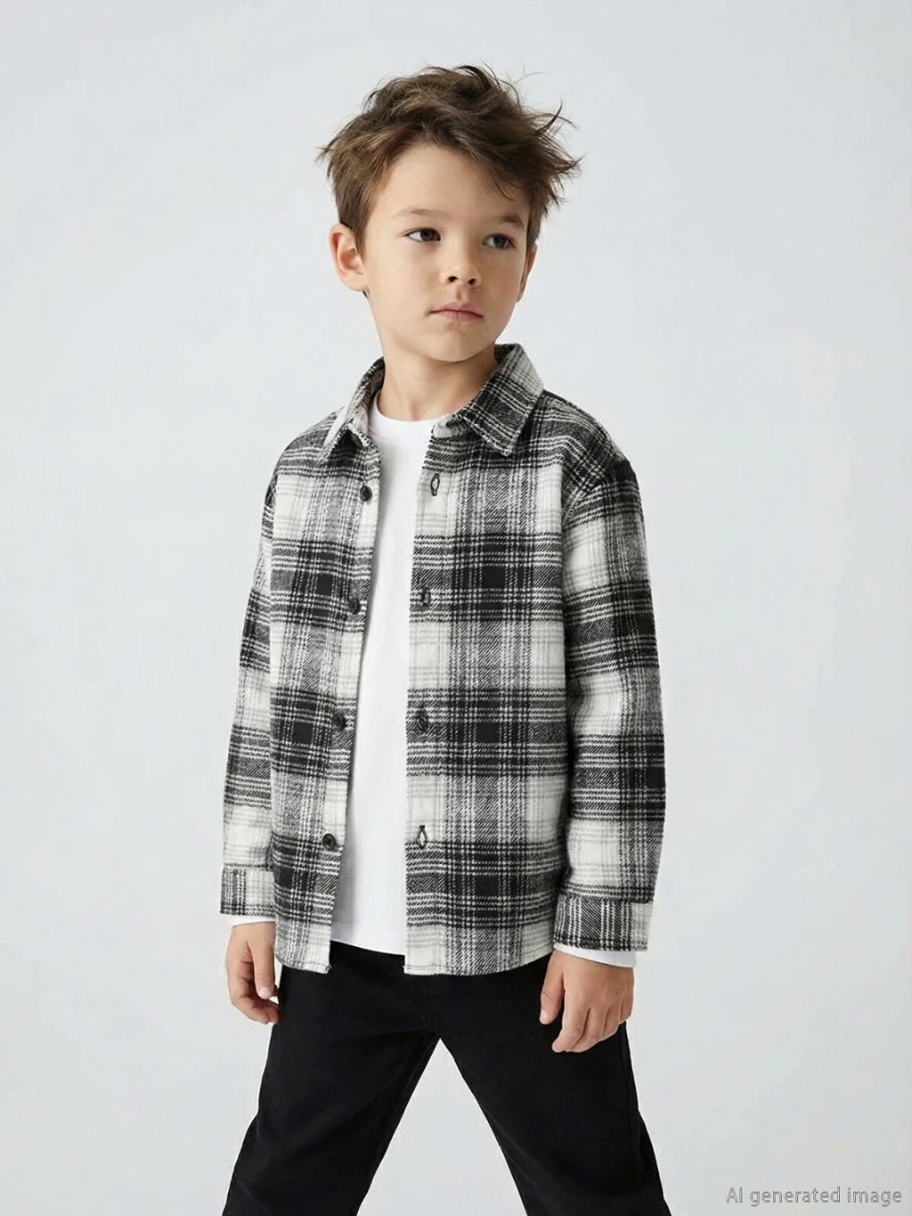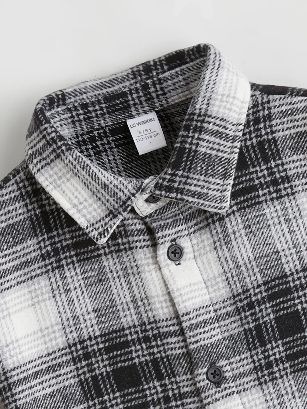 Gömlek yakalı ve uzun kollu erkek çocuk gömlek, ekose desenlidir ve önden düğme kapamalı bir tasarıma sahiptir.