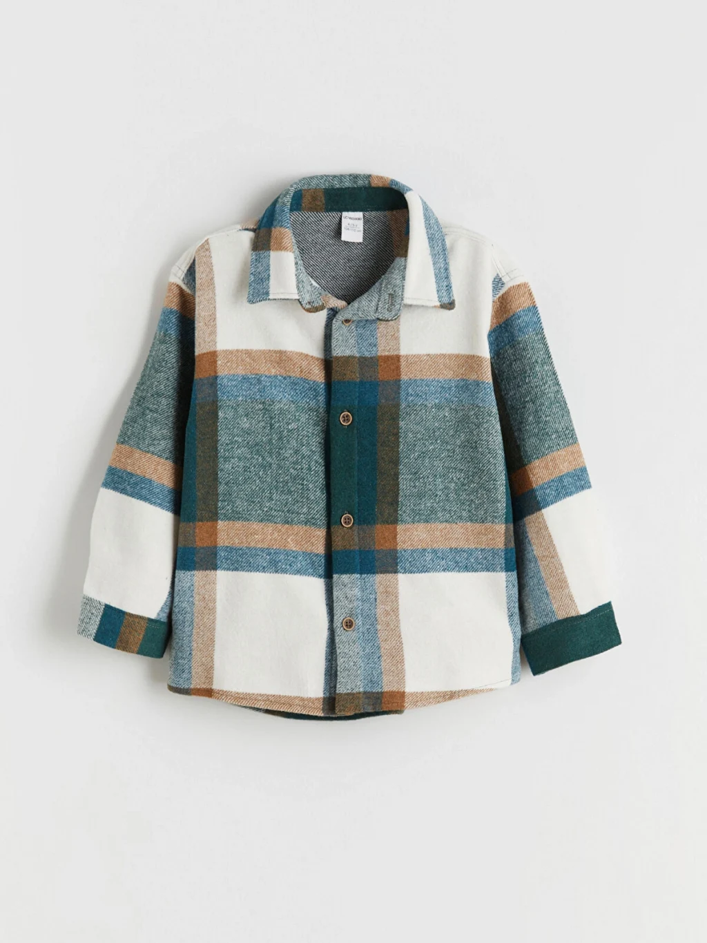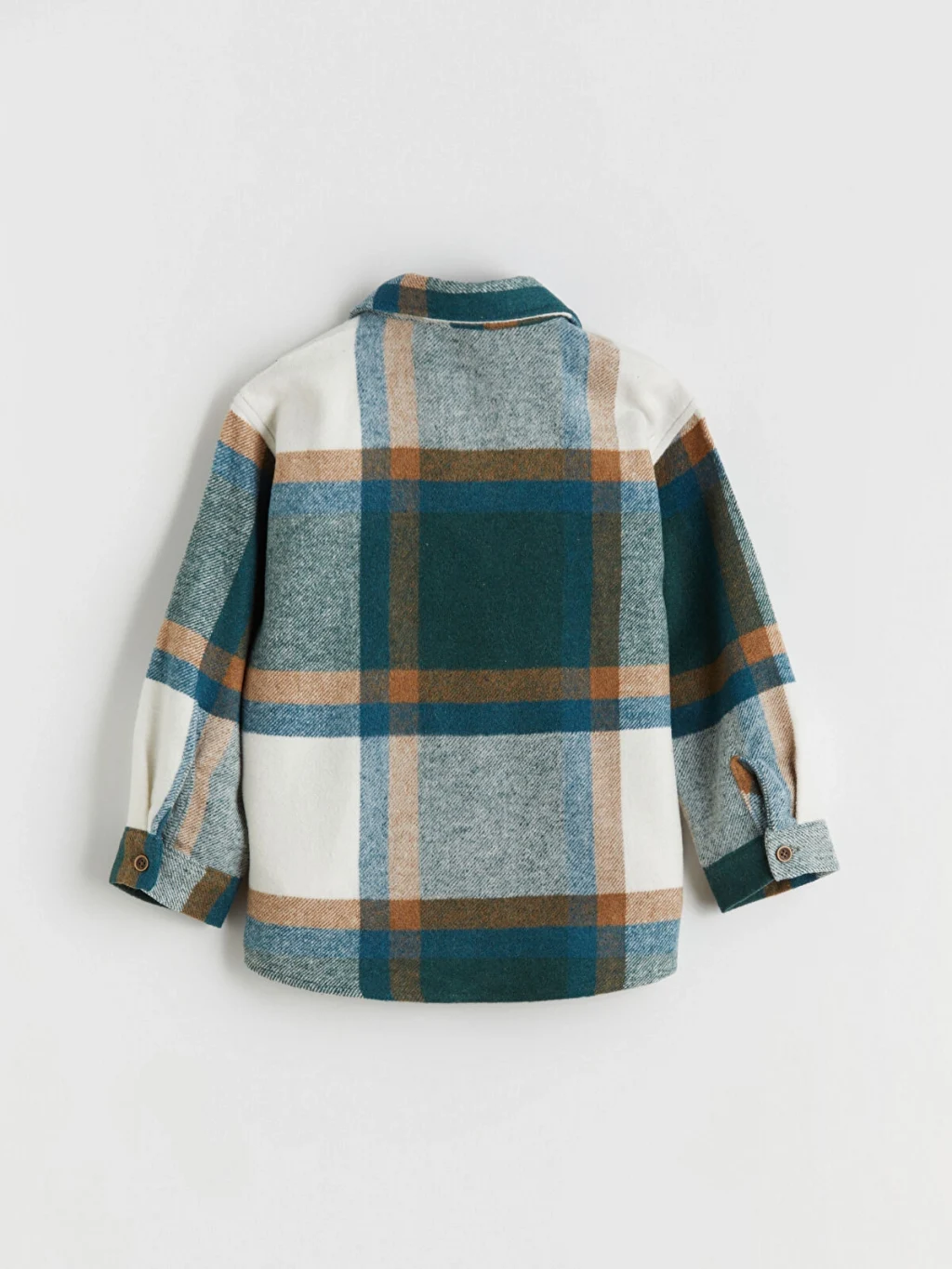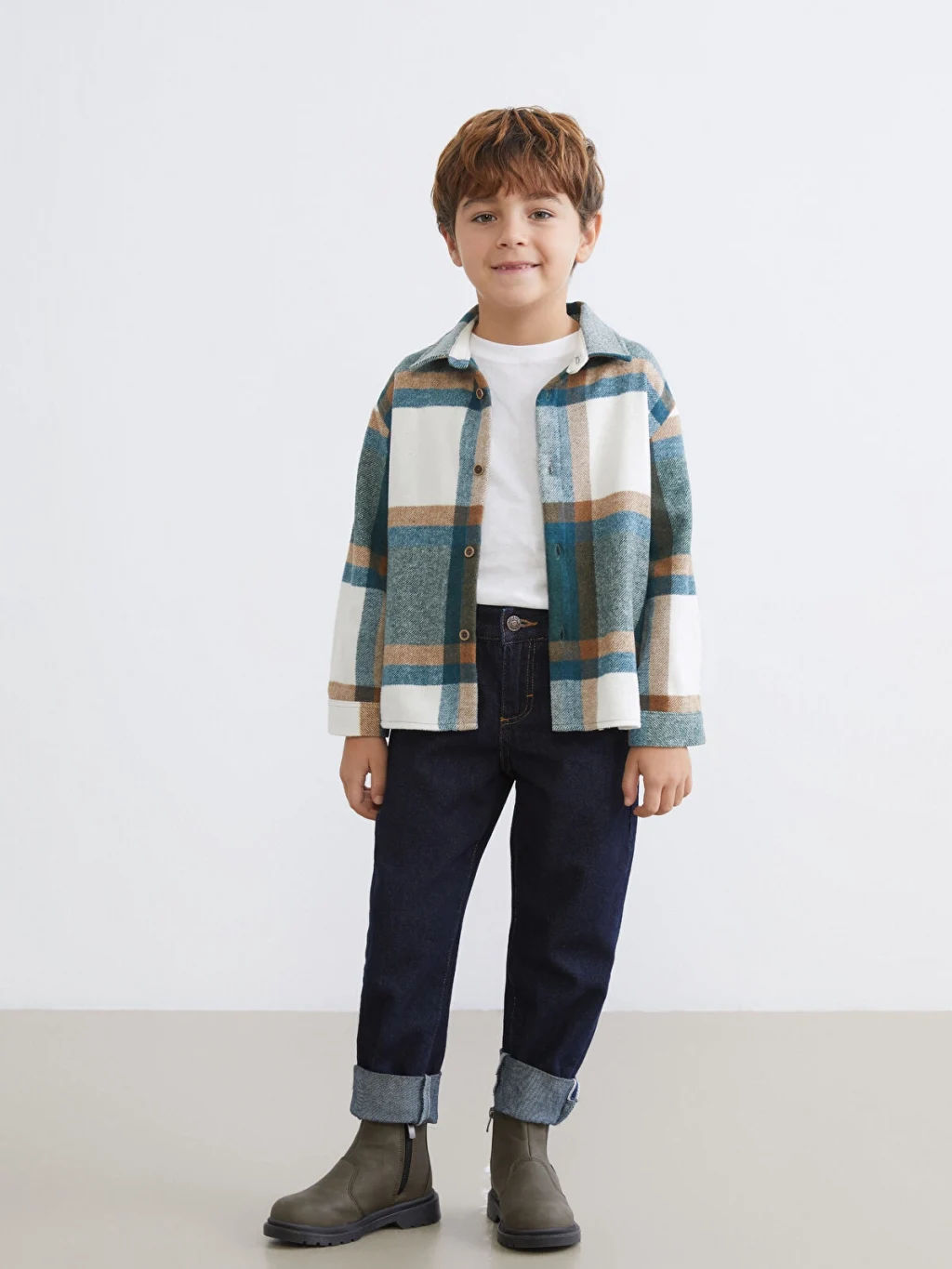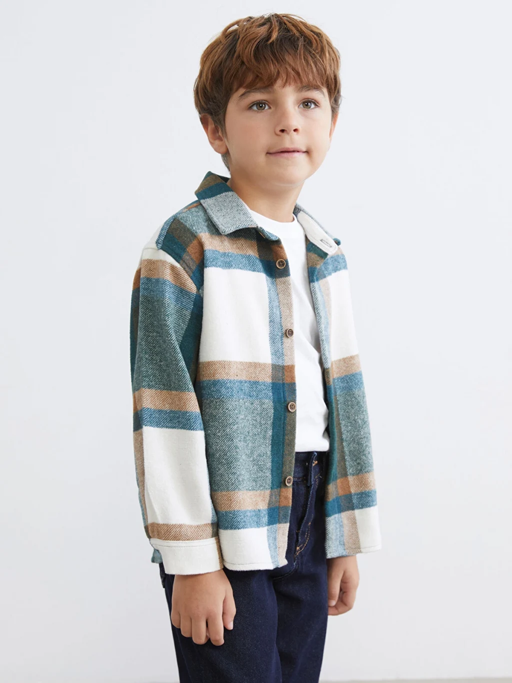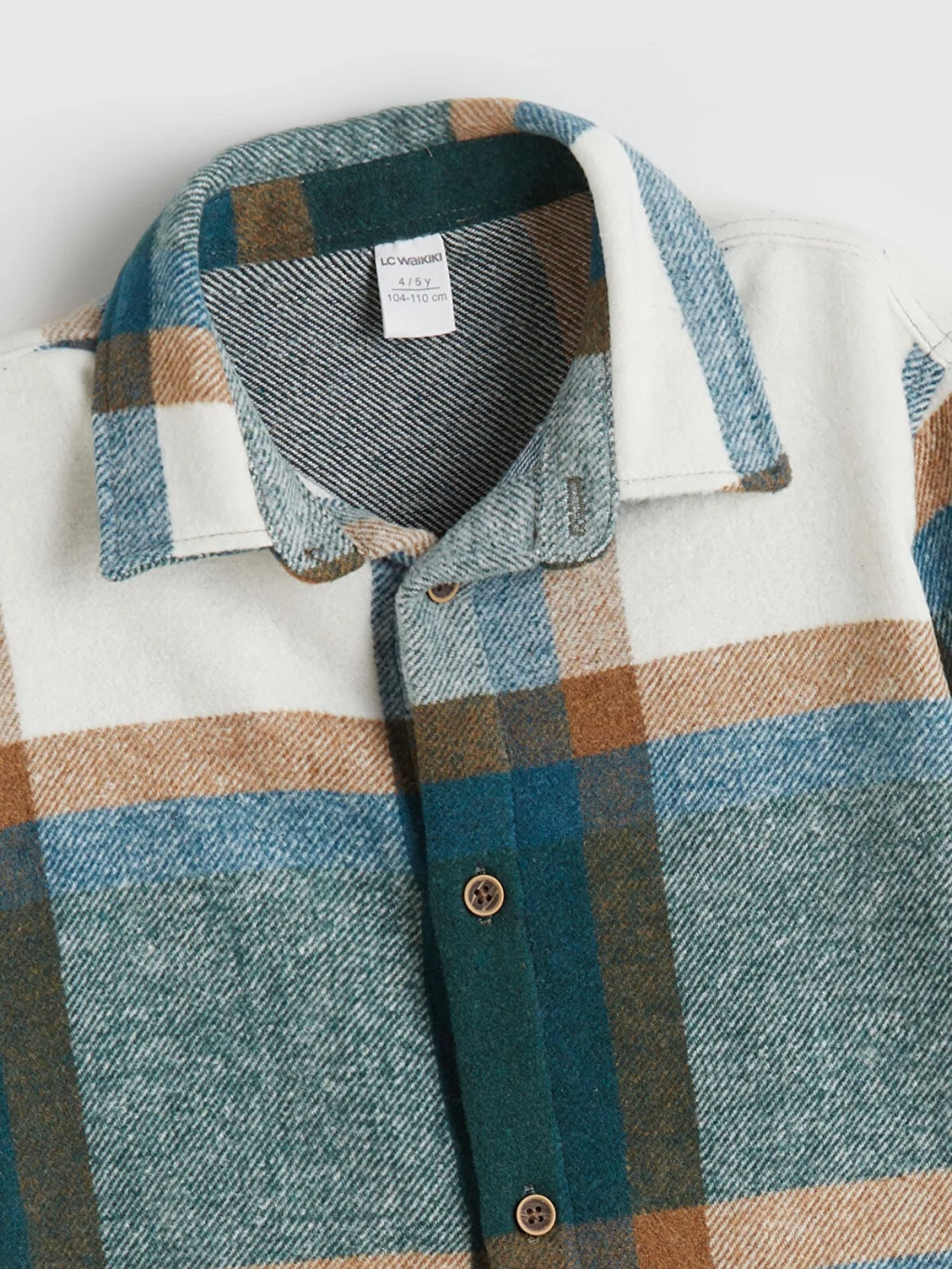Kareli desenli, gömlek yakalı ve uzun kollu erkek çocuk gömlek, önden düğme kapamalı olarak tasarlanmıştır.