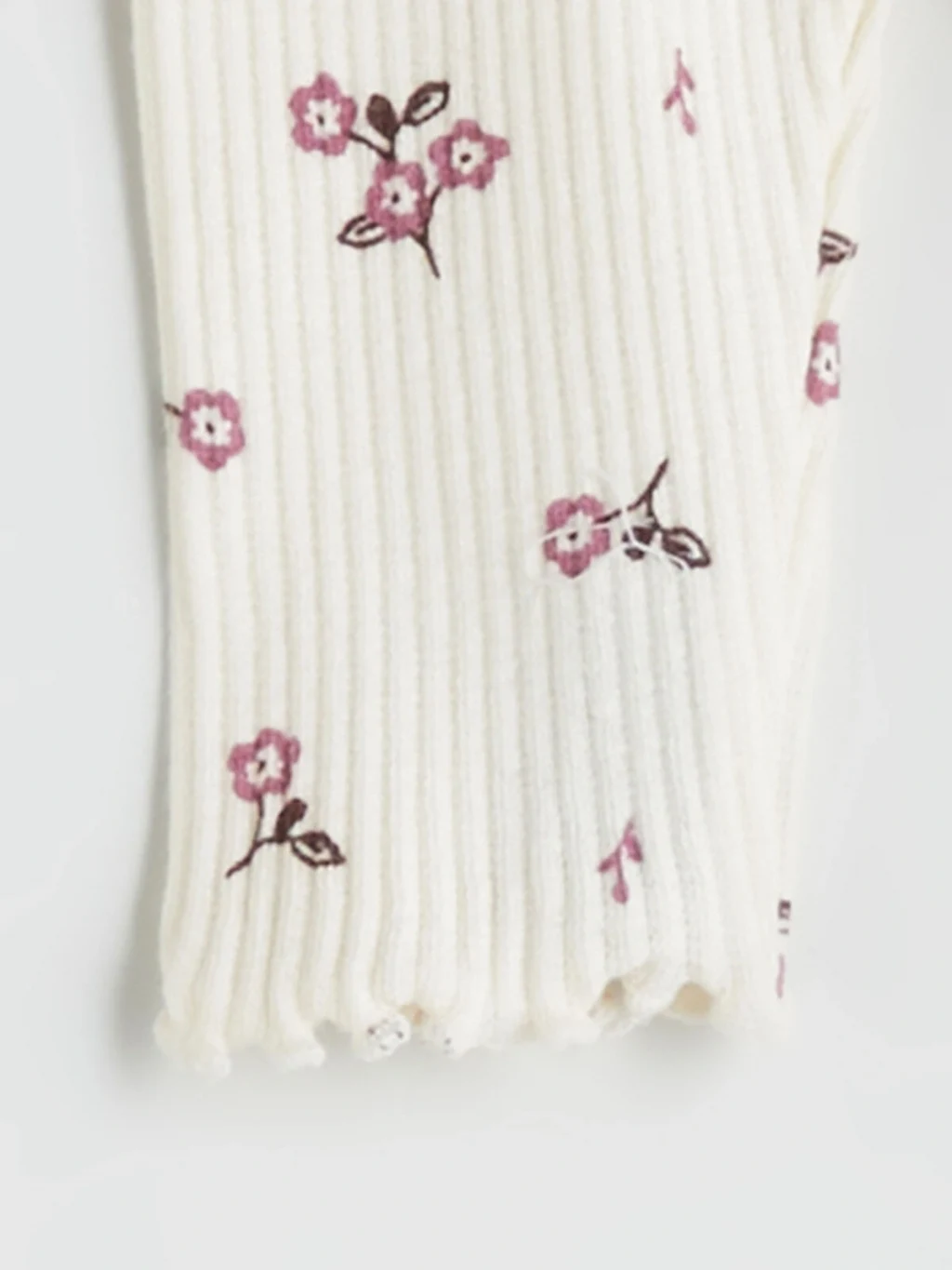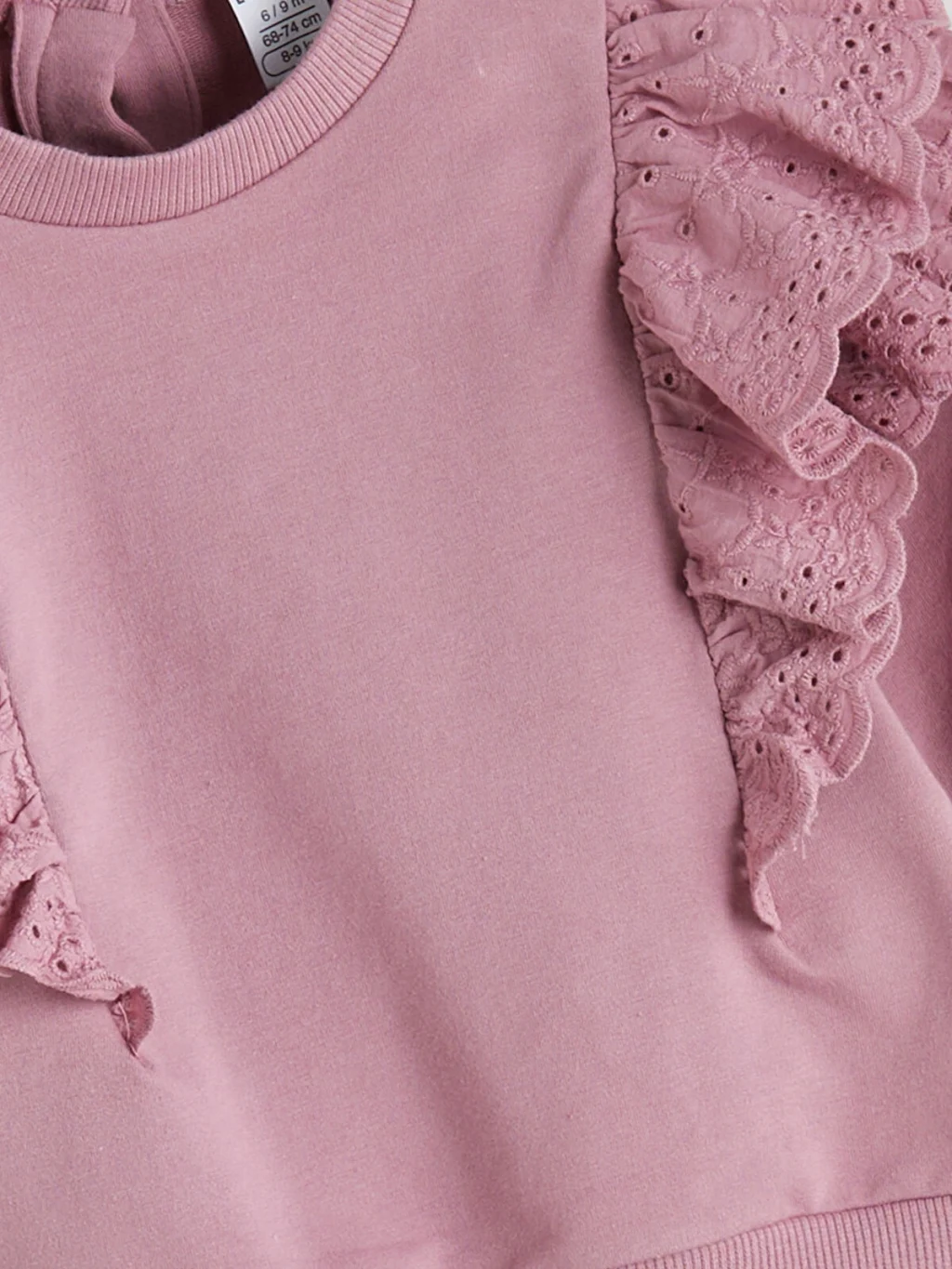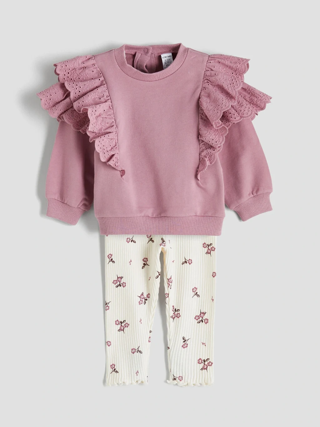 Kız bebek takım; bisiklet yaka, uzun kollu, omuzları brode detaylı fırfırlı sweatshirt ve çiçek desenli fitilli tayttan oluşur. Sırtı düğme kapamalıdır.