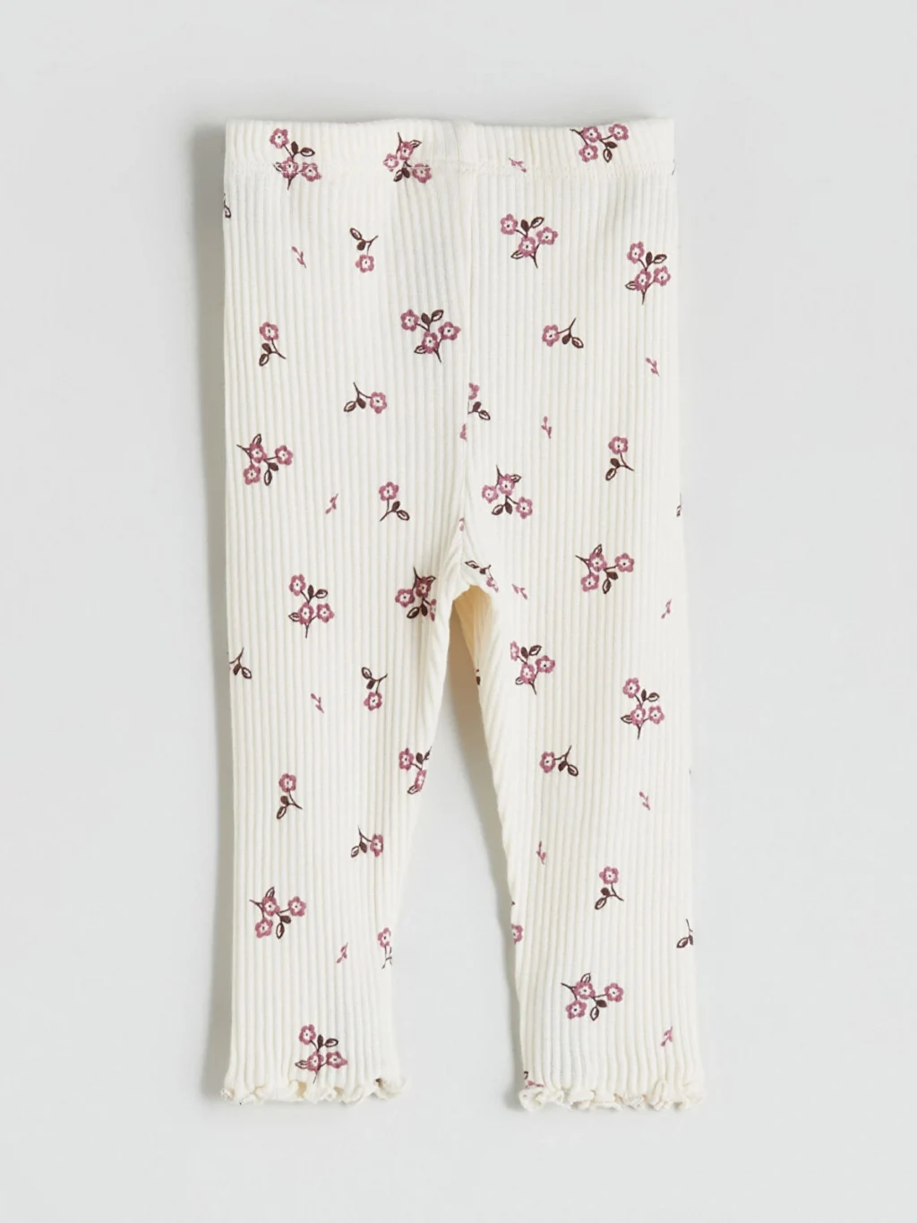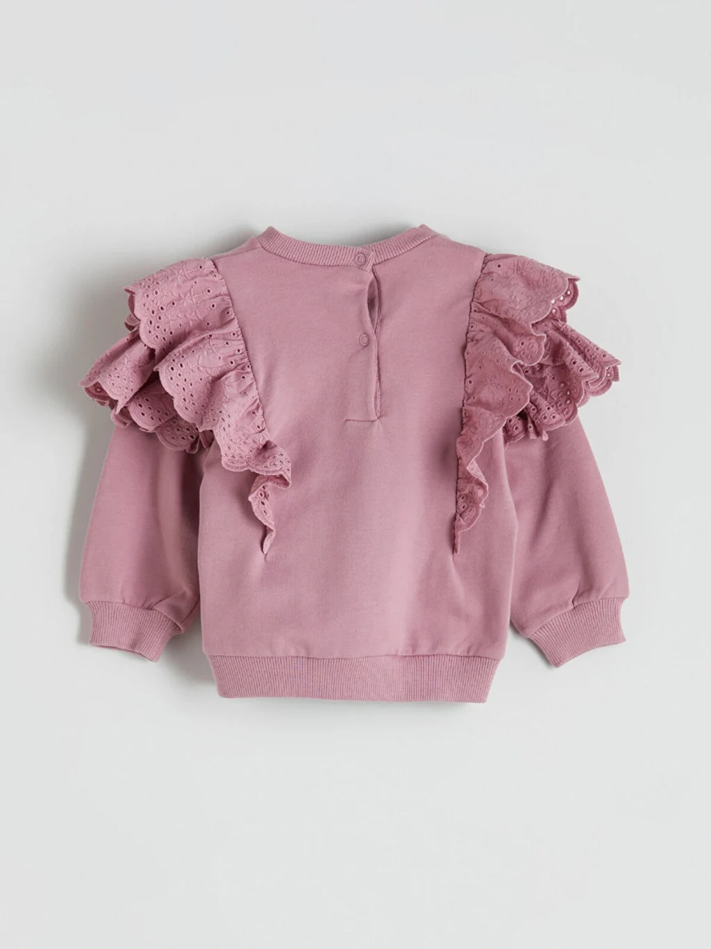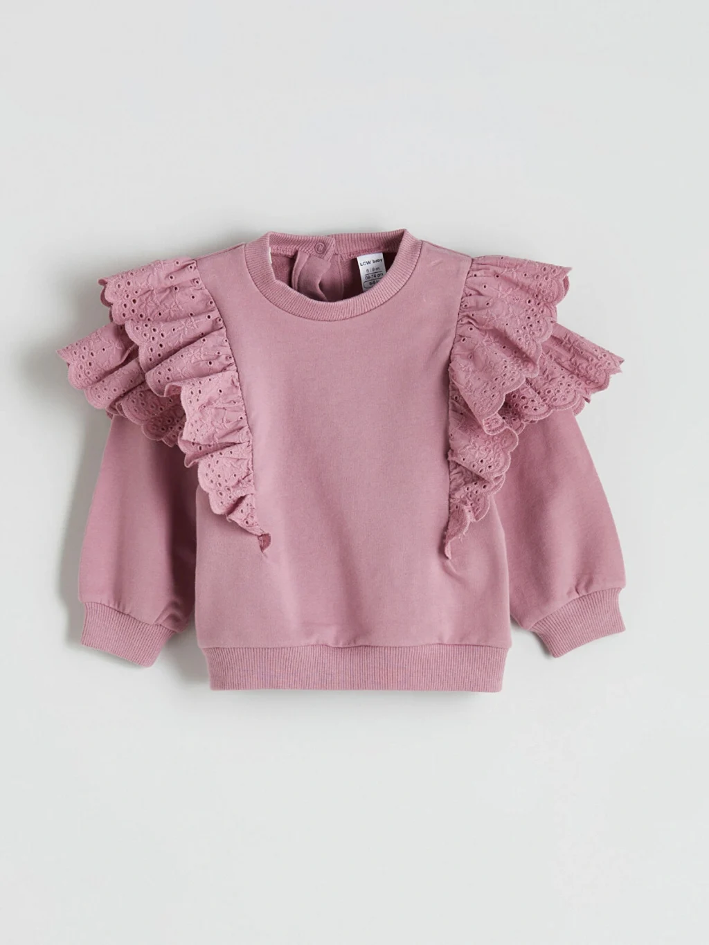 Kız bebek takım; bisiklet yaka, uzun kollu, omuzları brode detaylı fırfırlı sweatshirt ve çiçek desenli fitilli tayttan oluşur. Sırtı düğme kapamalıdır.