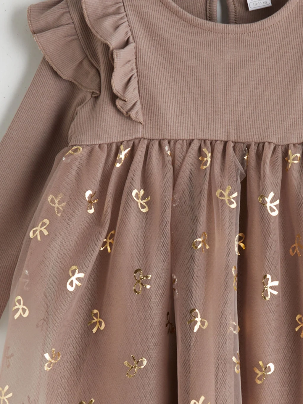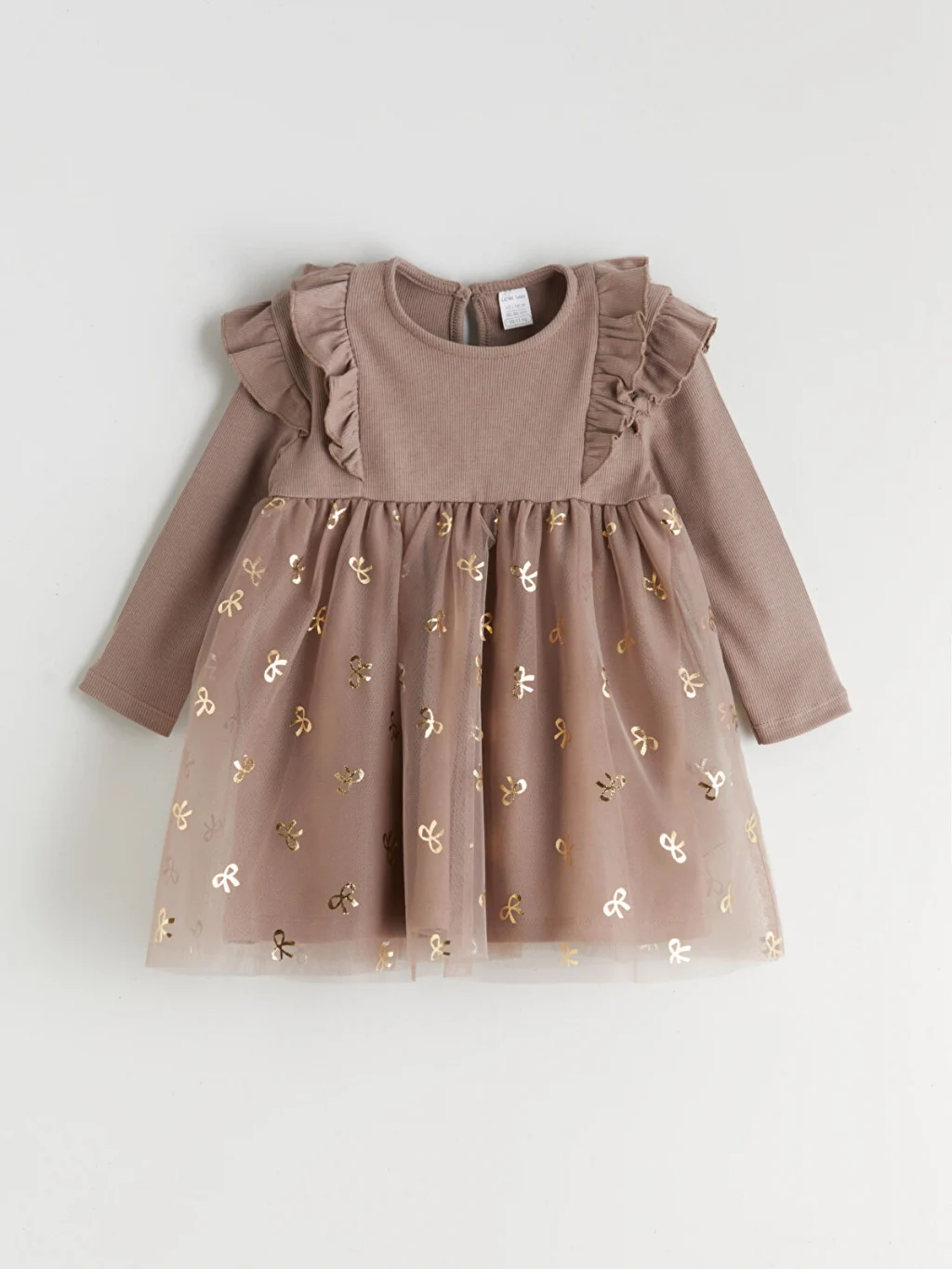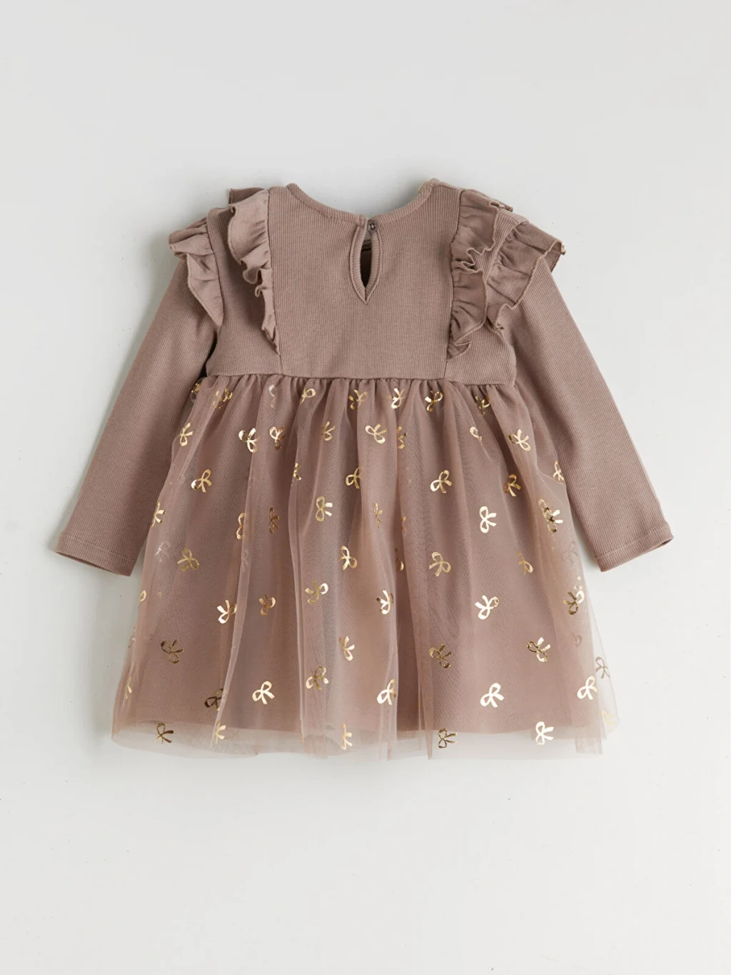Bisiklet yaka ve uzun kollu kız bebek elbise, omuzları fırfır detaylıdır. Ensesi düğme kapamalı olup, etek kısmı simli tül kumaşa sahiptir.