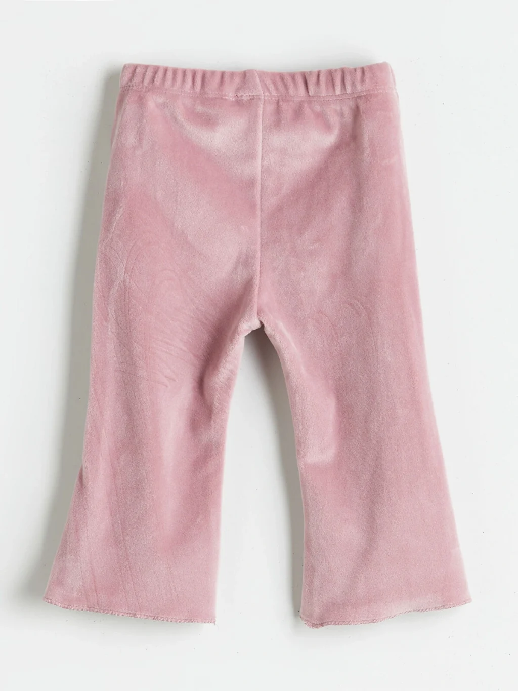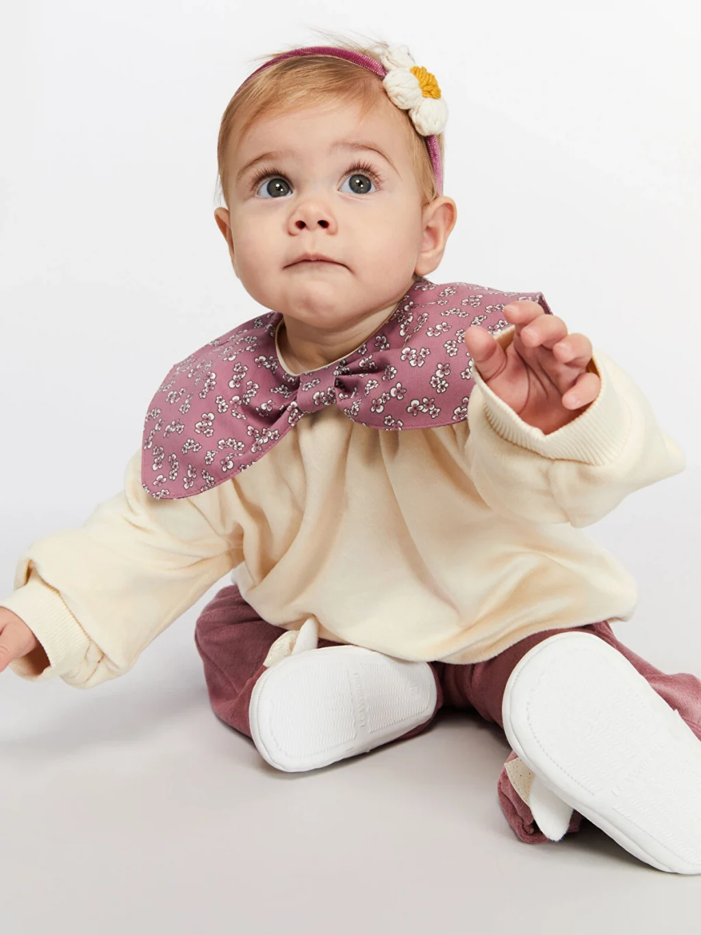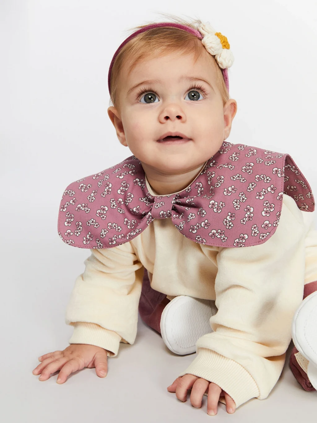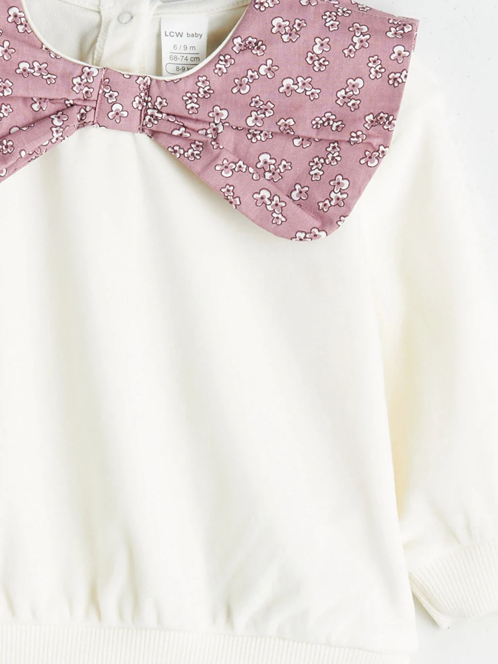 Desenli ve fiyonk detaylı geniş yakalı, uzun kollu kız bebek üst ve paçası genişleyen pantolondan oluşan takım, enseden düğme kapamalıdır.