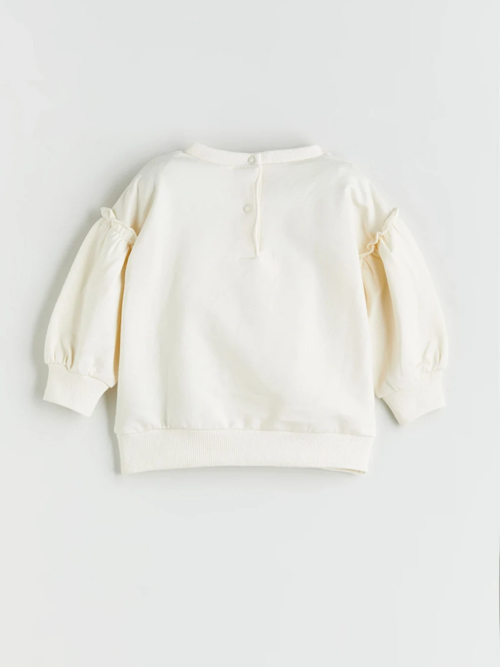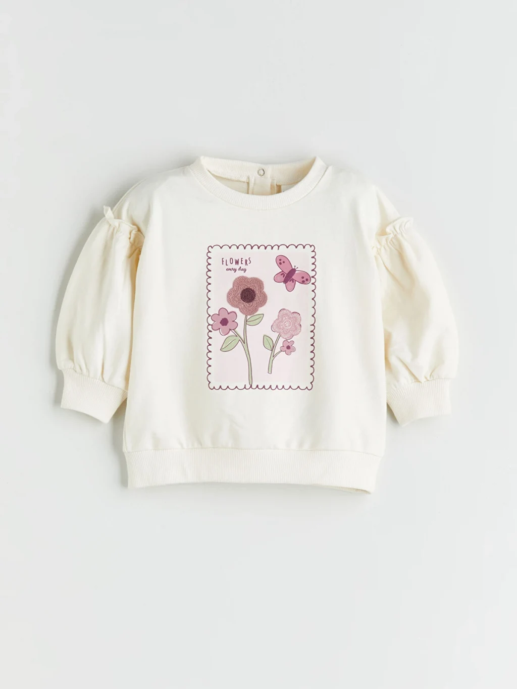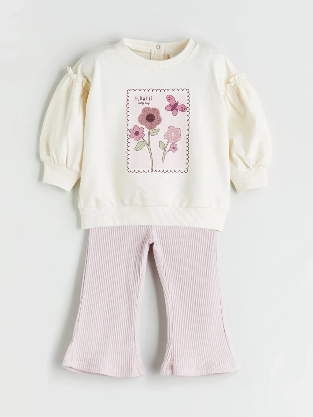 Kız bebek takım; bisiklet yaka, arkadan düğme kapamalı, omuzları büzgülü ve çiçek baskılı sweatshirt ile fitilli ispanyol paça tayttan oluşur.