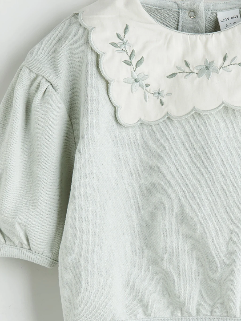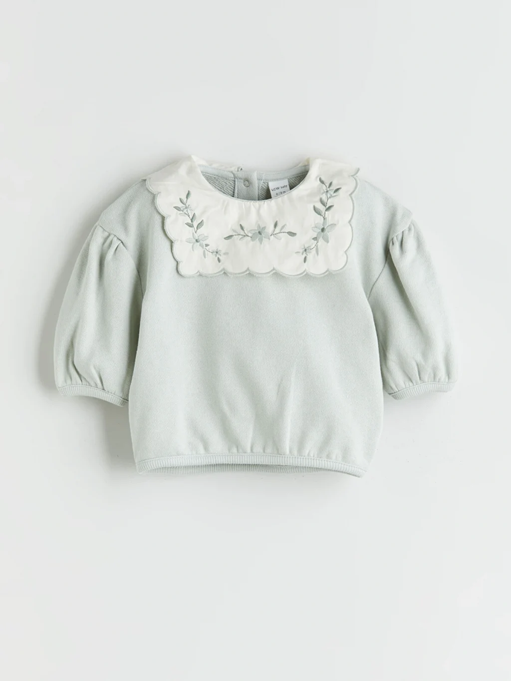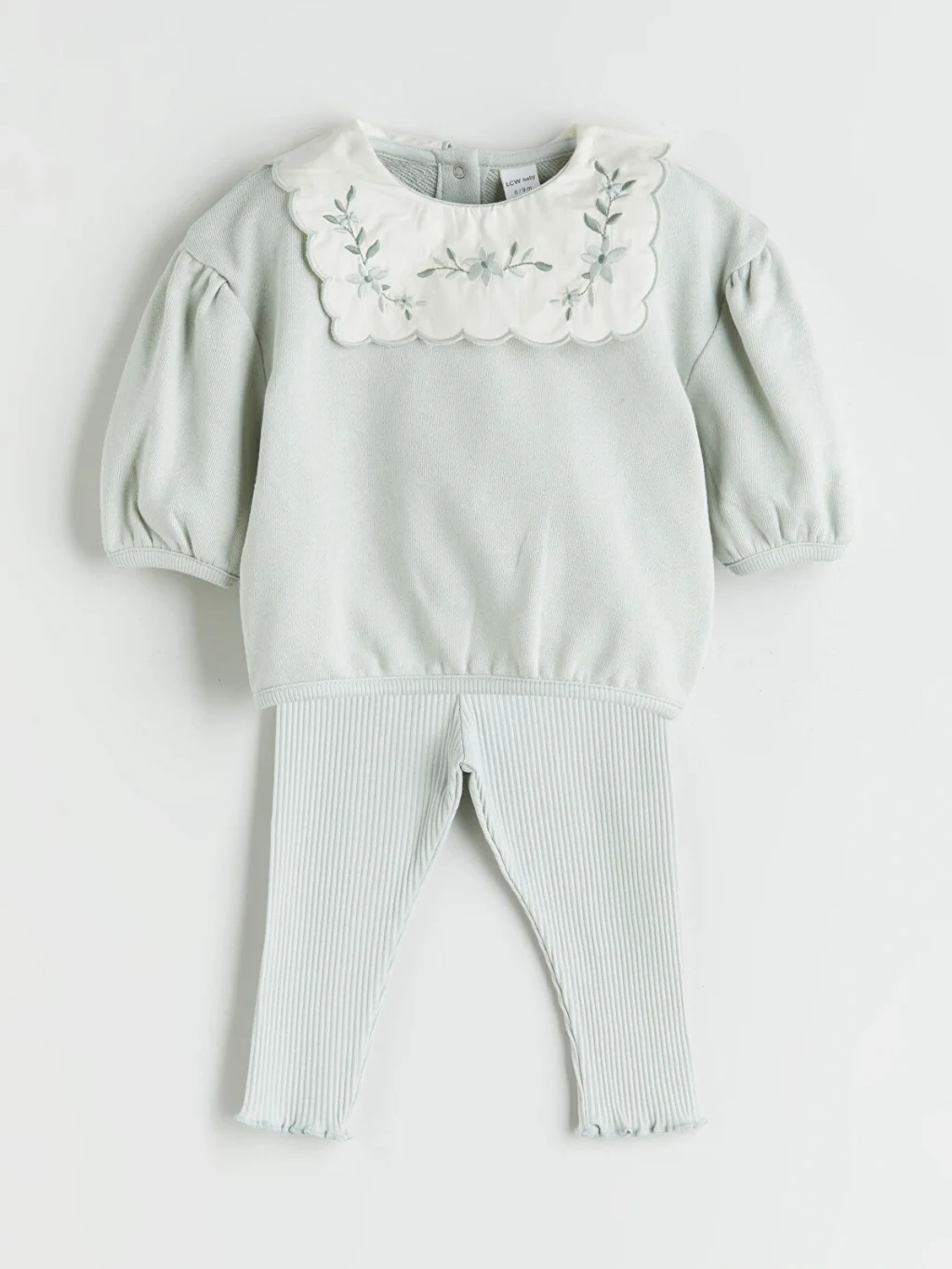 Çiçek nakışlı bebe yakalı, balon kollu ve arkadan düğme kapamalı sweatshirt ile paçaları fırfırlı, fitilli tayttan oluşan kız bebek takımı.