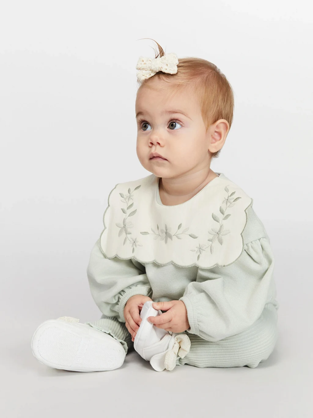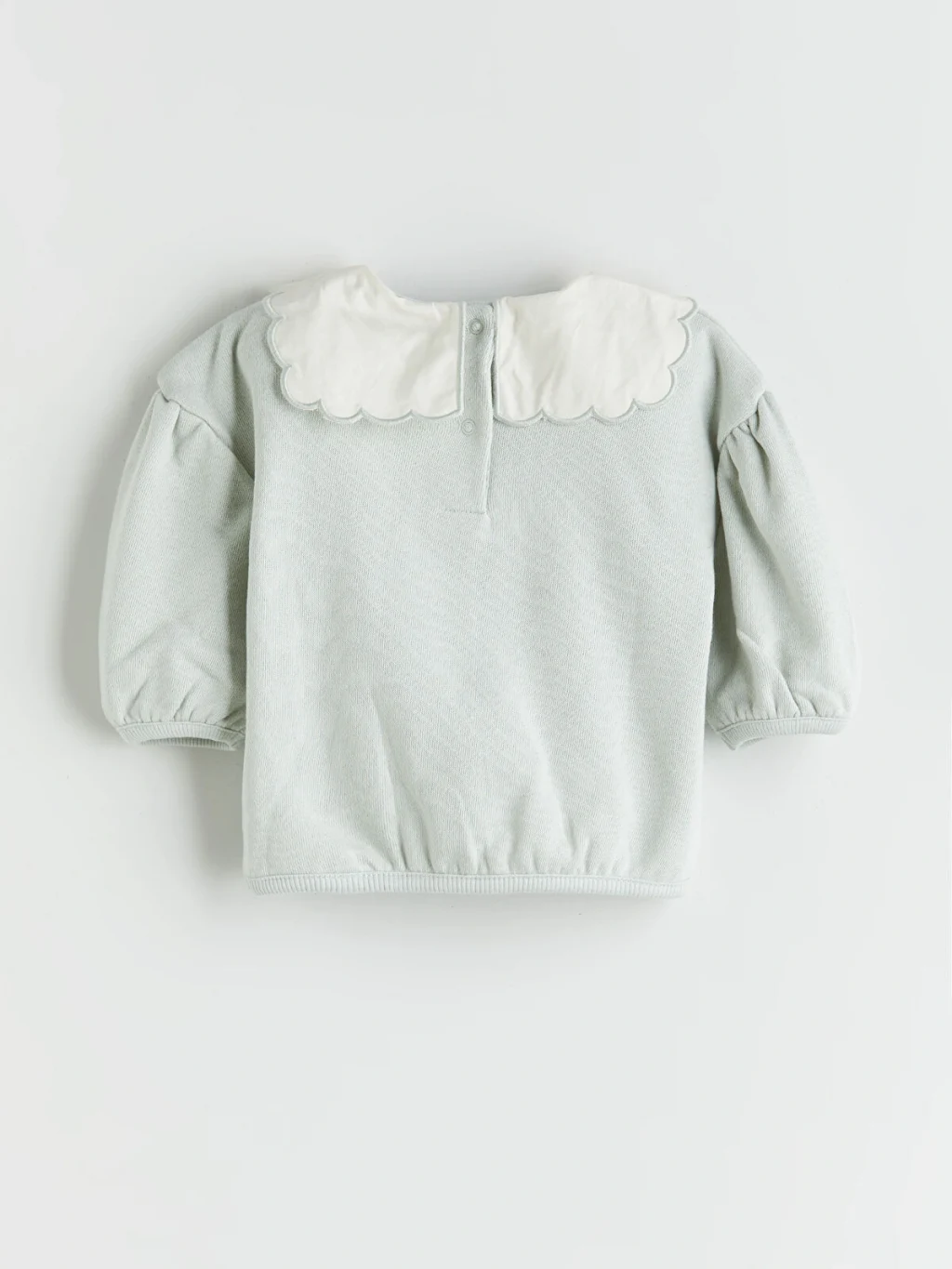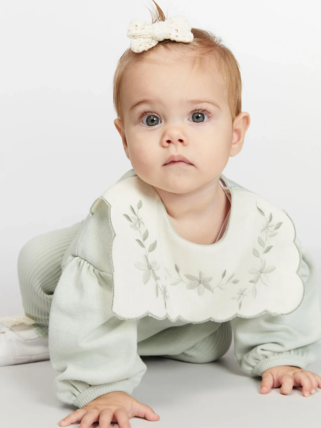 Çiçek nakışlı bebe yakalı, balon kollu ve arkadan düğme kapamalı sweatshirt ile paçaları fırfırlı, fitilli tayttan oluşan kız bebek takımı.