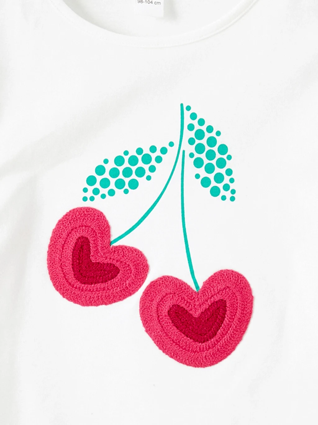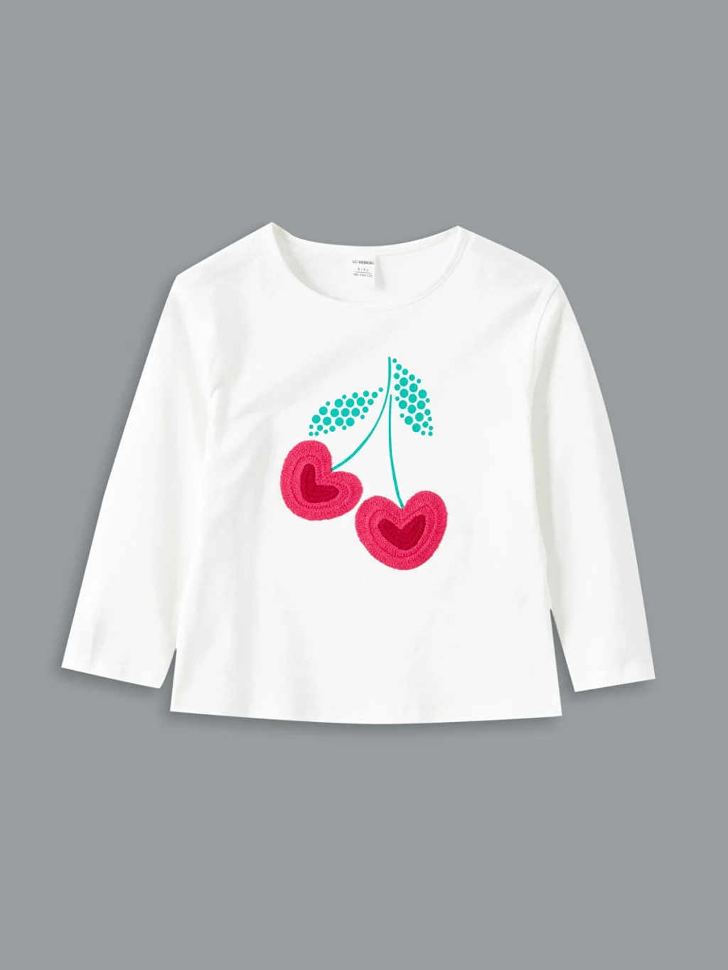 Kız çocuk tişört, %100 pamuklu penye kumaştan üretilmiştir. Bisiklet yakalı, uzun kollu ve önü kiraz baskılıdır.